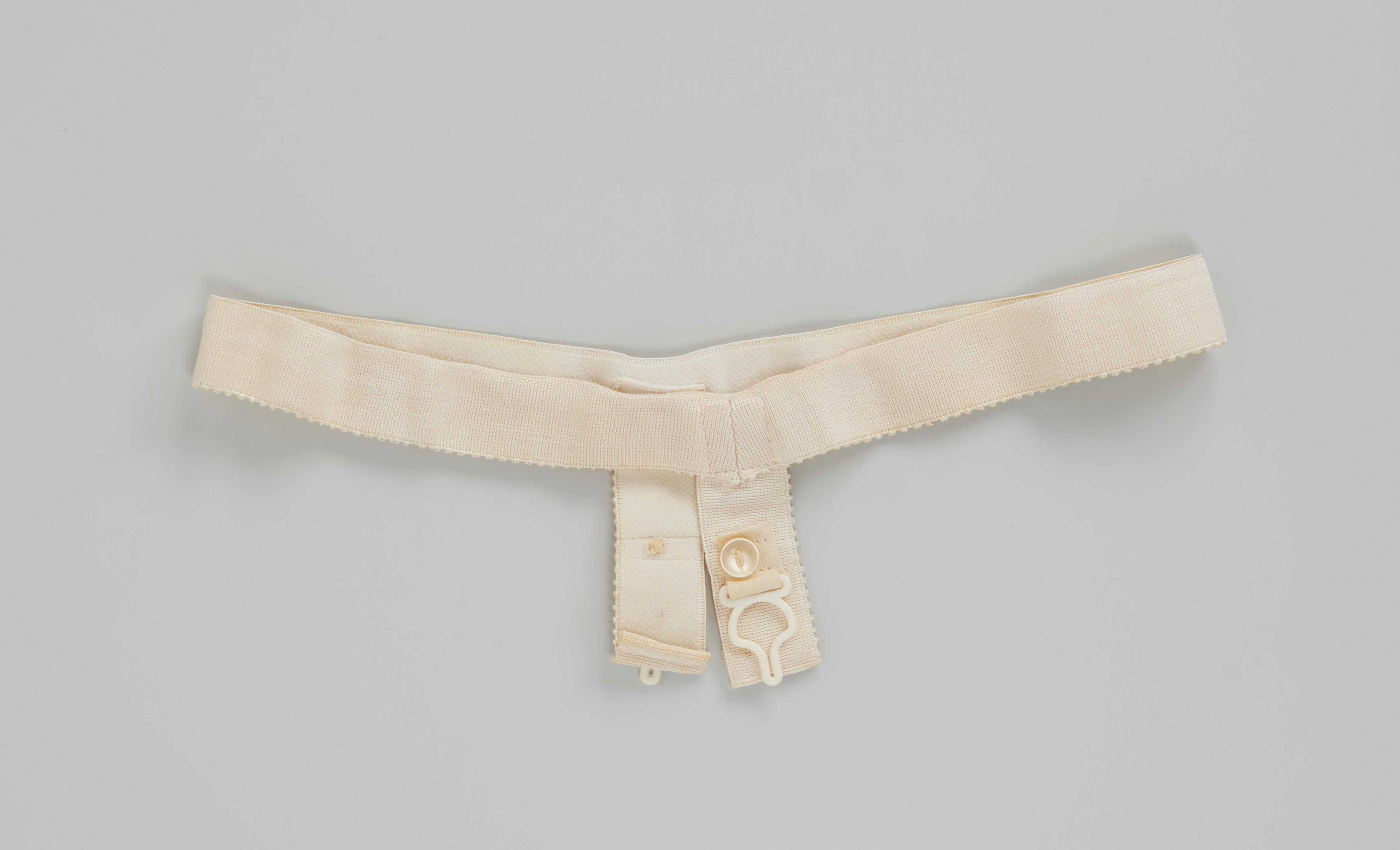 Gordel met een dubbele bevestigingsmogelijkheid, zowel voor wasbaar maandverband met een knoopsgat als voor wegwerpverband. Dit verband van lagen cellulose was omhuld met een 'net' dat aan beide kanten langer was dan de lagen cellulose. Zo kon er een knoop ingelegd worden die in de jarretelhaak werd gehaakt. De gebruikster van dit gordeltje werd op ...