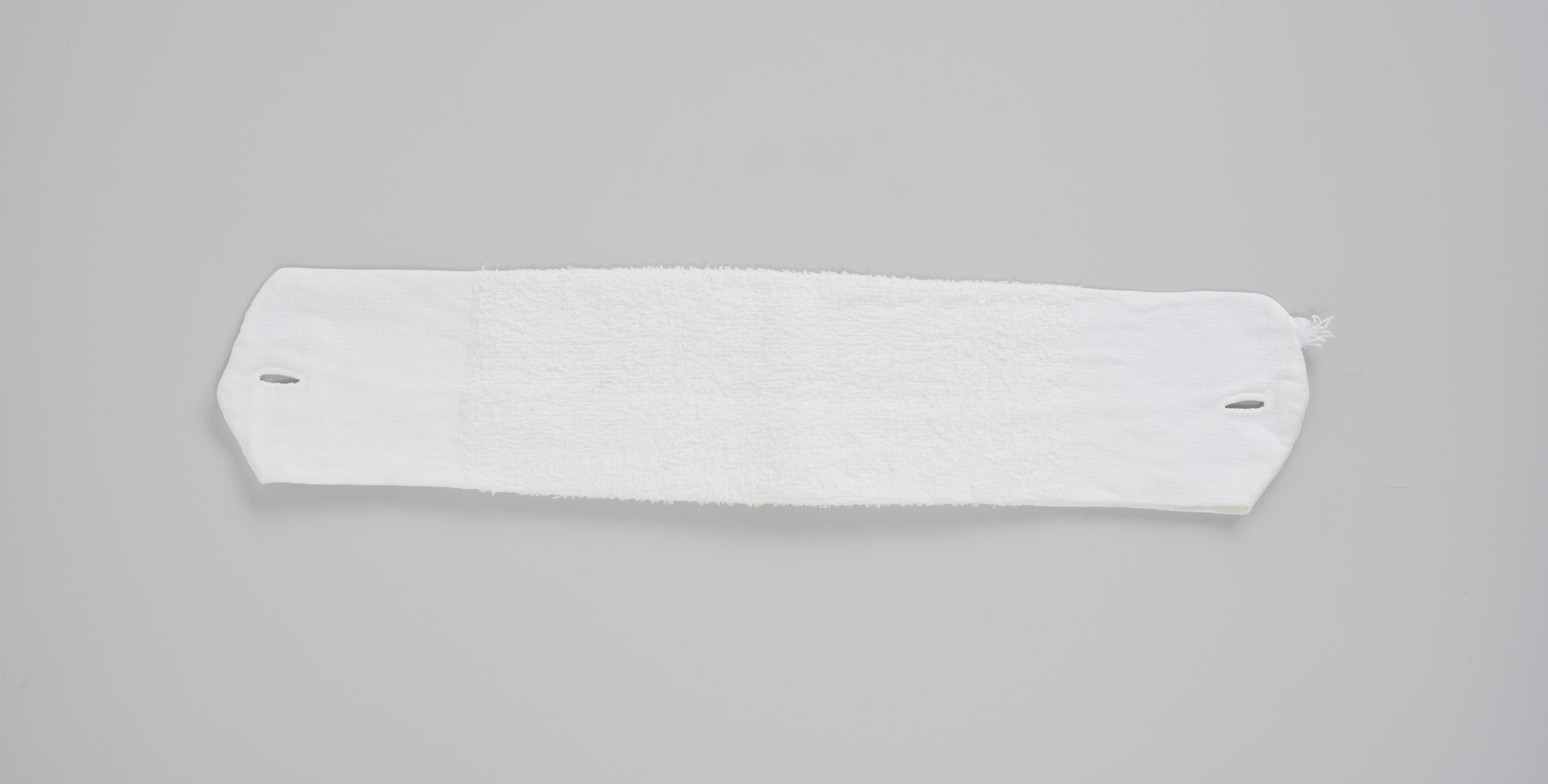 Langwerpig wasbaar maandverband van badstof, met uiteinden van katoen waarin een knoopsgat is aangebracht. Het wasbare maandverband kon zo aan een gordel van elastiek vastgemaakt worden. De gebruikster van dit wasbare maandverband werd in 1965 voor het eerst ongesteld. Voor haar lagen het gordeltje, de wasbare maandverbanden en een plastic broekje klaar. Zij heeft dit ...