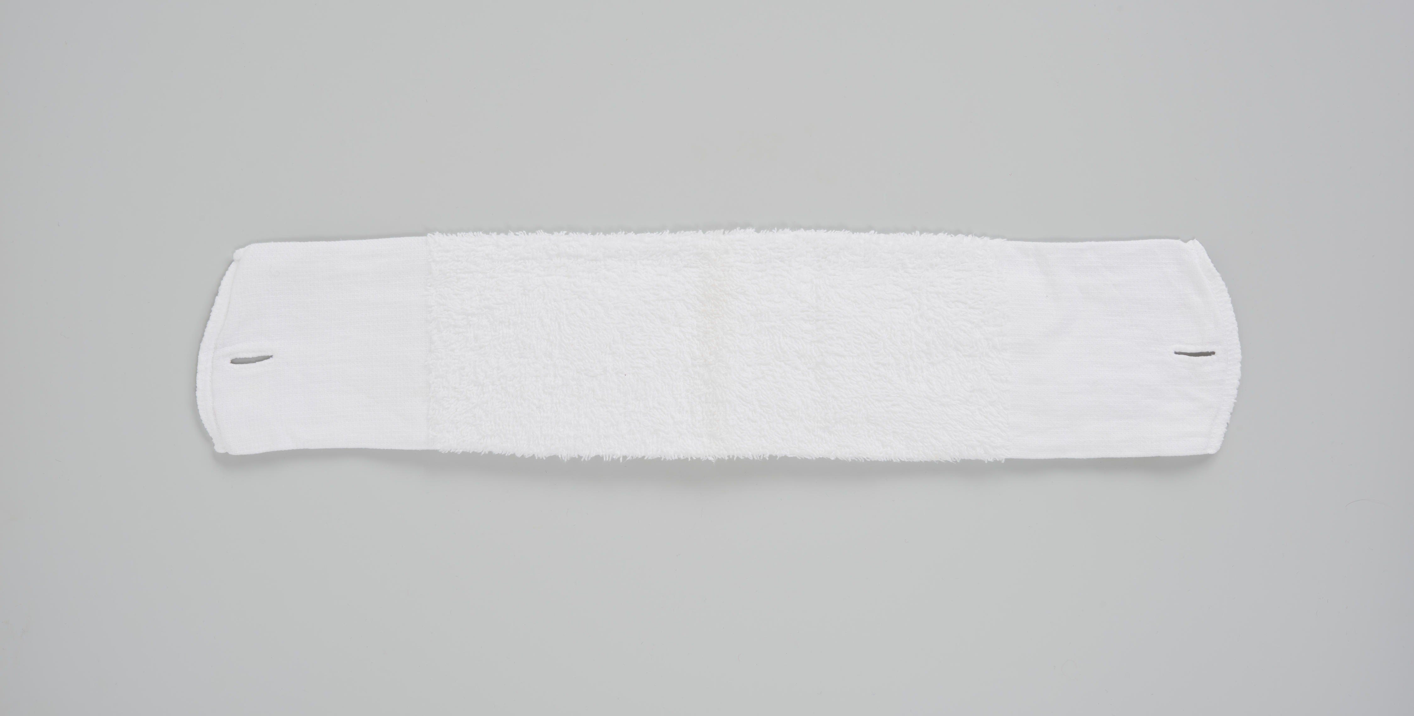 Langwerpig wasbaar maandverband van badstof, met uiteinden van katoen waarin een knoopsgat is aangebracht. Het wasbare maandverband kon zo aan een gordel van elastiek vastgemaakt worden. De gebruikster van dit wasbare maandverband werd in 1965 voor het eerst ongesteld. Voor haar lagen het gordeltje, de wasbare maandverbanden en een plastic broekje klaar. Zij heeft dit ...