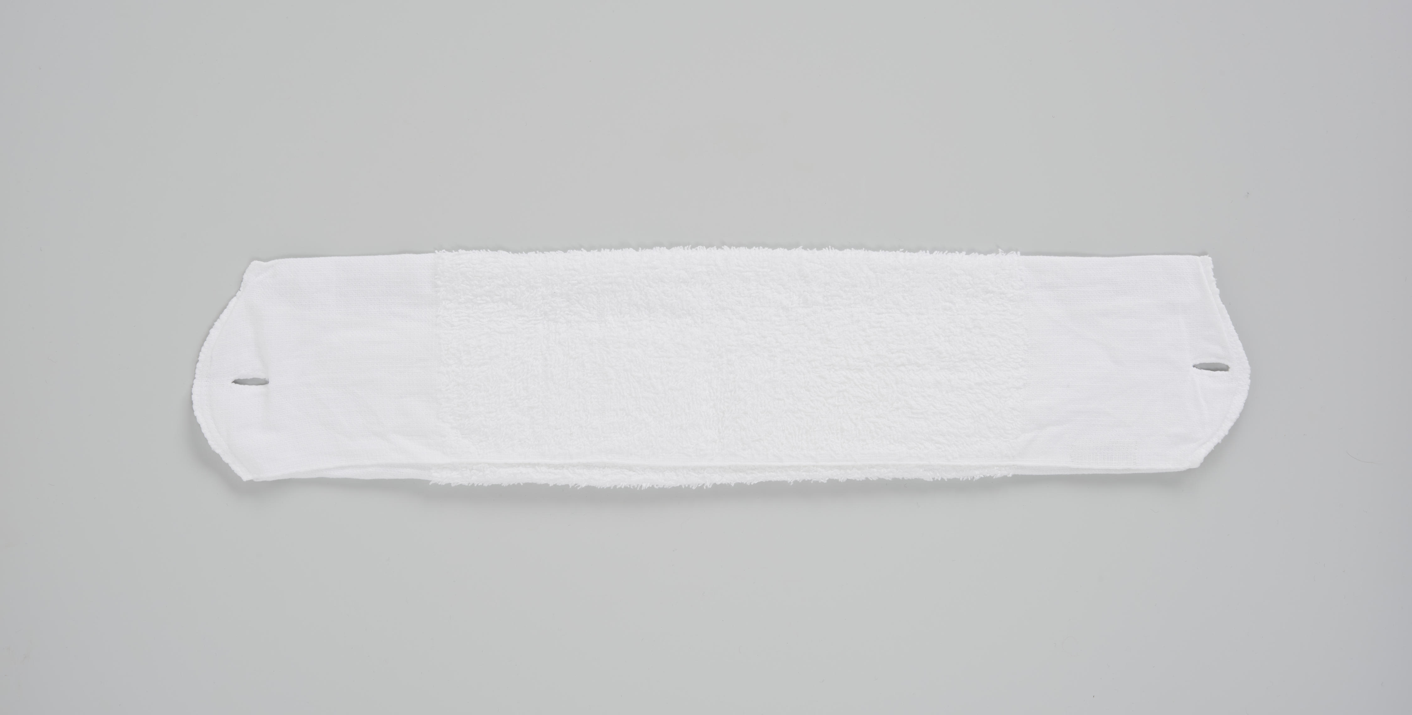 Langwerpig wasbaar maandverband van badstof, met uiteinden van katoen waarin een knoopsgat is aangebracht. Het wasbare maandverband kon zo aan een gordel van elastiek vastgemaakt worden. De gebruikster van dit wasbare maandverband werd in 1965 voor het eerst ongesteld. Voor haar lagen het gordeltje, de wasbare maandverbanden en een plastic broekje klaar. Zij heeft dit ...