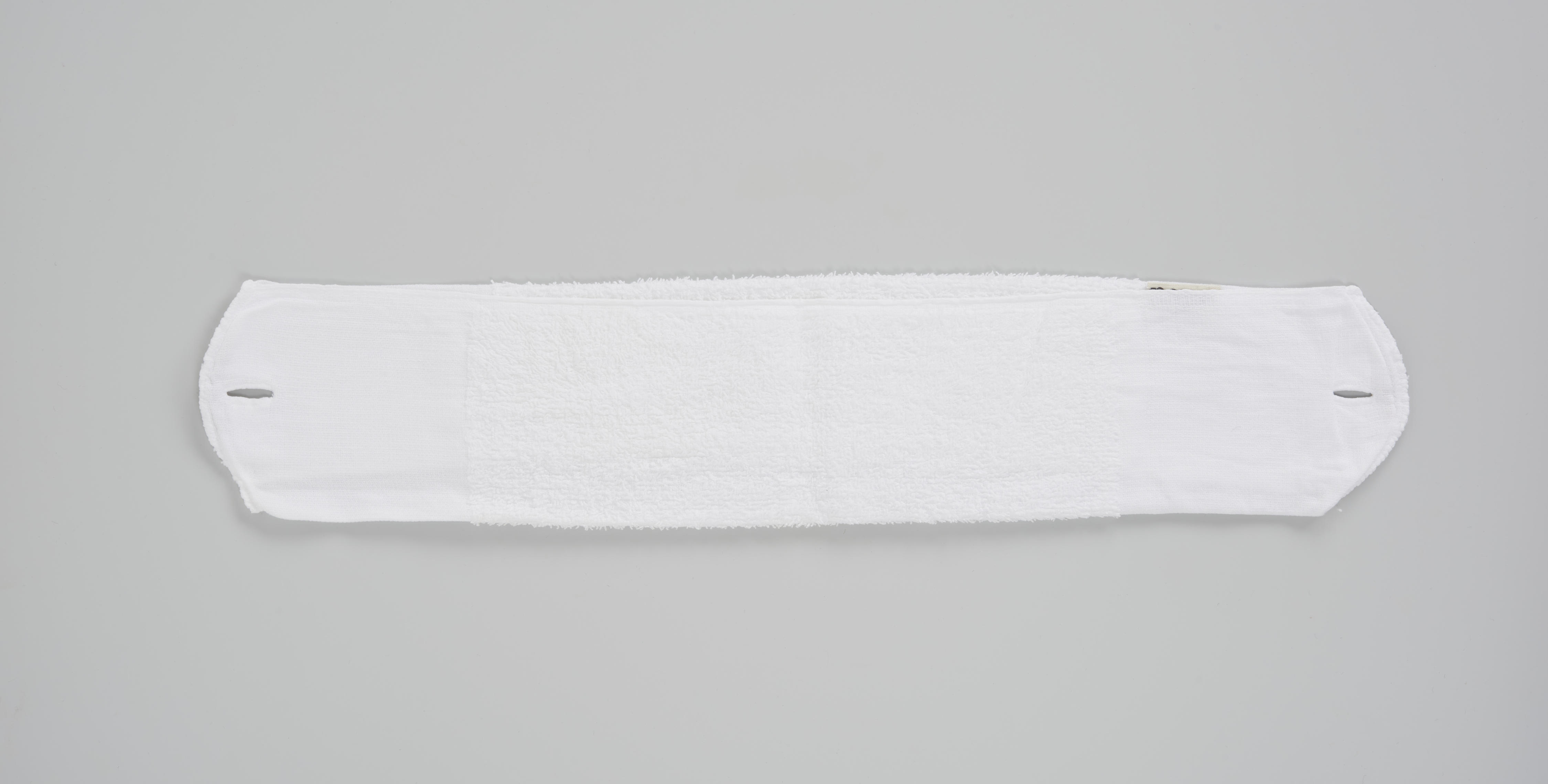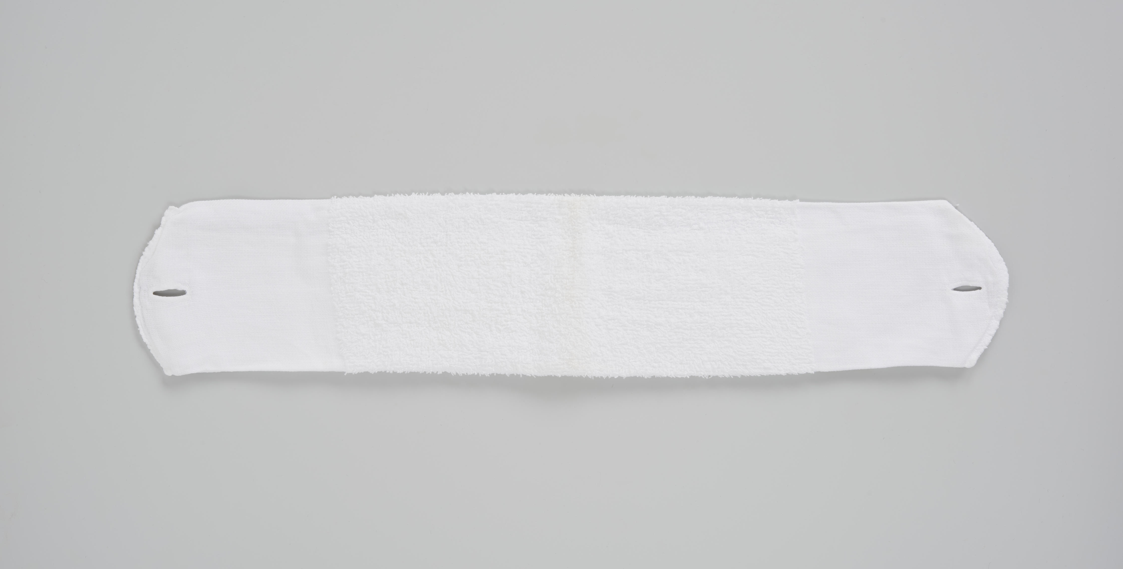 Langwerpig wasbaar maandverband van badstof, met uiteinden van katoen waarin een knoopsgat is aangebracht. Het wasbare maandverband kon zo aan een gordel van elastiek vastgemaakt worden. De gebruikster van dit wasbare maandverband werd in 1965 voor het eerst ongesteld. Voor haar lagen het gordeltje, de wasbare maandverbanden en een plastic broekje klaar. Zij heeft dit ...