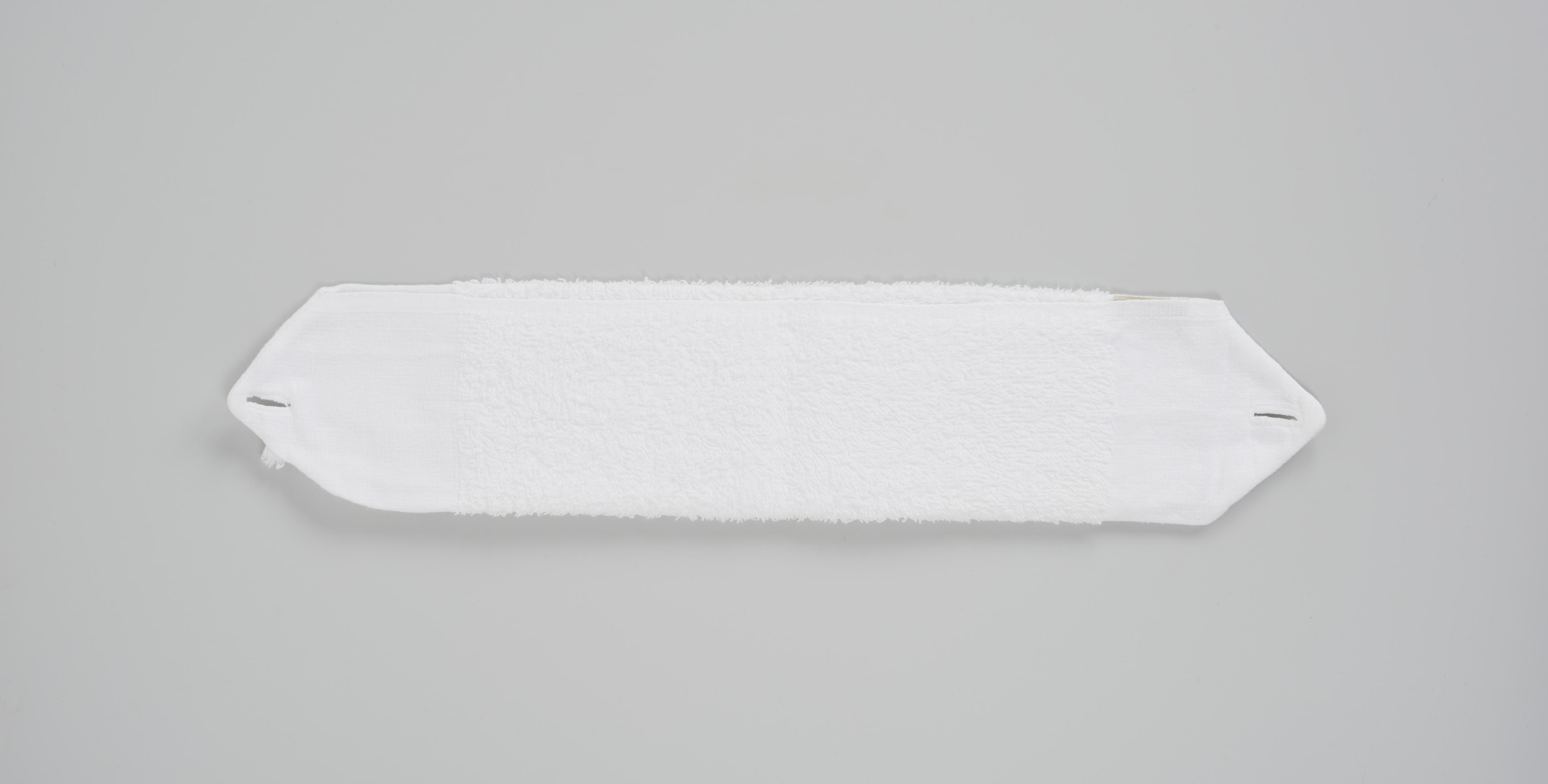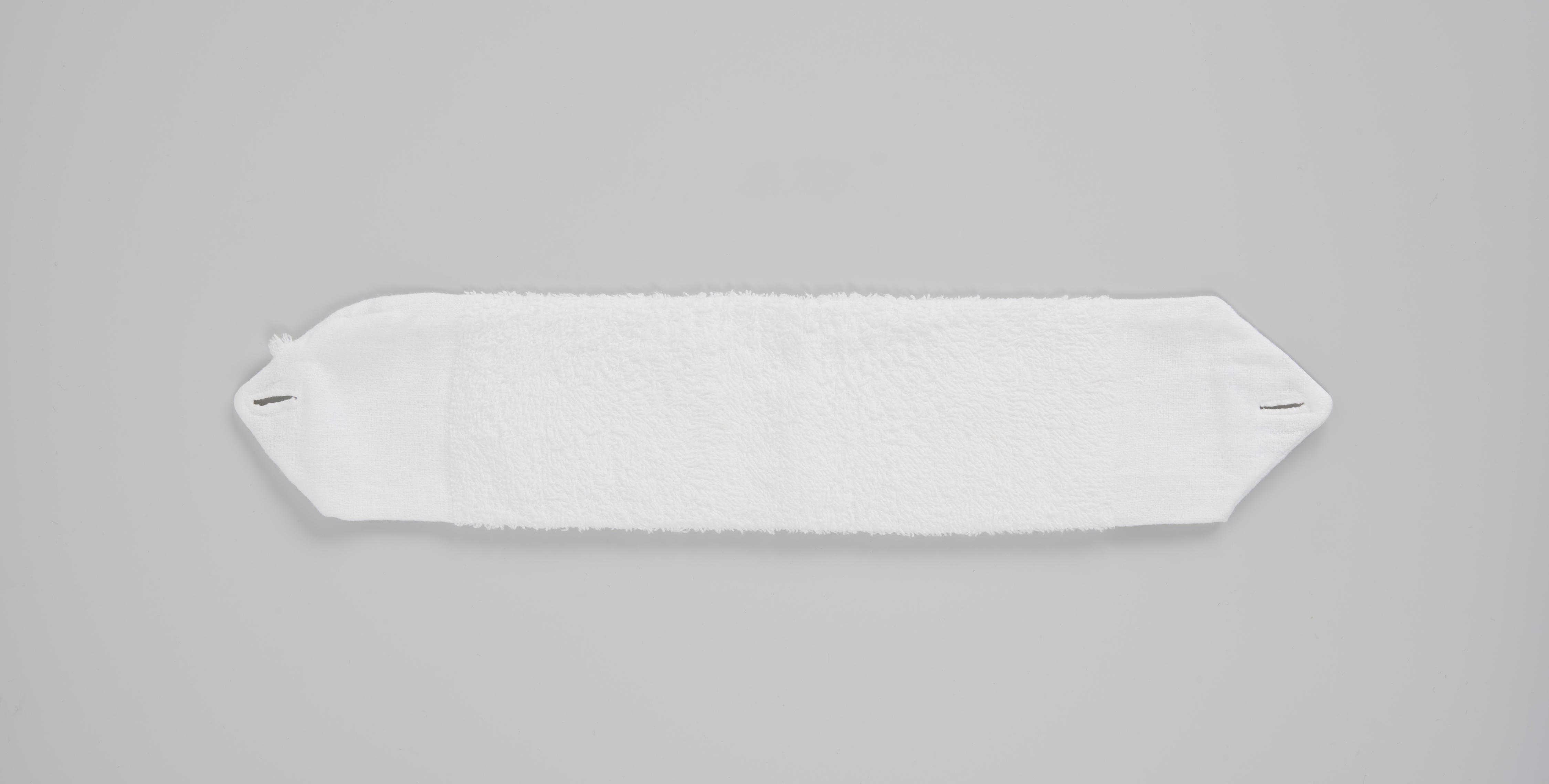 Langwerpig wasbaar maandverband van badstof, met uiteinden van katoen waarin een knoopsgat is aangebracht. Het wasbare maandverband kon zo aan een gordel van elastiek vastgemaakt worden. De gebruikster van dit wasbare maandverband werd in 1965 voor het eerst ongesteld. Voor haar lagen het gordeltje, de wasbare maandverbanden en een plastic broekje klaar. Zij heeft dit ...