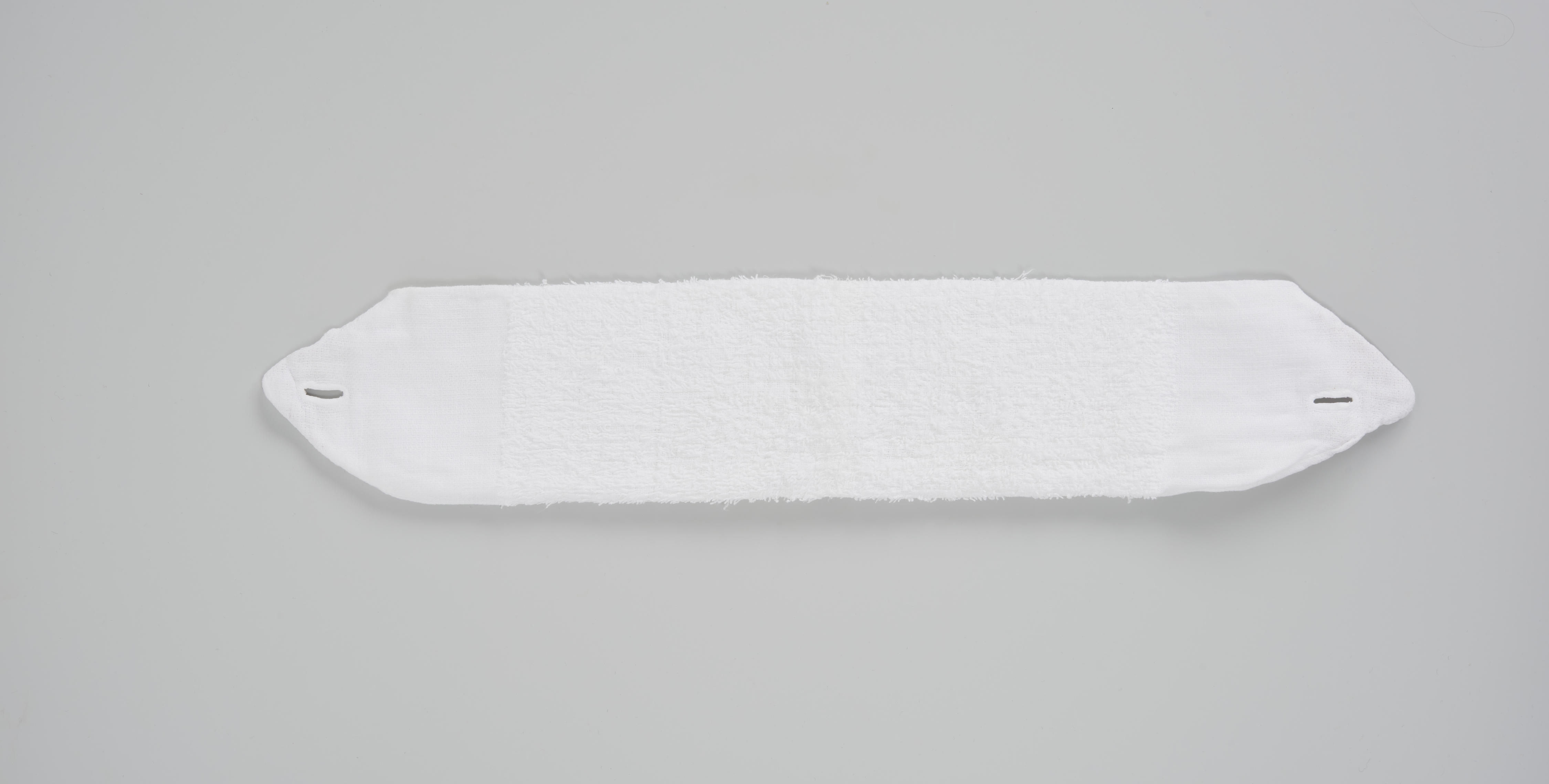 Langwerpig wasbaar maandverband van badstof, met uiteinden van katoen waarin een knoopsgat is aangebracht. Het wasbare maandverband kon zo aan een gordel van elastiek vastgemaakt worden. De gebruikster van dit wasbare maandverband werd in 1965 voor het eerst ongesteld. Voor haar lagen het gordeltje, de wasbare maandverbanden en een plastic broekje klaar. Zij heeft dit ...