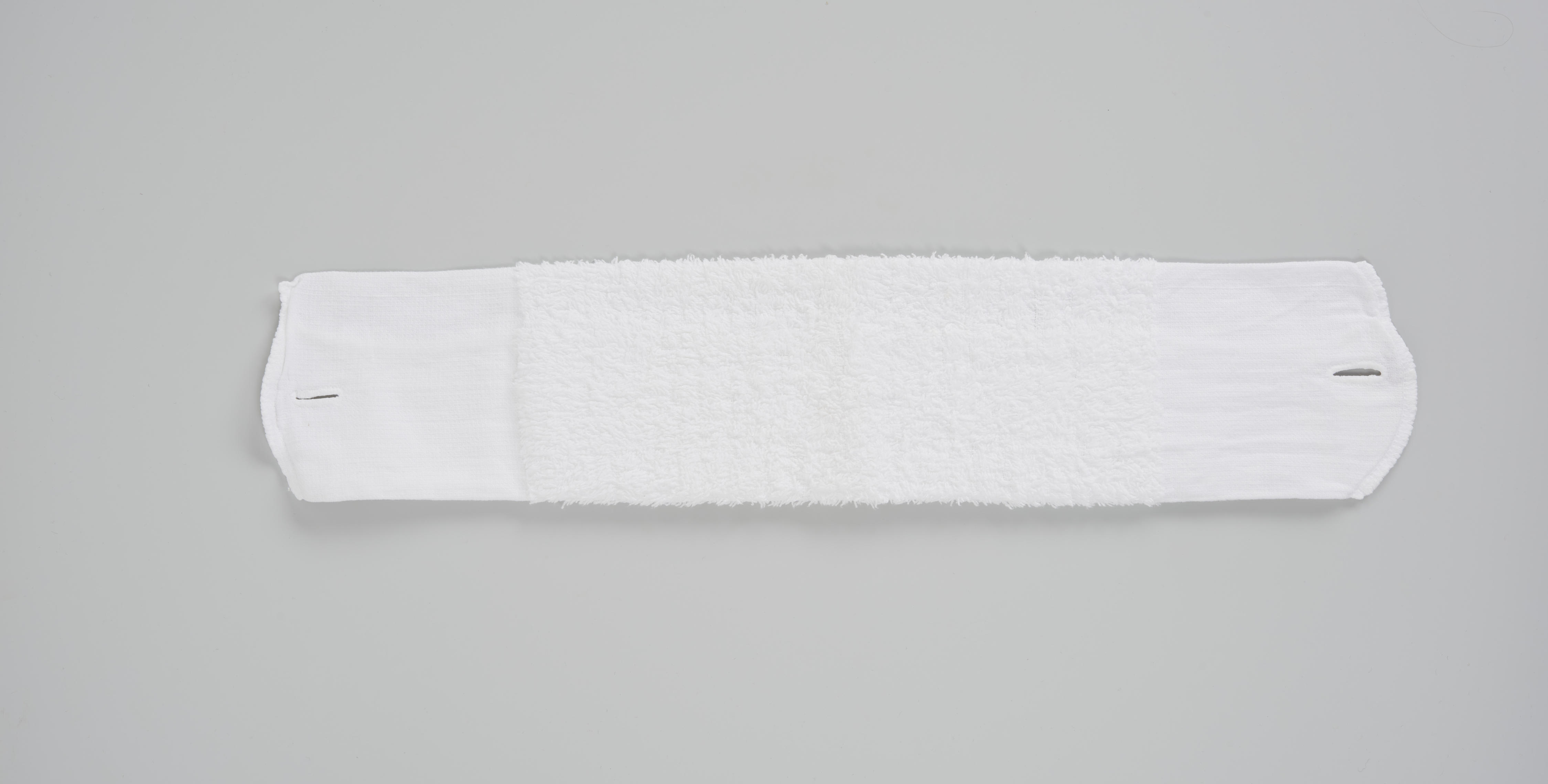 Langwerpig wasbaar maandverband van badstof, met uiteinden van katoen waarin een knoopsgat is aangebracht. Het wasbare maandverband kon zo aan een gordel van elastiek vastgemaakt worden. De gebruikster van dit wasbare maandverband werd in 1965 voor het eerst ongesteld. Voor haar lagen het gordeltje, de wasbare maandverbanden en een plastic broekje klaar. Zij heeft dit ...