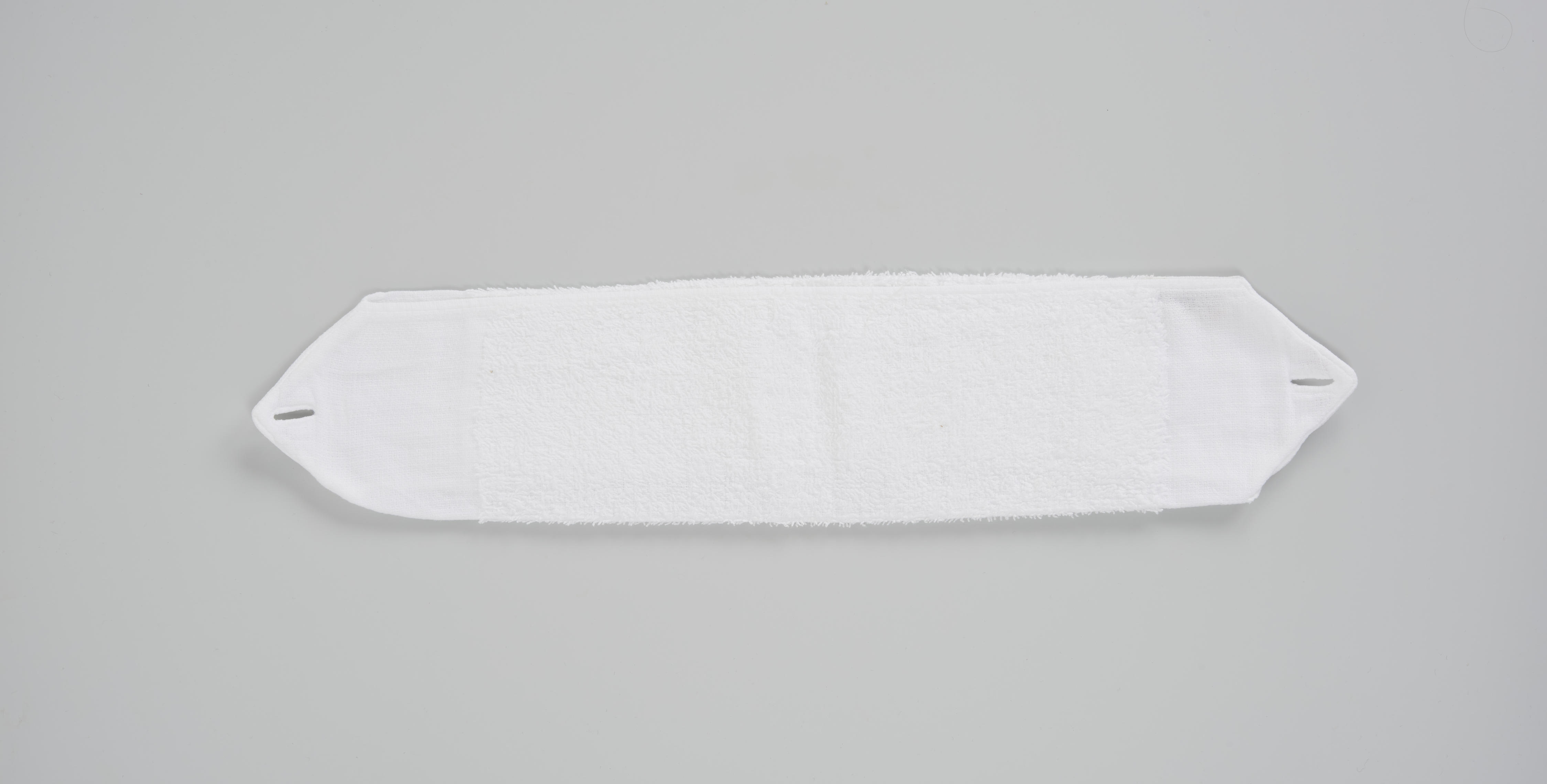 Langwerpig wasbaar maandverband van badstof, met uiteinden van katoen waarin een knoopsgat is aangebracht. Het wasbare maandverband kon zo aan een gordel van elastiek vastgemaakt worden. De gebruikster van dit wasbare maandverband werd in 1965 voor het eerst ongesteld. Voor haar lagen het gordeltje, de wasbare maandverbanden en een plastic broekje klaar. Zij heeft dit ...