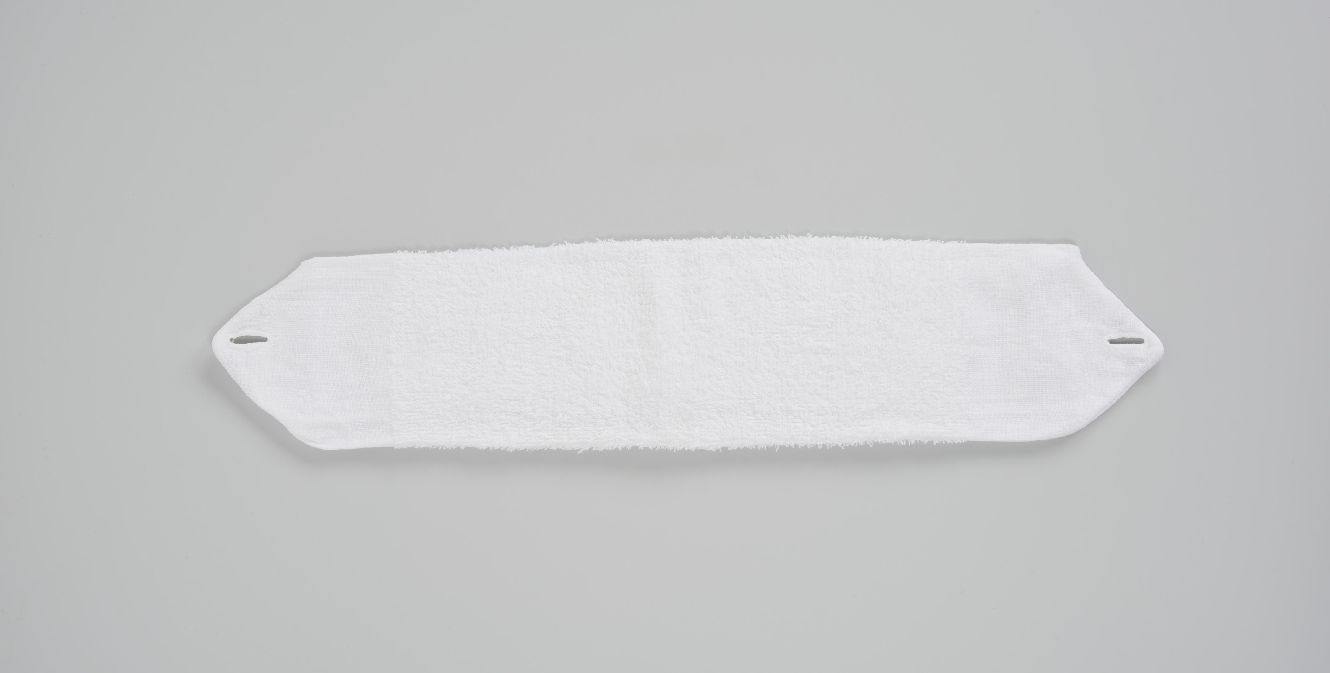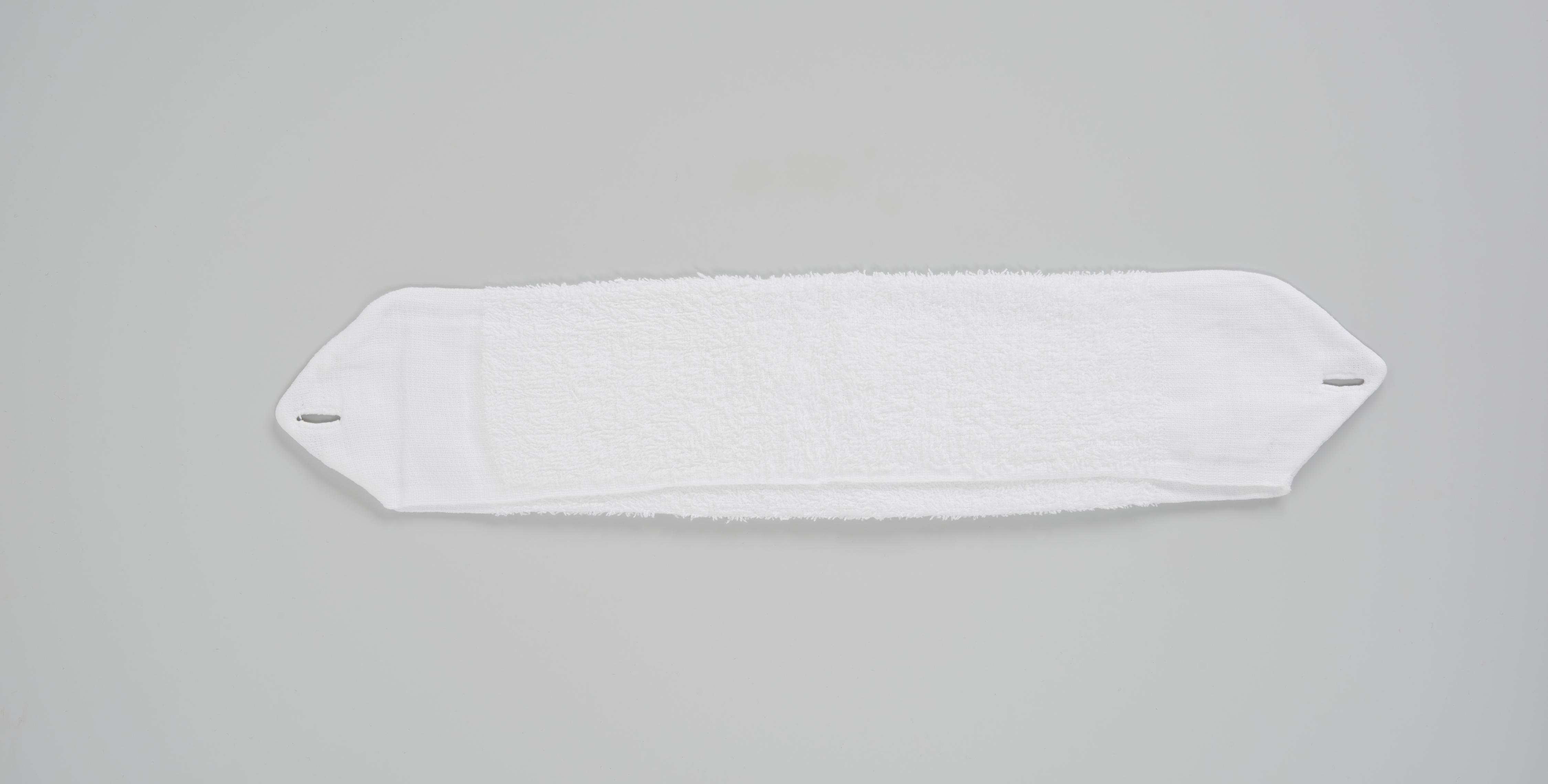 Langwerpig wasbaar maandverband van badstof, met uiteinden van katoen waarin een knoopsgat is aangebracht. Het wasbare maandverband kon zo aan een gordel van elastiek vastgemaakt worden. De gebruikster van dit wasbare maandverband werd in 1965 voor het eerst ongesteld. Voor haar lagen het gordeltje, de wasbare maandverbanden en een plastic broekje klaar. Zij heeft dit ...
