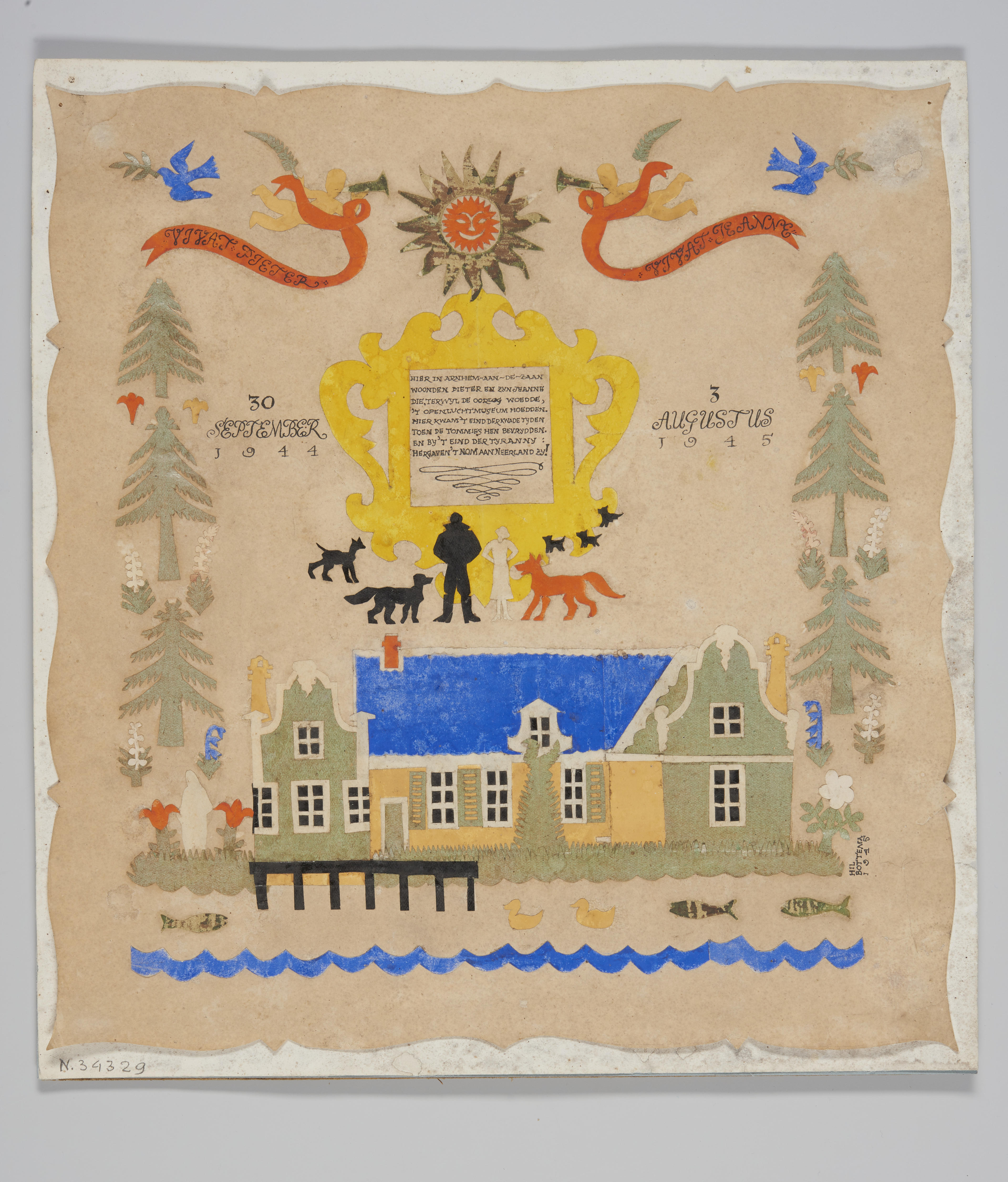 Herinneringsknipsel aan het interim-directeurschap van Pieter Glazema van het Nederlands Openluchtmuseum tijdens de evacuatie in 1944-1945. Centraal staat de Zaanse Buurt in het Nederlandse Openluchtmuseum. Twee faamengelen hebben linten om met de teksten: ’VIVAT PIETER’ en ‘VIVAT JEANNE’. Middenboven in het knipsel is een zon afgebeeld met daaronder een cartouche met de volgende tekst: ‘Hier ...