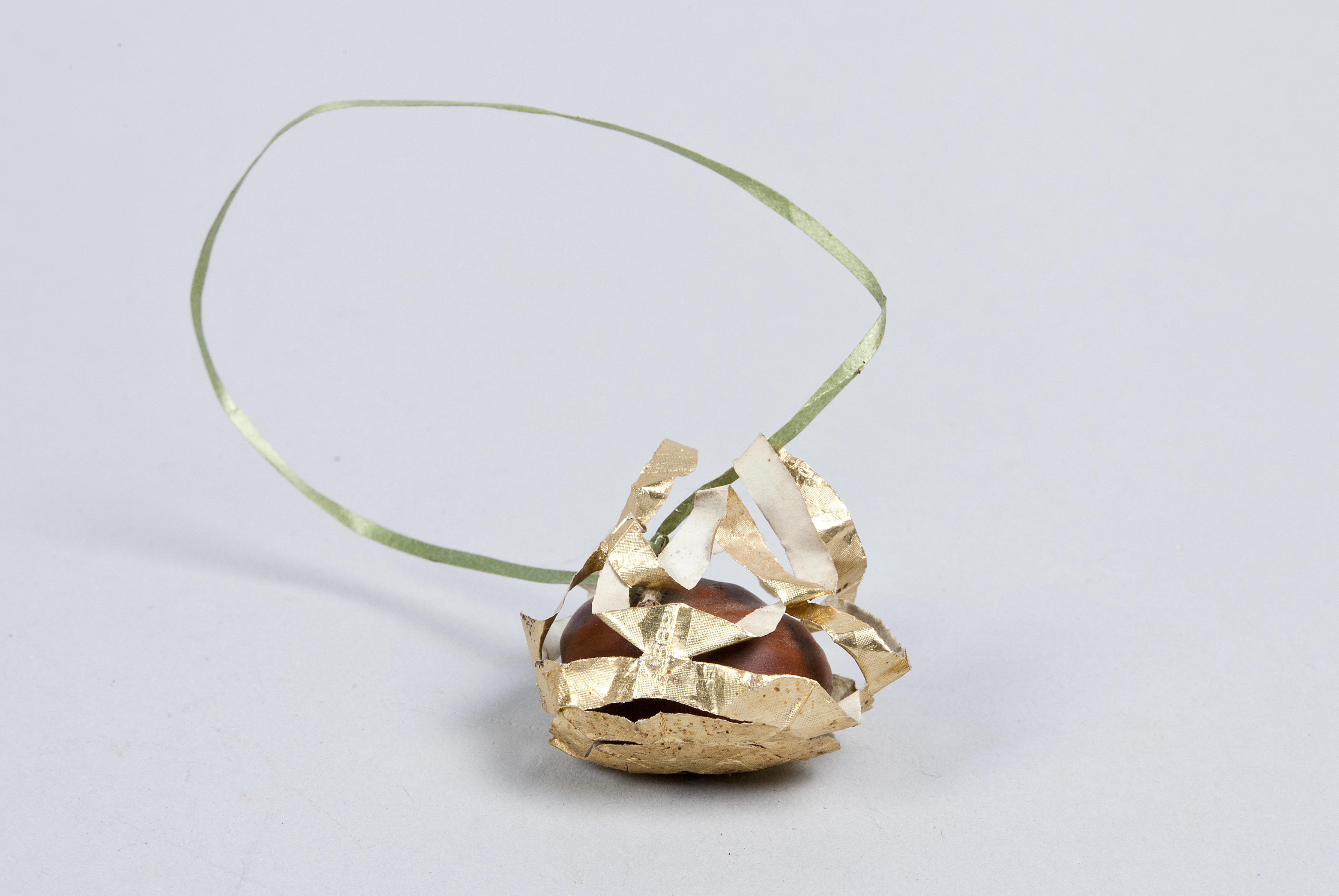 Knipsel van goudkleurig banketbakkerspapier met daarin een kastanje. Het geheel hangt aan een koortje en werd ter versiering in de kerstboom gehangen.