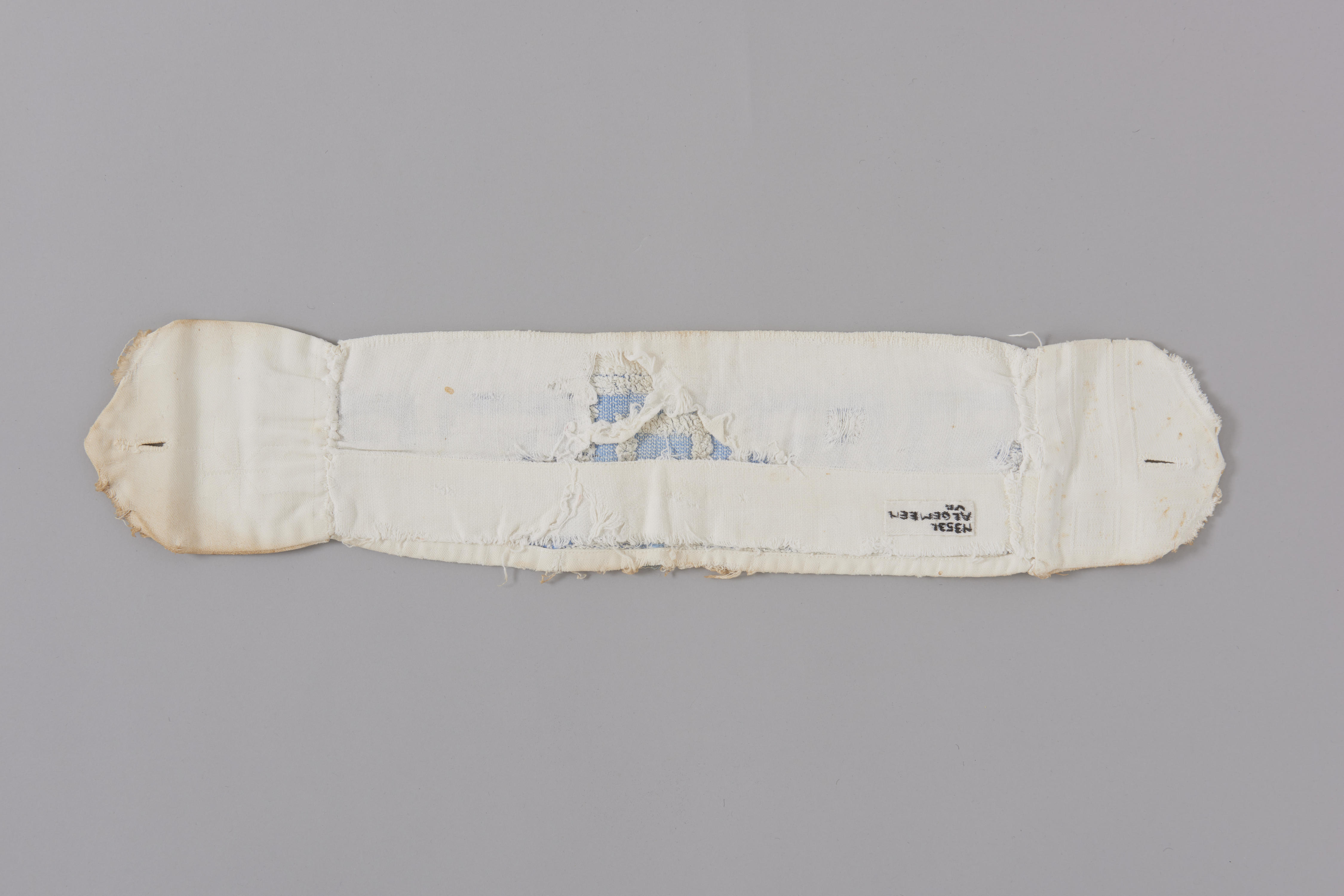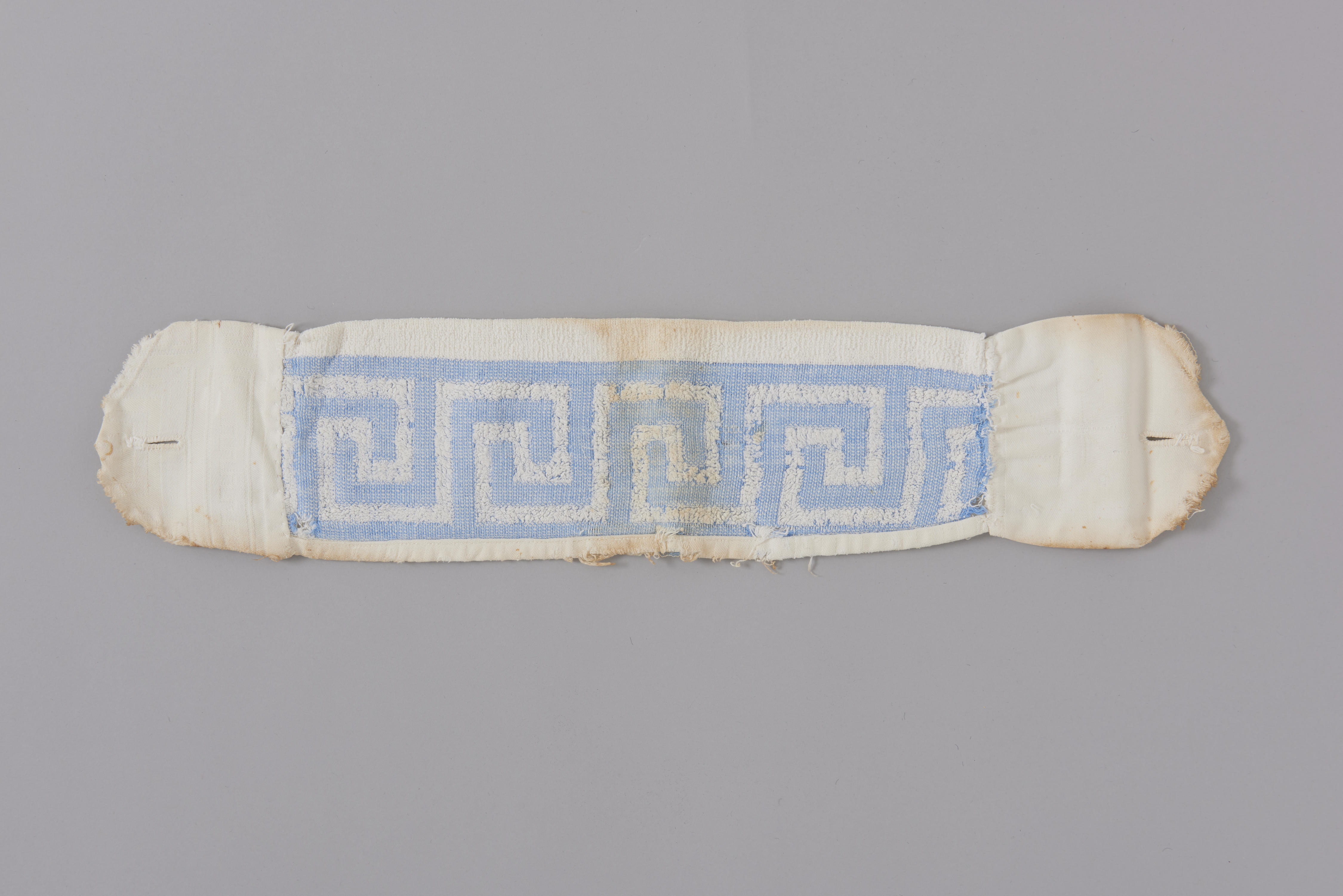Wasbaar maandverband van een langwerpige strook witte badstof met een lichtblauw hoekig meanderpatroon. Aan beide uiteinden is een rond stuk katoen genaaid, waarin knoopsgaten zijn aangebracht om het maandverband aan een gordeltje te zekeren en zo tijdens gebruik op zijn plaats te houden. Mogelijk is dit maandverbandje thuis genaaid van een oude badstof handdoek.