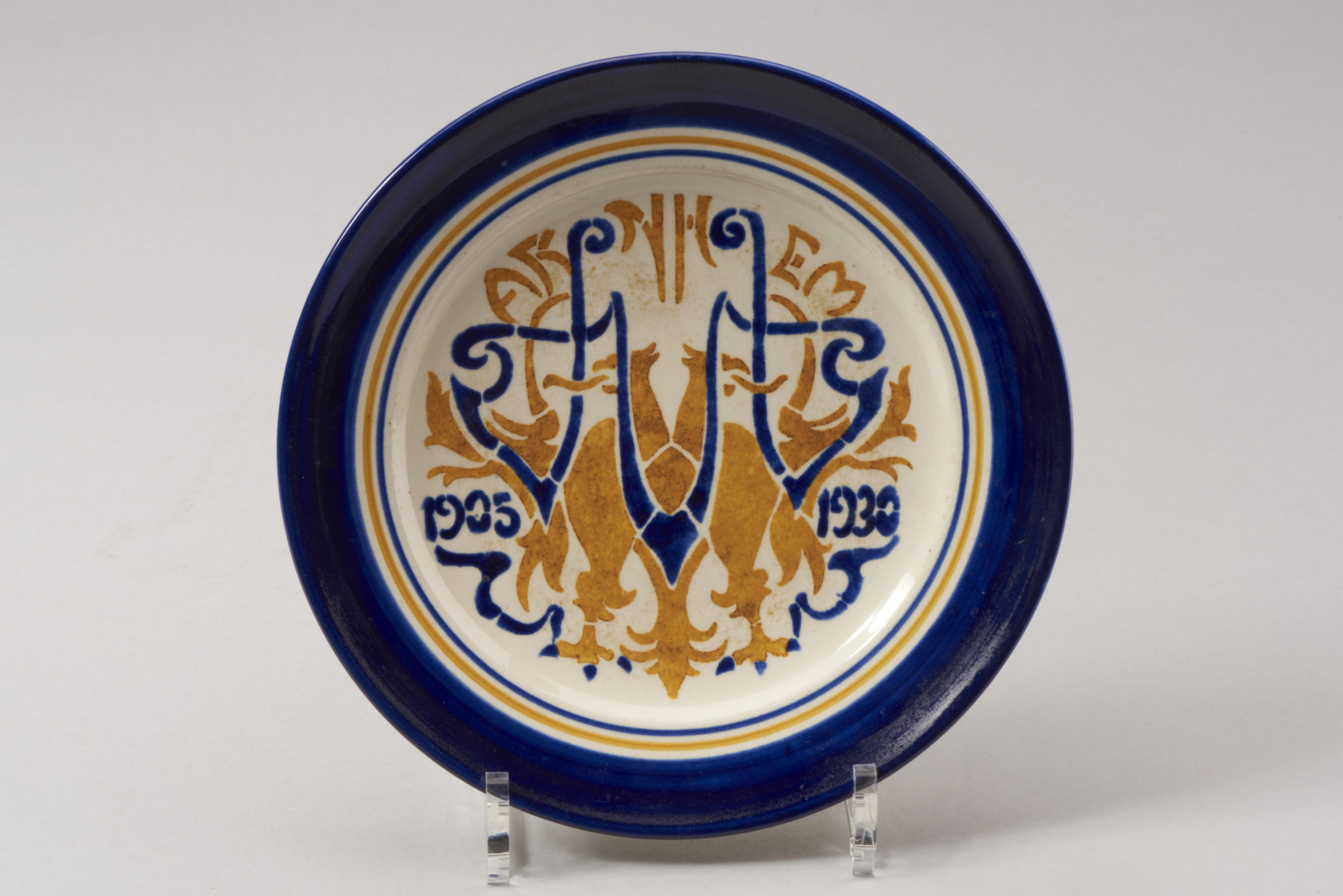 Gedenkbord, uitgegeven ter gelegenheid van het 25-jarig bestaan van de VVV in Arnhem (1905-1930). Het bord is vermoedelijk ontworpen door C.A. Lion Cachet en is geproduceerd door de Arnhemsche Fayencefabriek in 1930.
