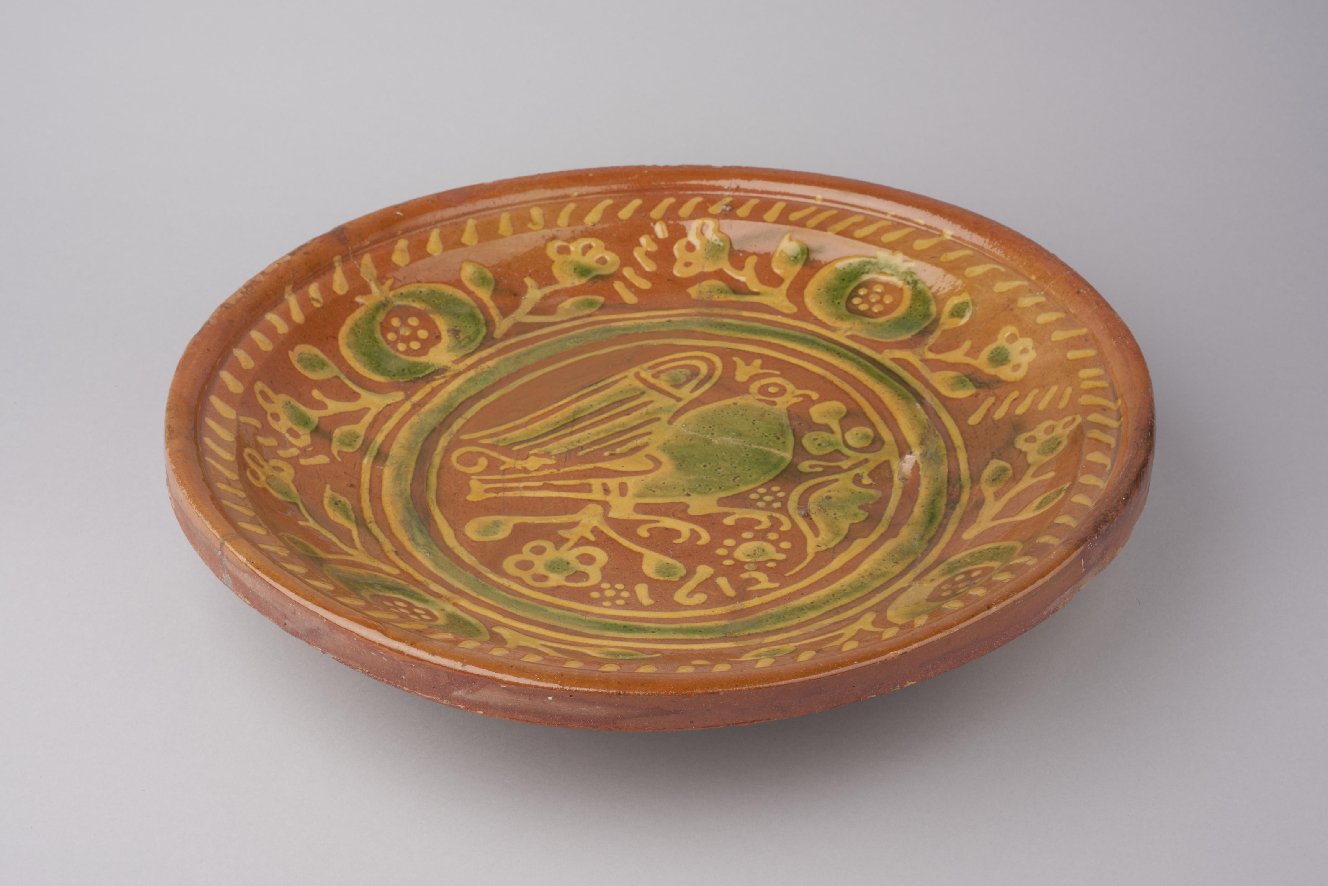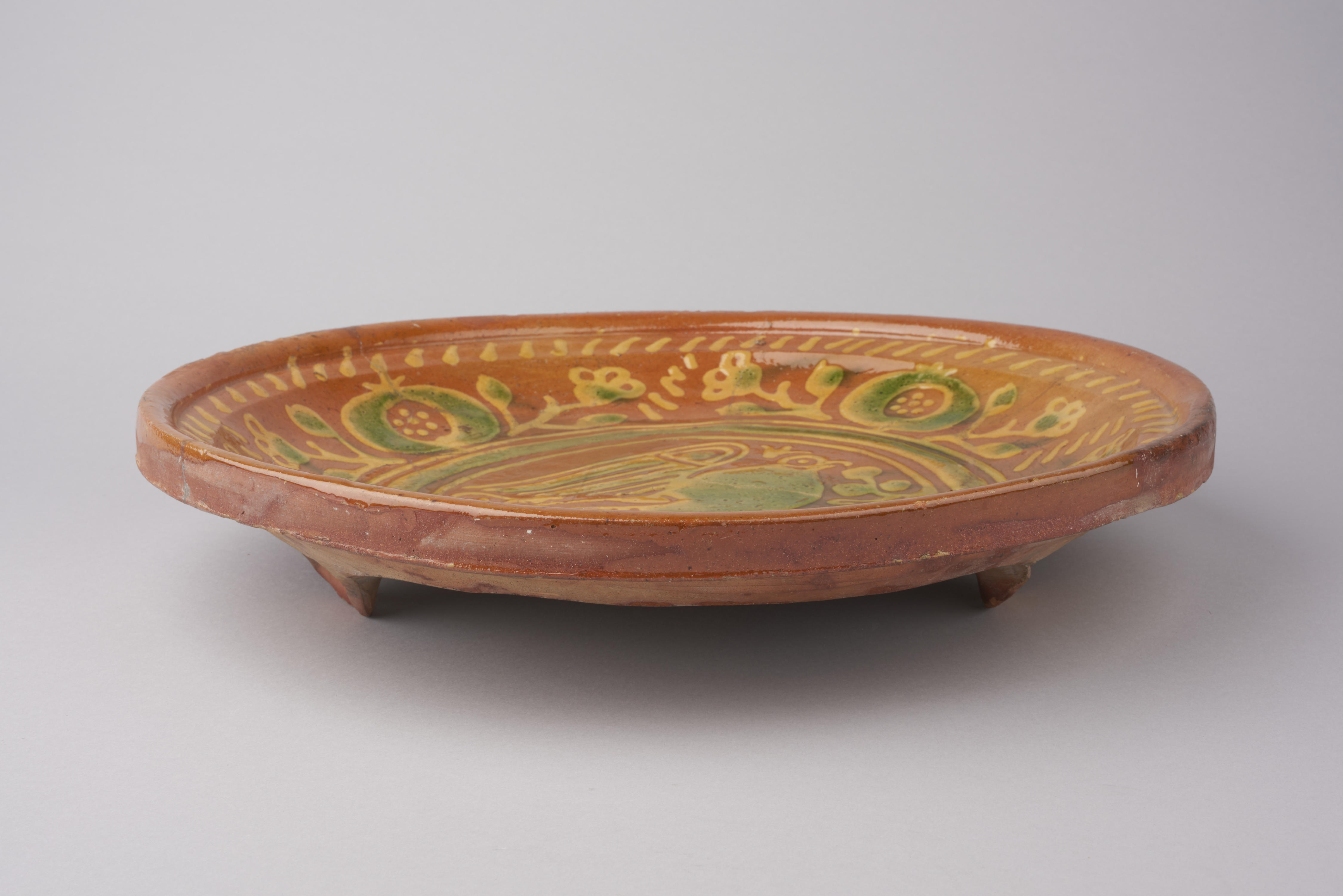 Schotel, bodemvondst in de Rijp. De schotel heeft een voorstelling van een vogel tussen vruchten en bloemen en draagt het jaartal 1612. Hij heeft drie schelpvormige voeten.