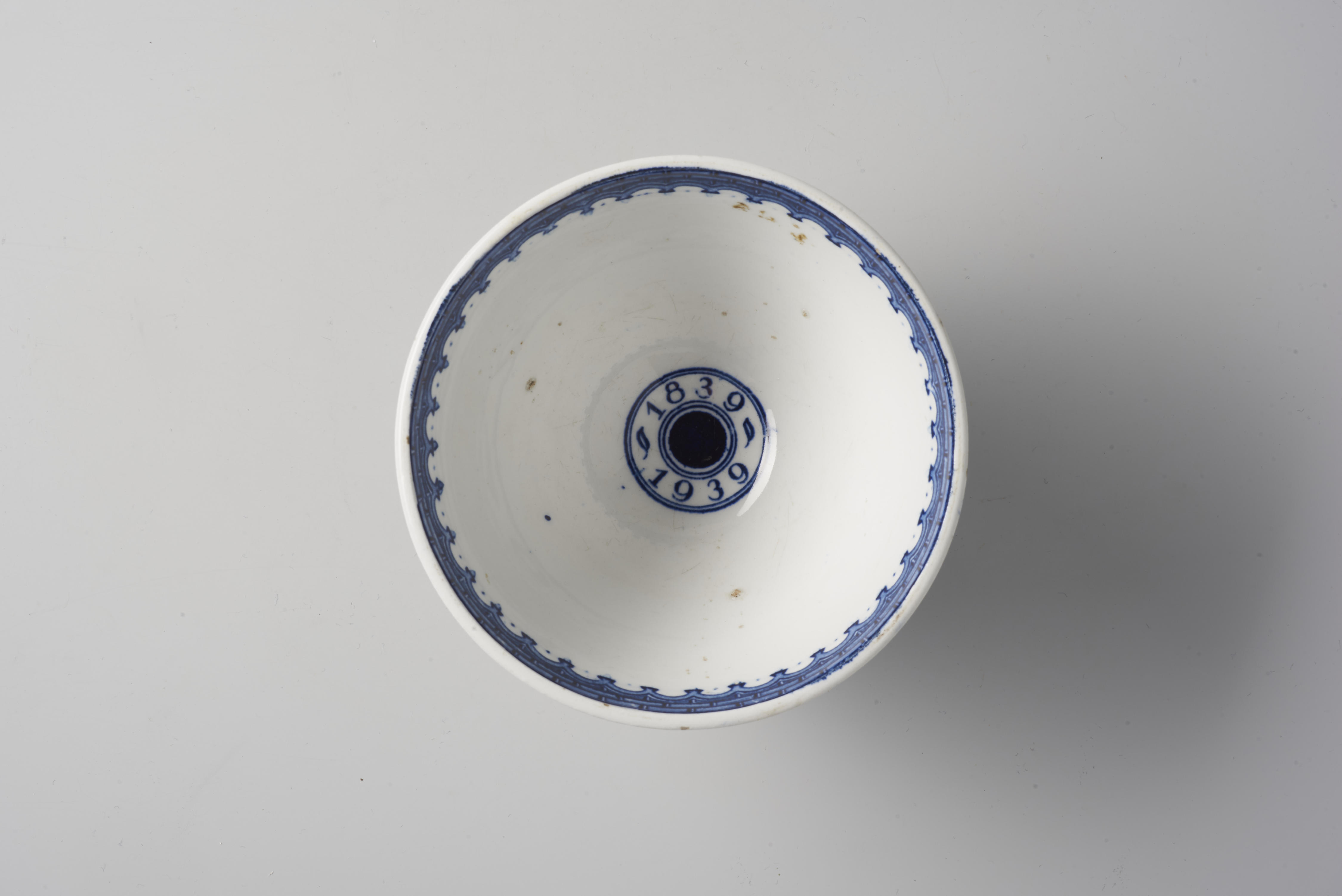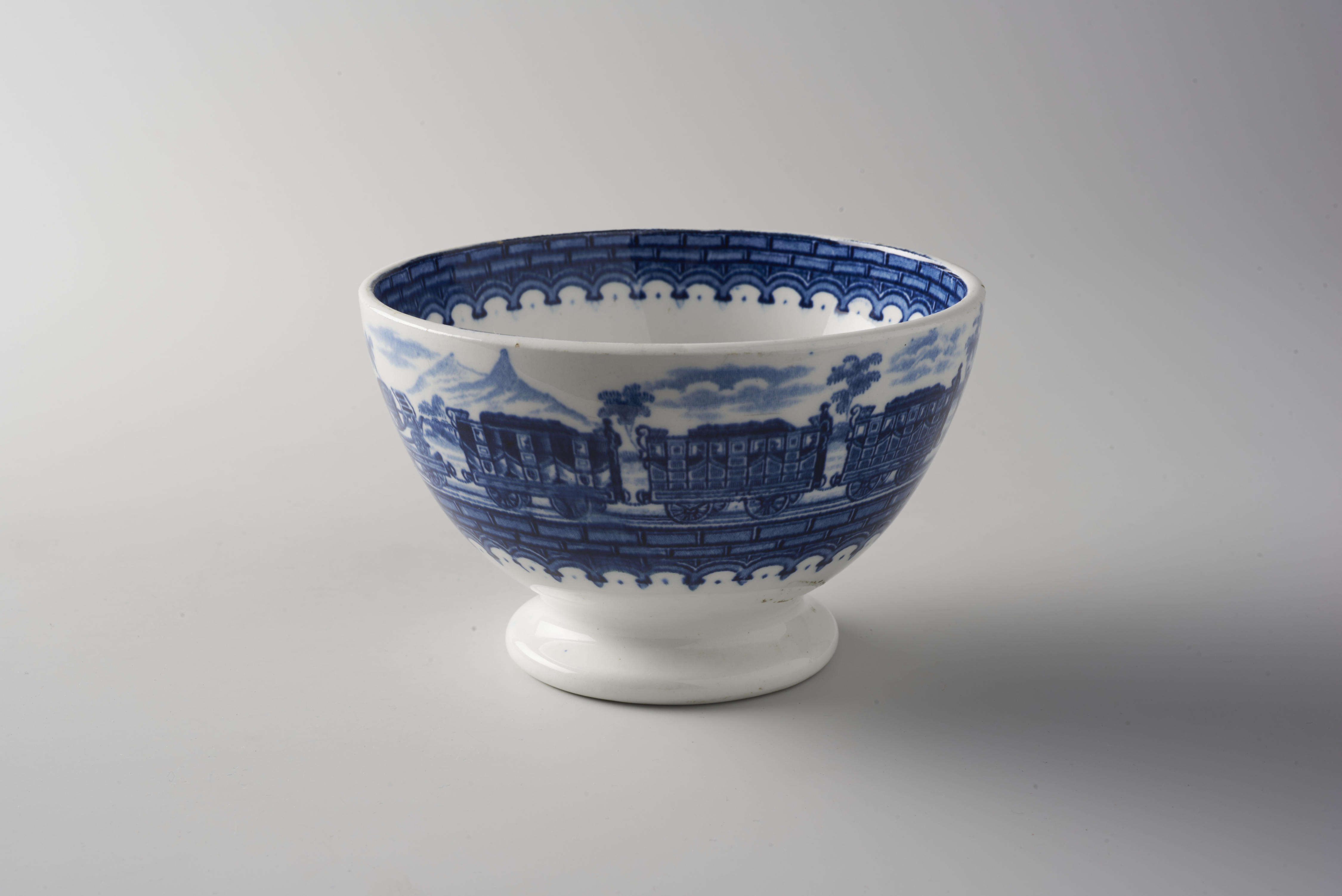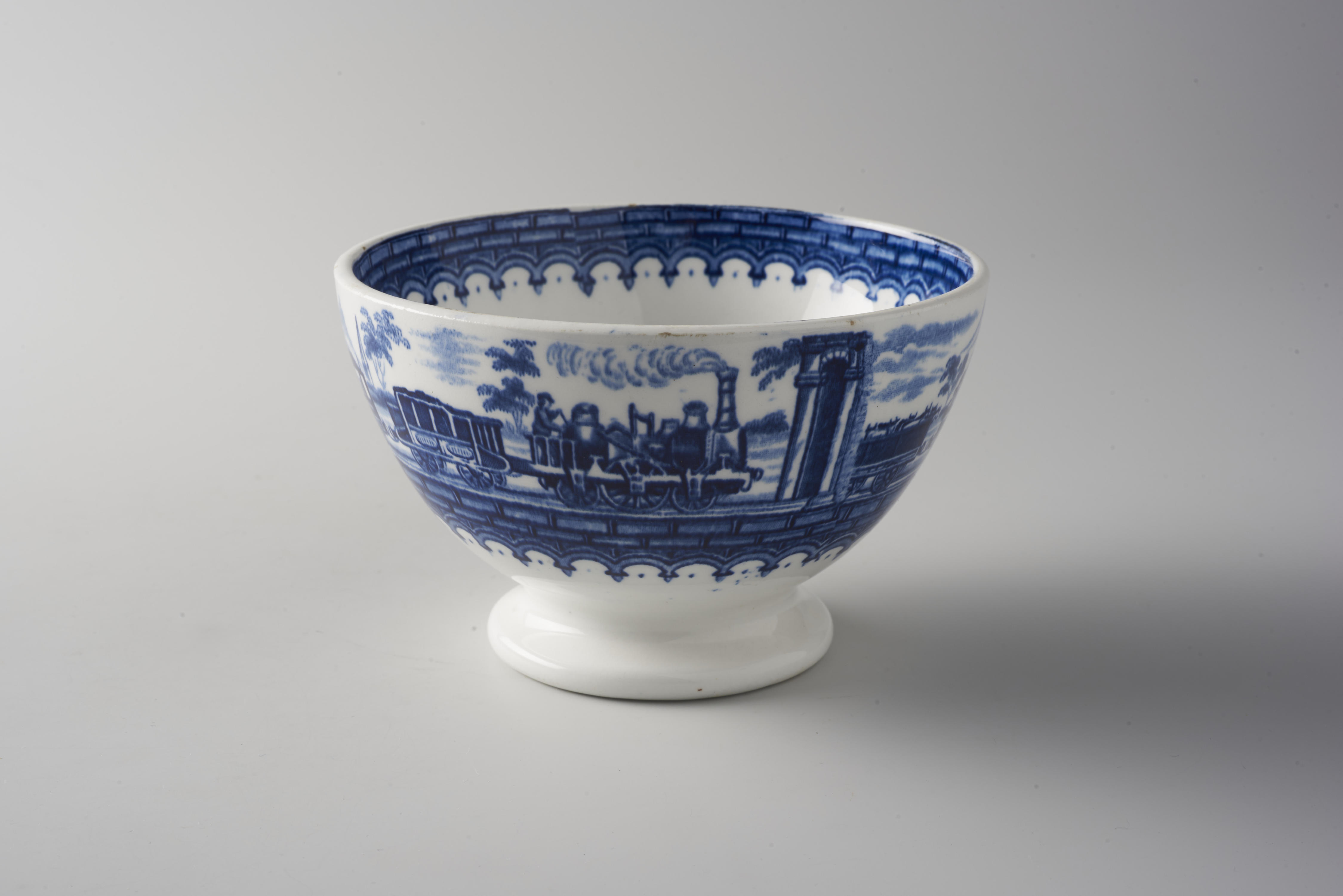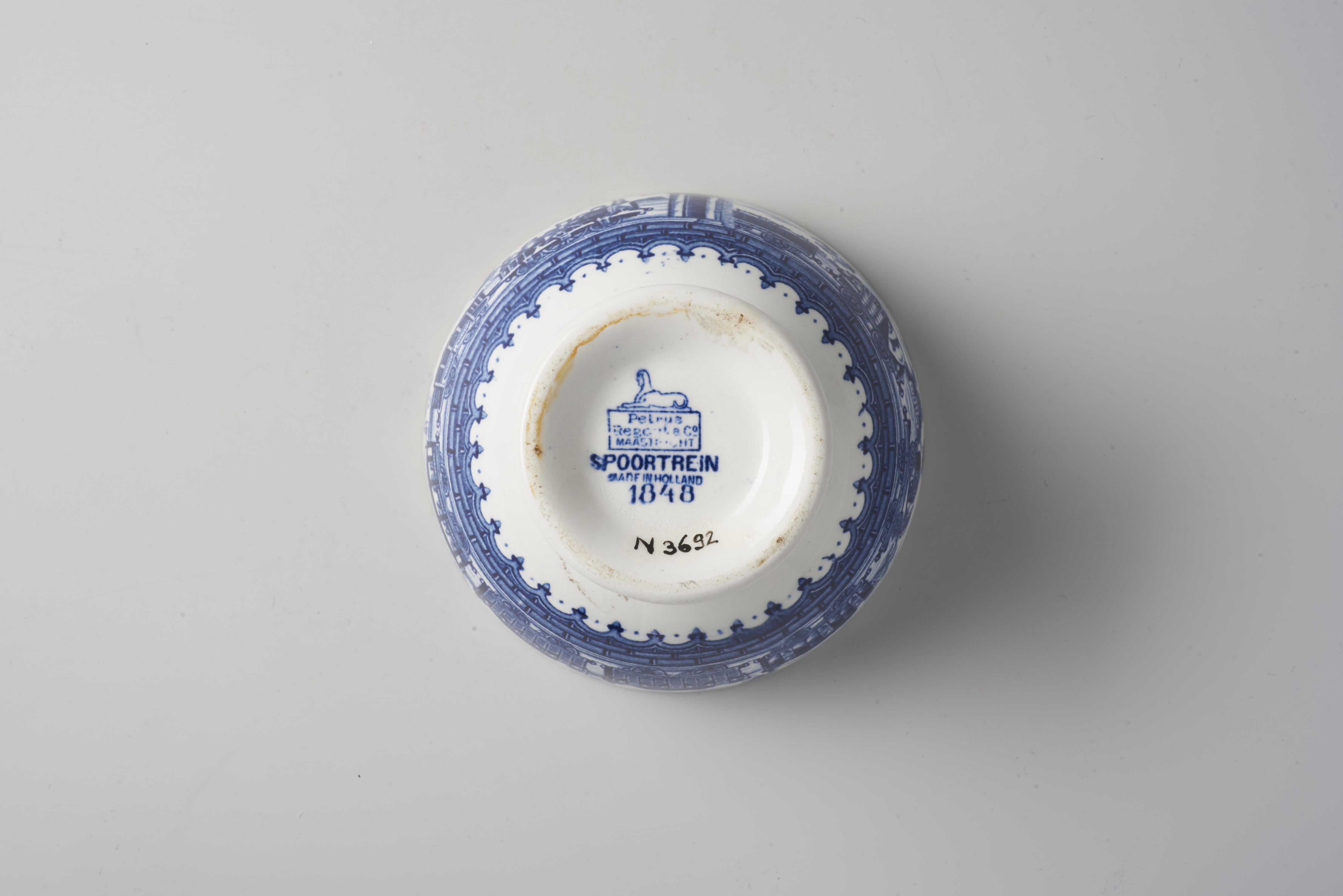 Kom met een voorstelling van een stoomtrein. In het midden van de kom staan de jaartallen: '1839 1939'. De kom is gemaakt ter gelegenheid van het honderdjarig bestaan van de Nederlandse Spoorwegen in 1939.