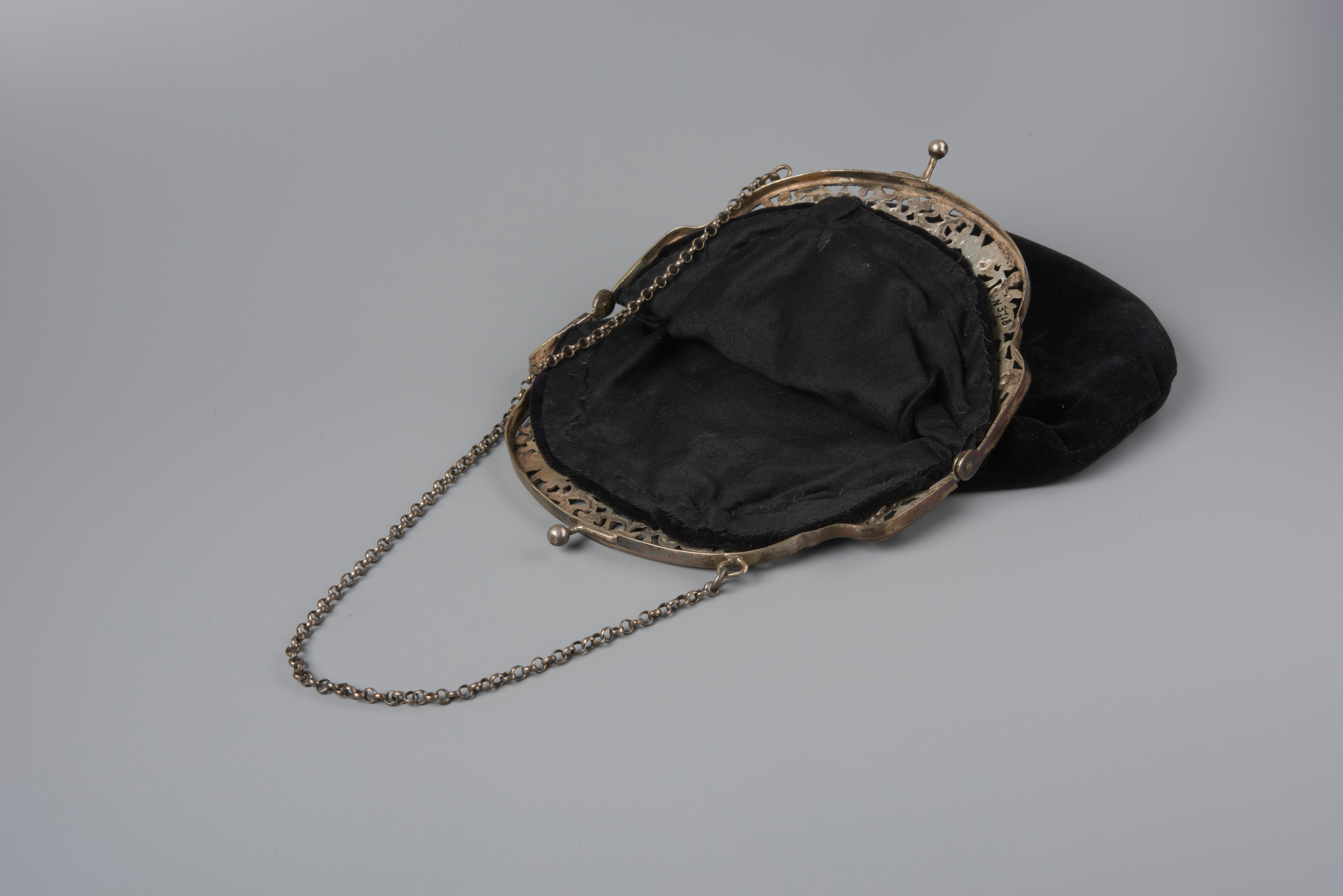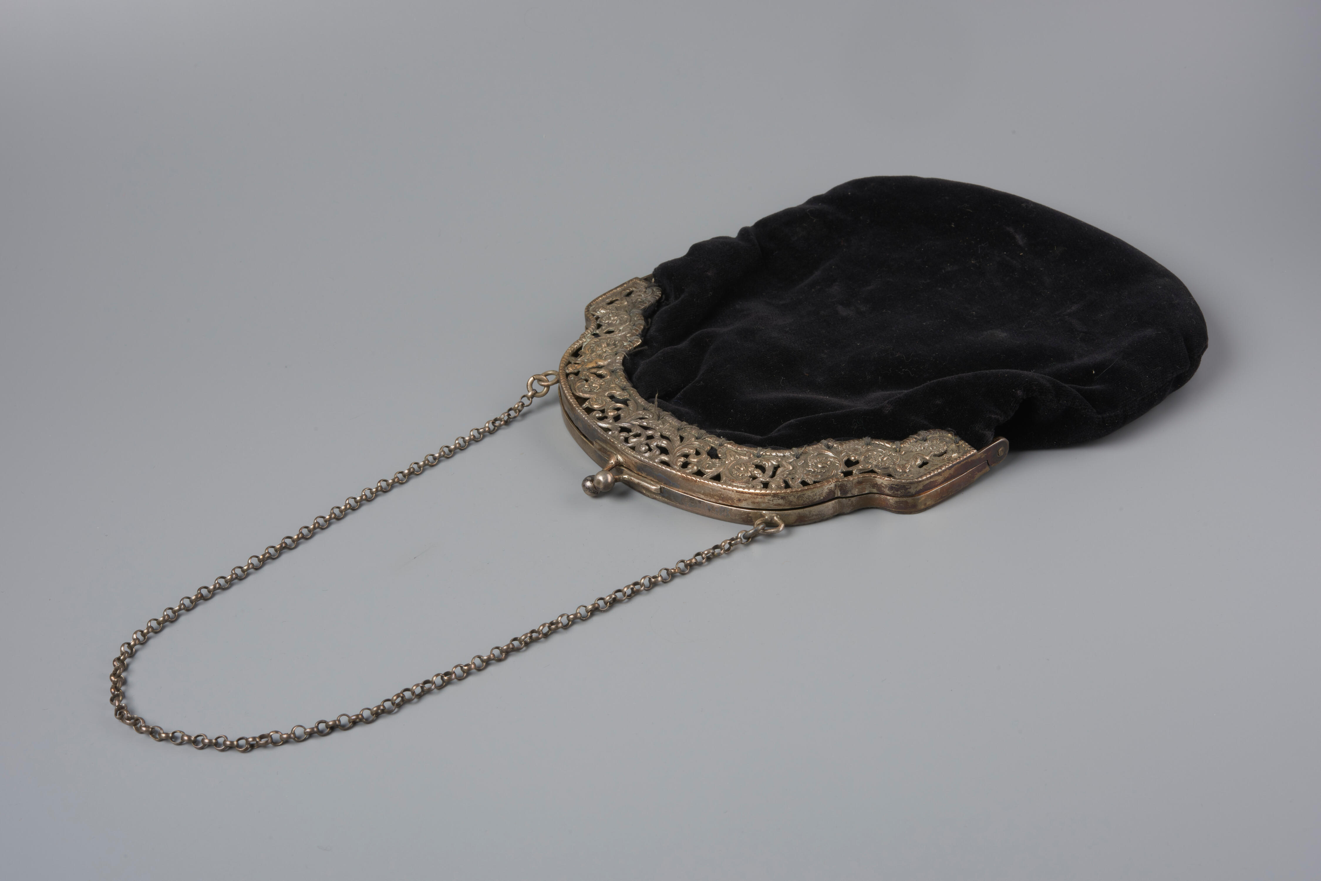 Een handtas met zilveren beugel, gebruikt door een meisje of vrouw in Walcherse streekdracht. De tas is van zwart fluweel. Dit type tasbeugel is niet streekgebonden en werd in verschillende streekdrachten gebruikt. De beugel is vervaardigd in Schoonhoven.
