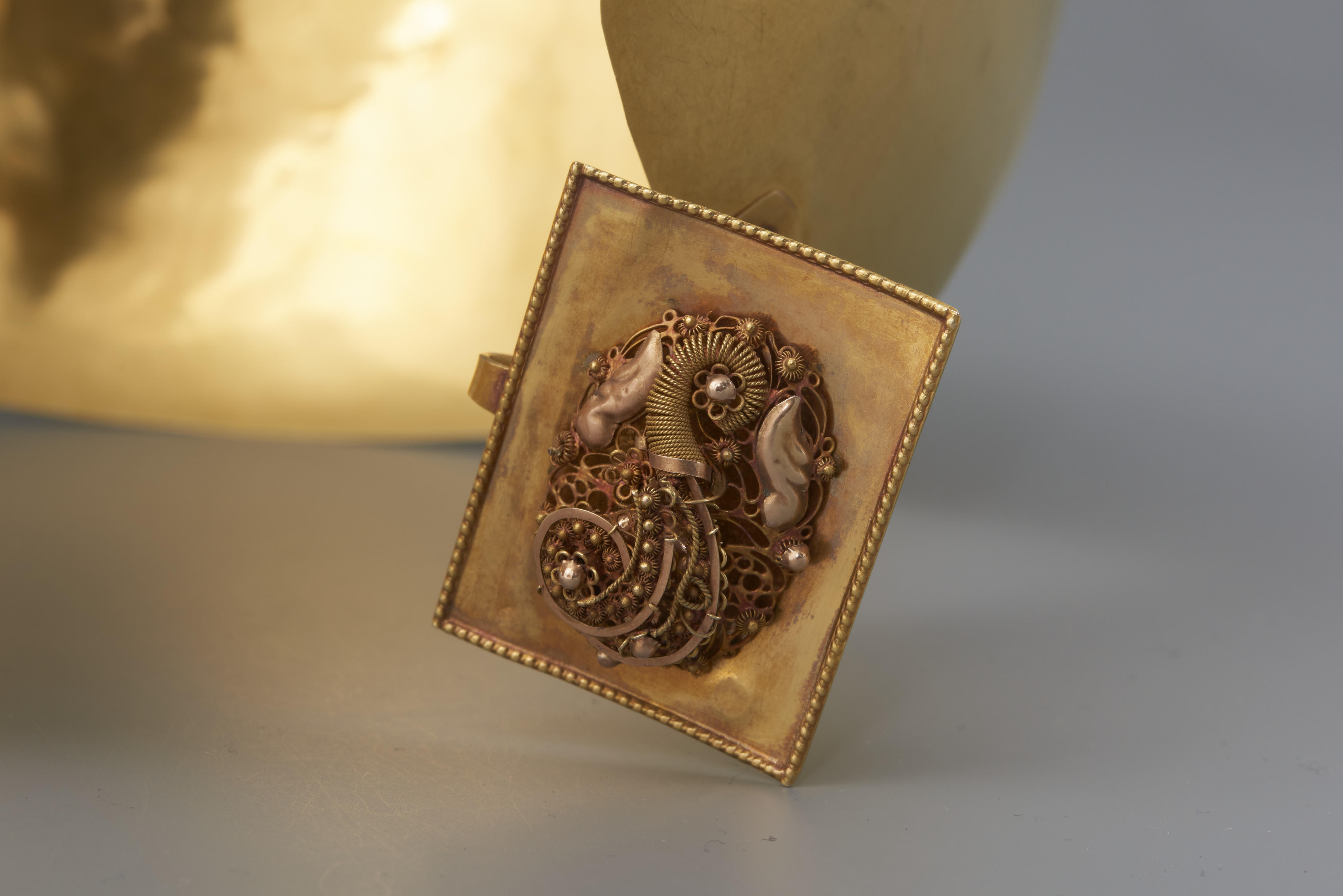 Gouden oorijzer met gouden boeken, gedragen door Maria Martha Voorburg-Stalenhoef (1897-1973) uit Blaricum. Maria droeg over het oorijzer de Gooise 'staartkap'. In het verbindingsstuk tussen de beugel en de boeken zitten twee gaatjes. Hierdoor kunnen spelden worden gestoken die de muts en het oorijzer aan elkaar bevestigen. In de beugel staat de jaarletter van 1910. ...