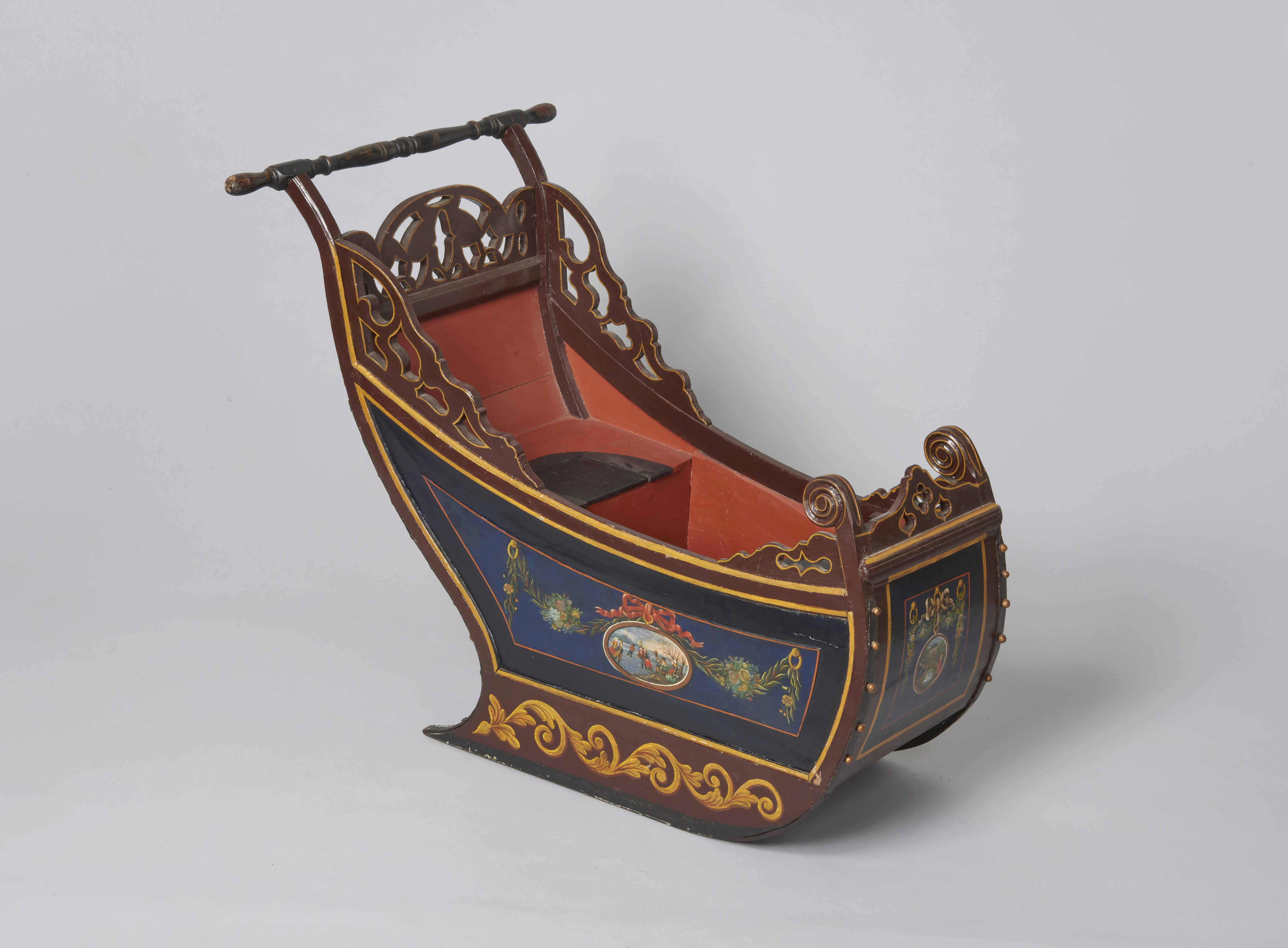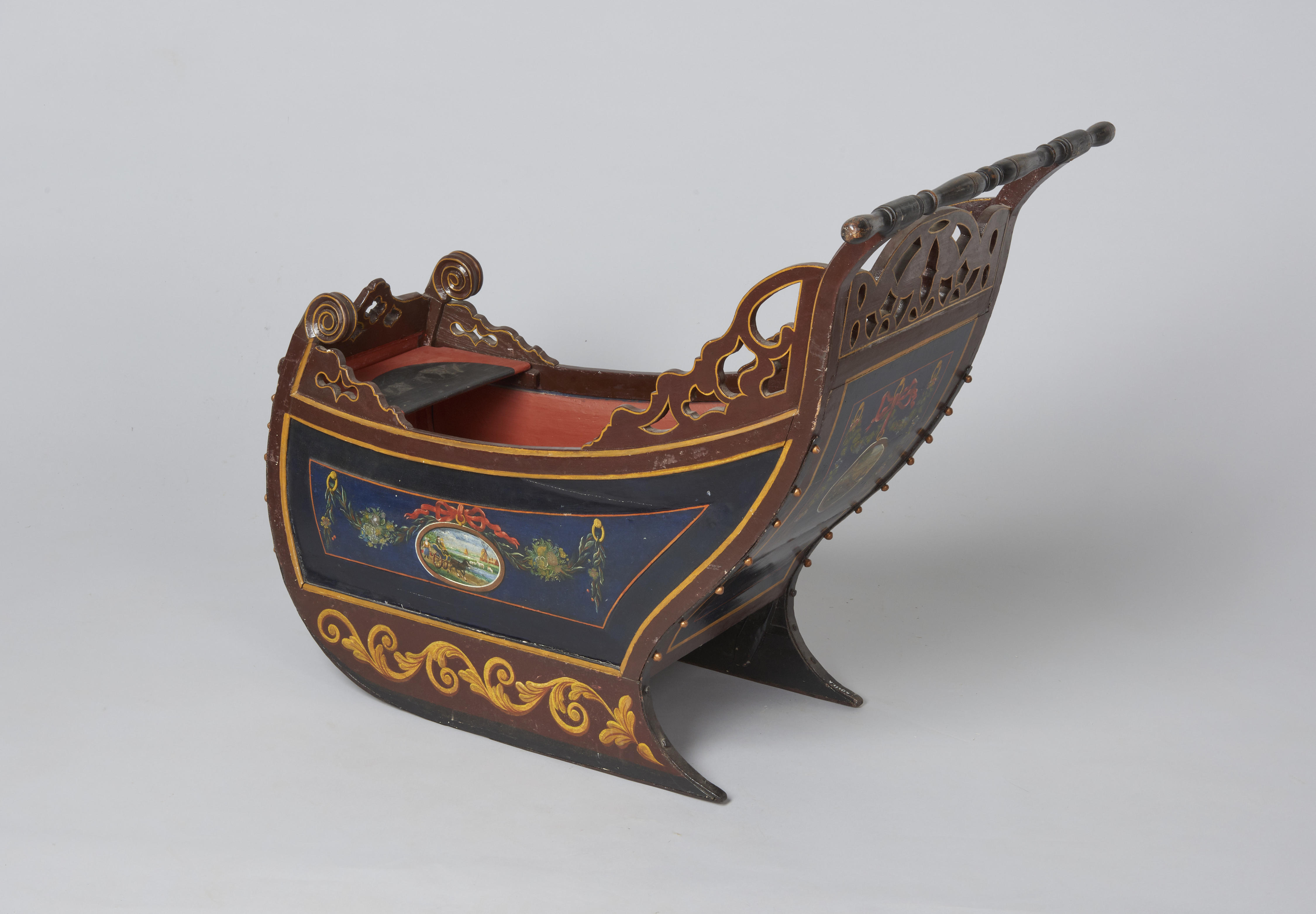 Beschilderde bakslede, versierd met medaillons met verschillende taferelen. In de omlijstingen zijn verder guirlandes en strikversieringen aangebracht. In de slede is plaats voor twee personen.