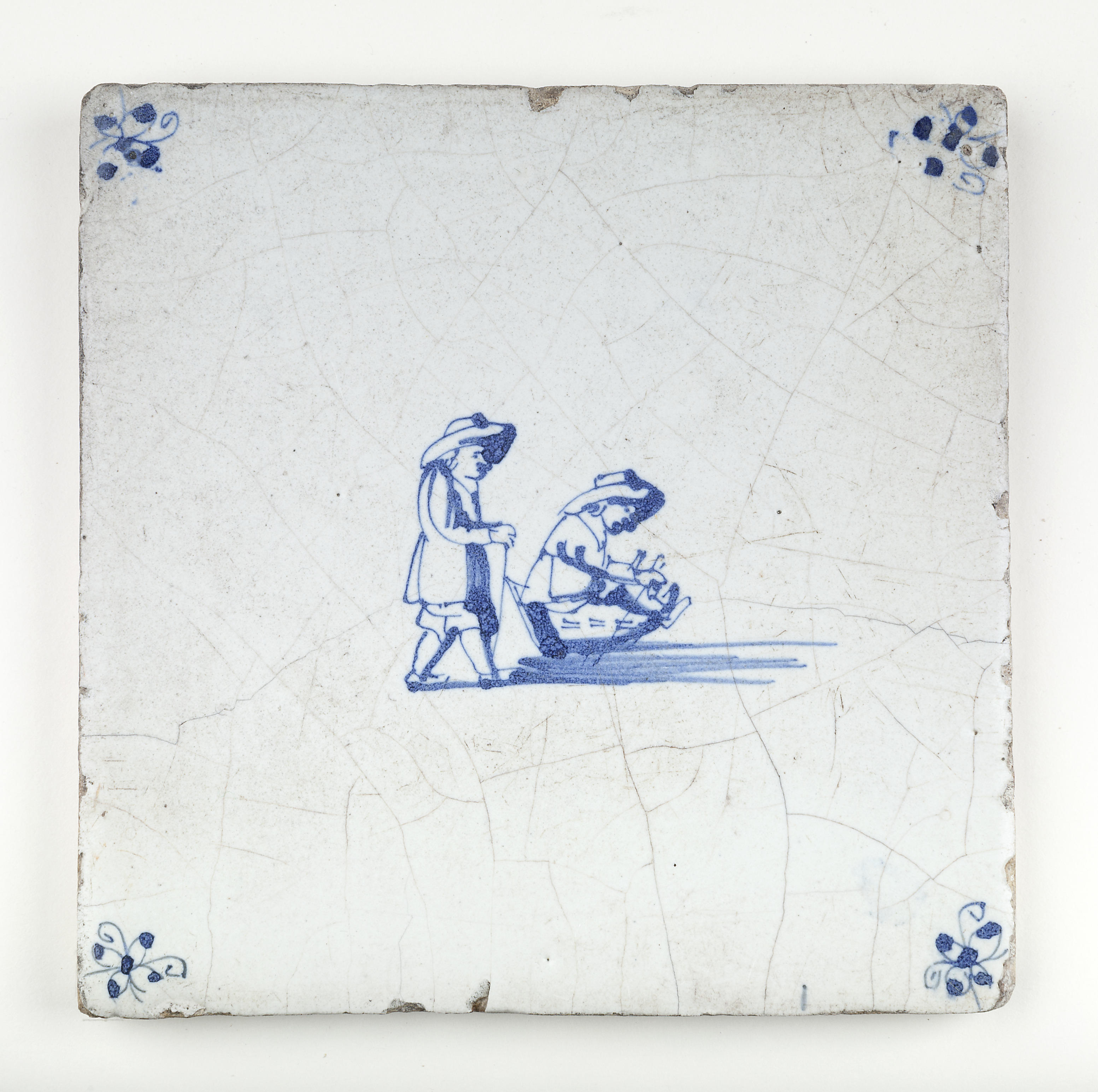 Tegel met een afbeelding van een figuur in een prikslee met daarachter een lopende man; blauw; hoekmotief: spin; 1700-1800.