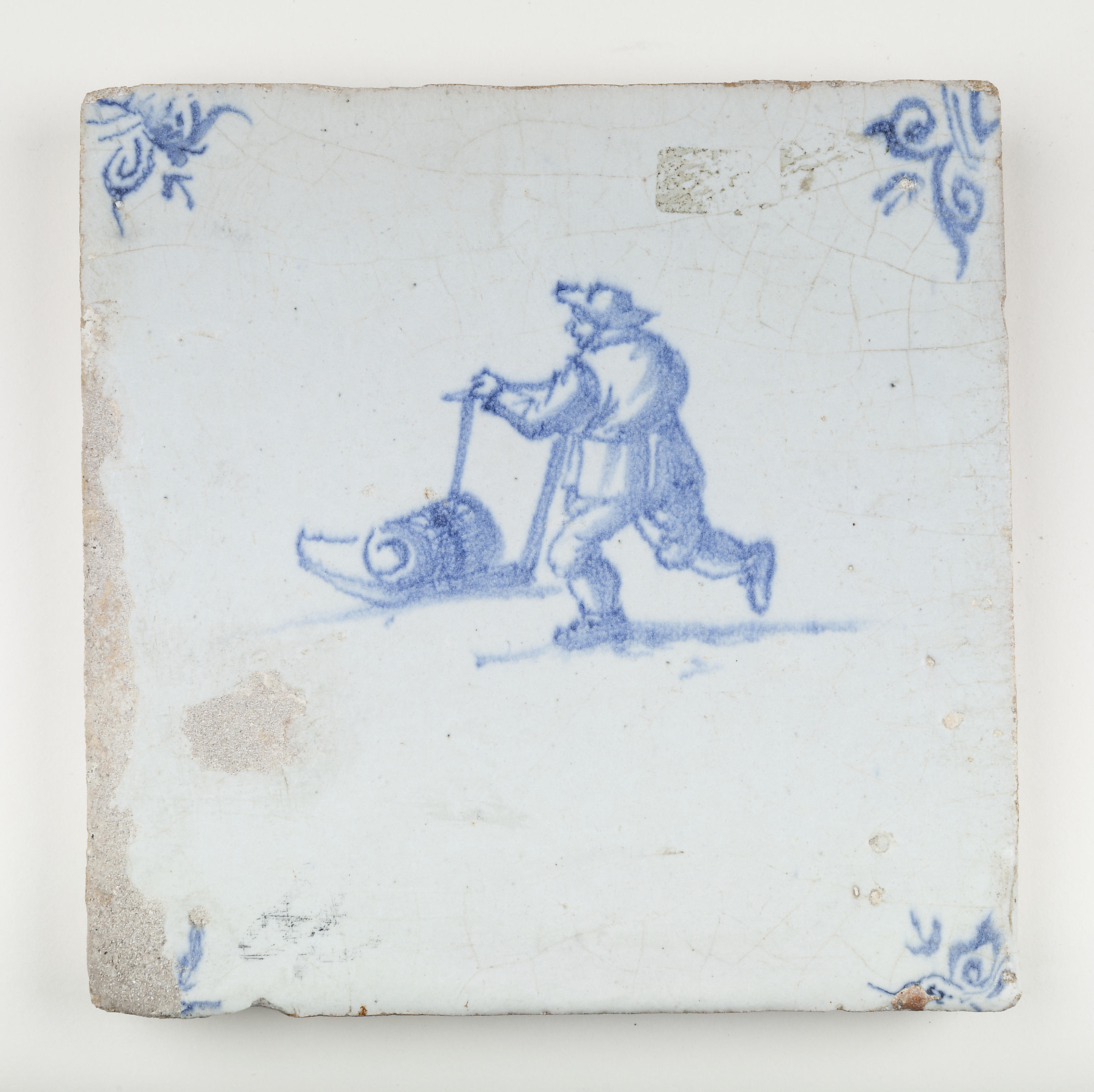 Tegel met een afbeelding van een man achter een transportslee, 1600–1700