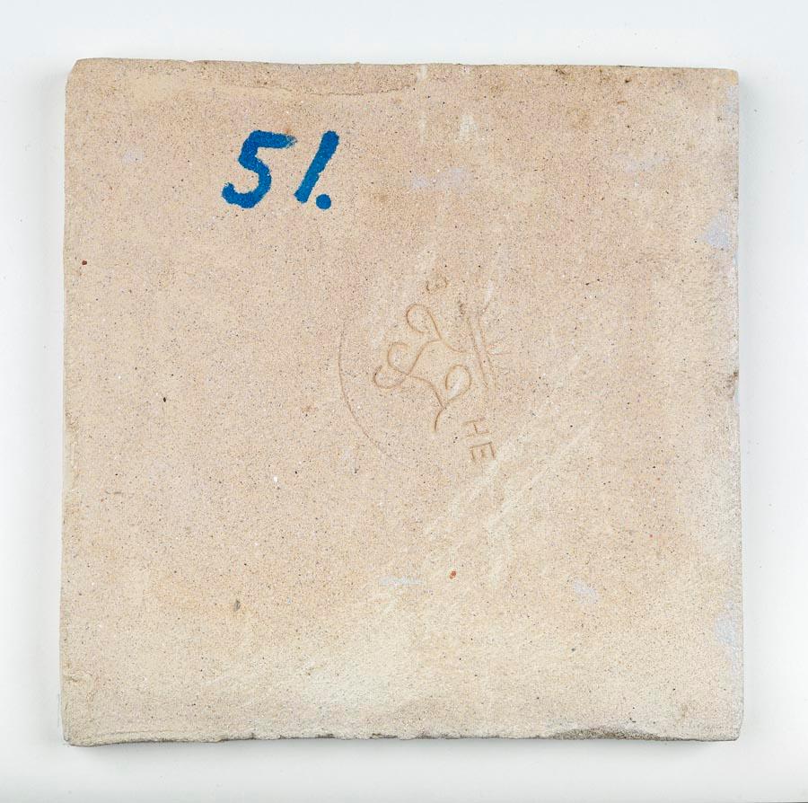 Tegel met een afbeelding van een schaatsende man en vrouw; blauw; hoekmotief: ossenkop; circa 1985. Onder de afbeelding staat de tekst: ‘13e Elfstedentocht 1985’.