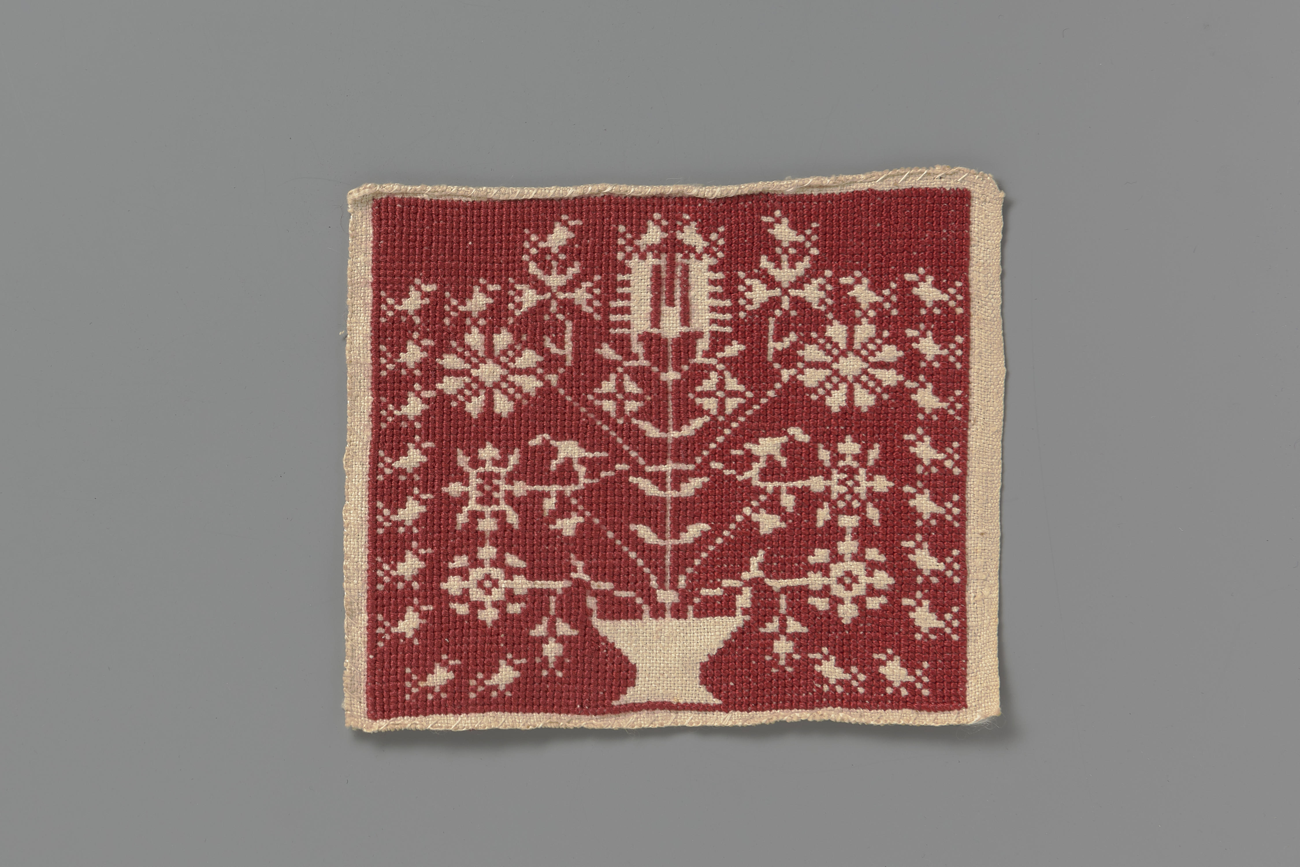 Proeflap van wit linnen met zogenoemd 'assisiwerk' in rood DMC-garen. De voorstelling bestaat uit een levensboom met vogels.