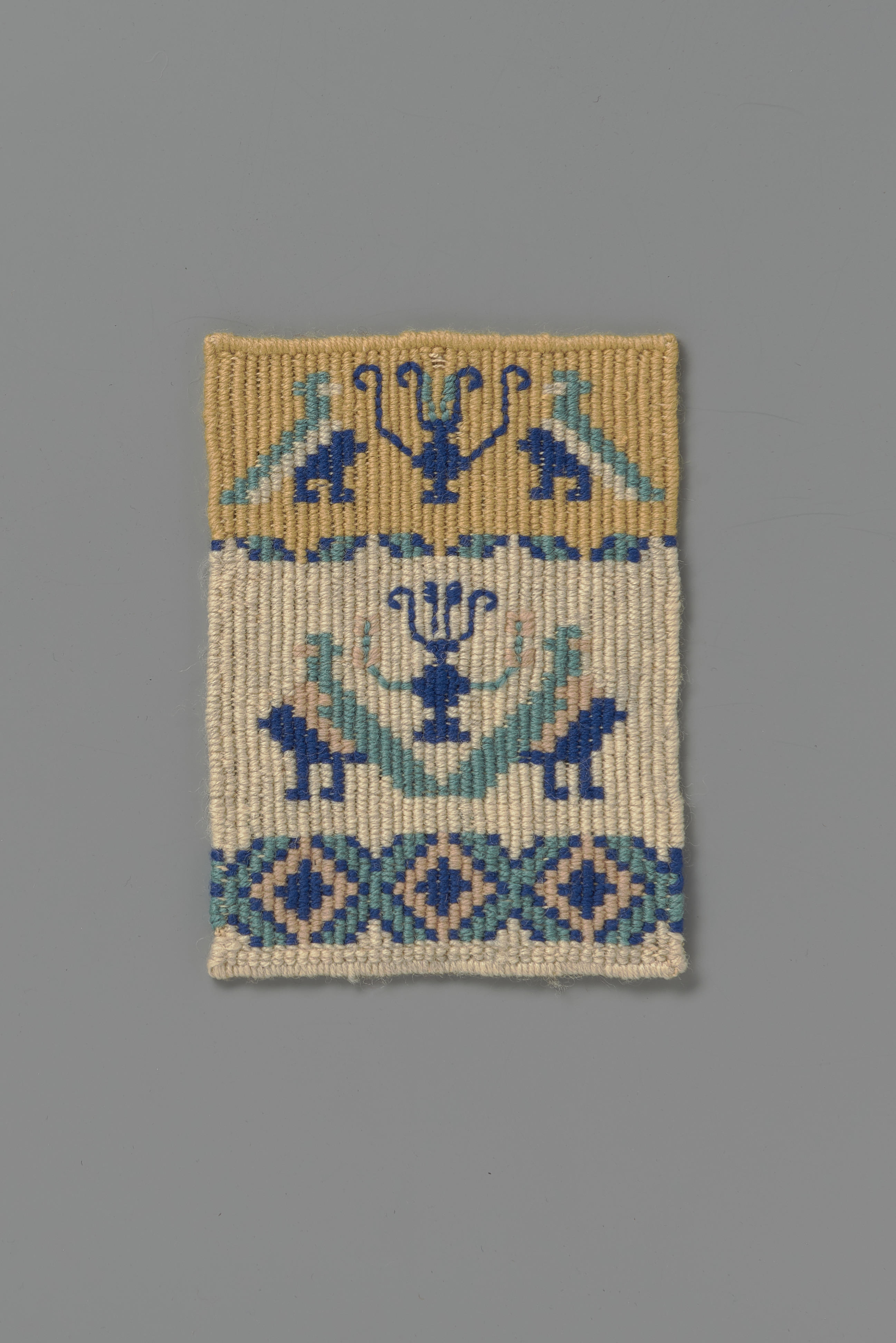 Proeflapje met tapisseriewerk, met wol in de kleuren jaeger, geel, zand, groen en blauw. Op het lapje staan pauwen afgebeeld.