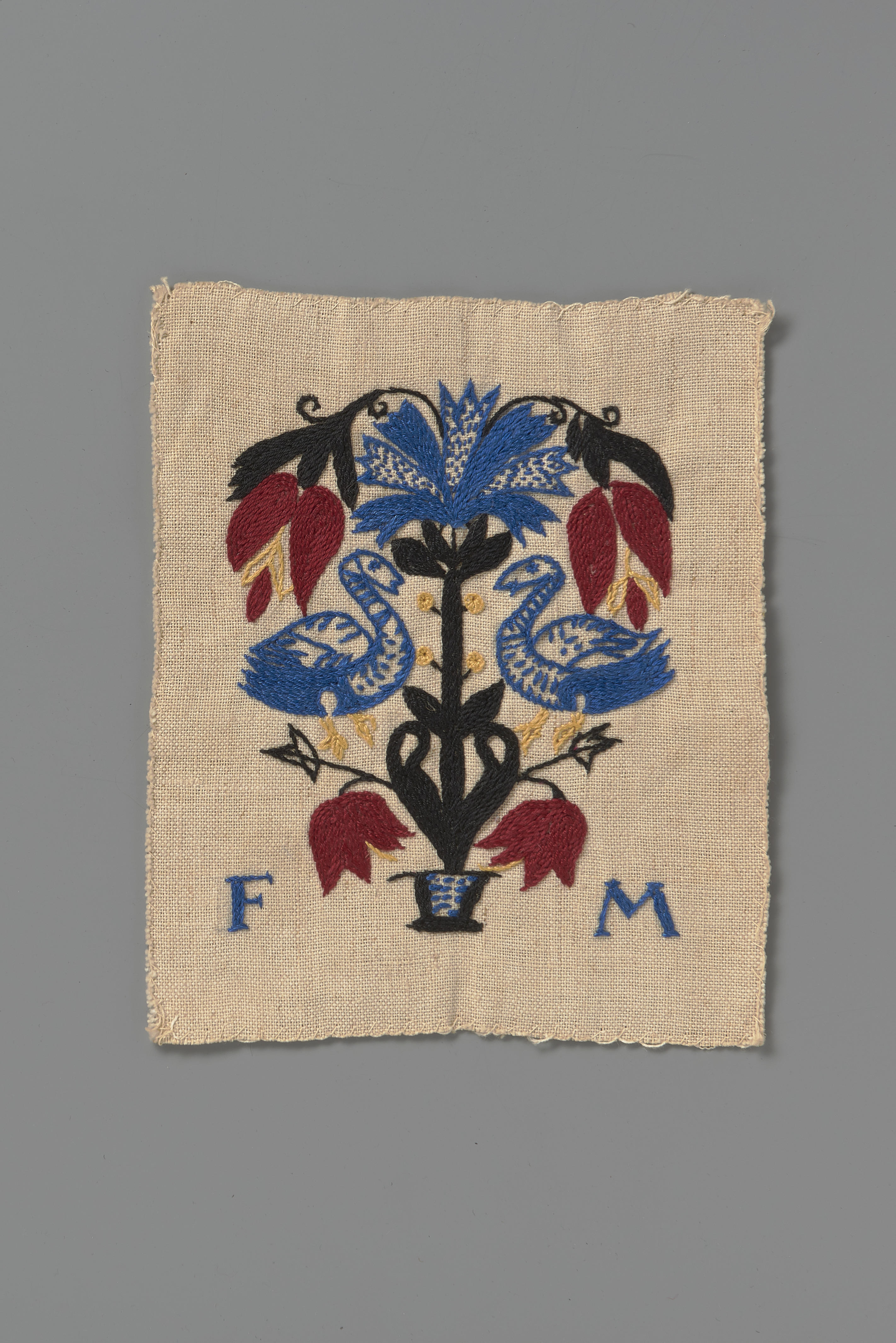 Proeflapje met vrij borduurwerk op gebleekt linnen, in steelsteekjes en kleine vulsteekjes in de kleuren geel, rood, blauw en zwart. Het borduurwerk is afgeleid van een Fries mutsje in het Fries Museum in Leeuwarden en bestaat uit een levensboom met twee zwanen. Onderaan naast de bloempot staat links de letter F en rechts de letter ...