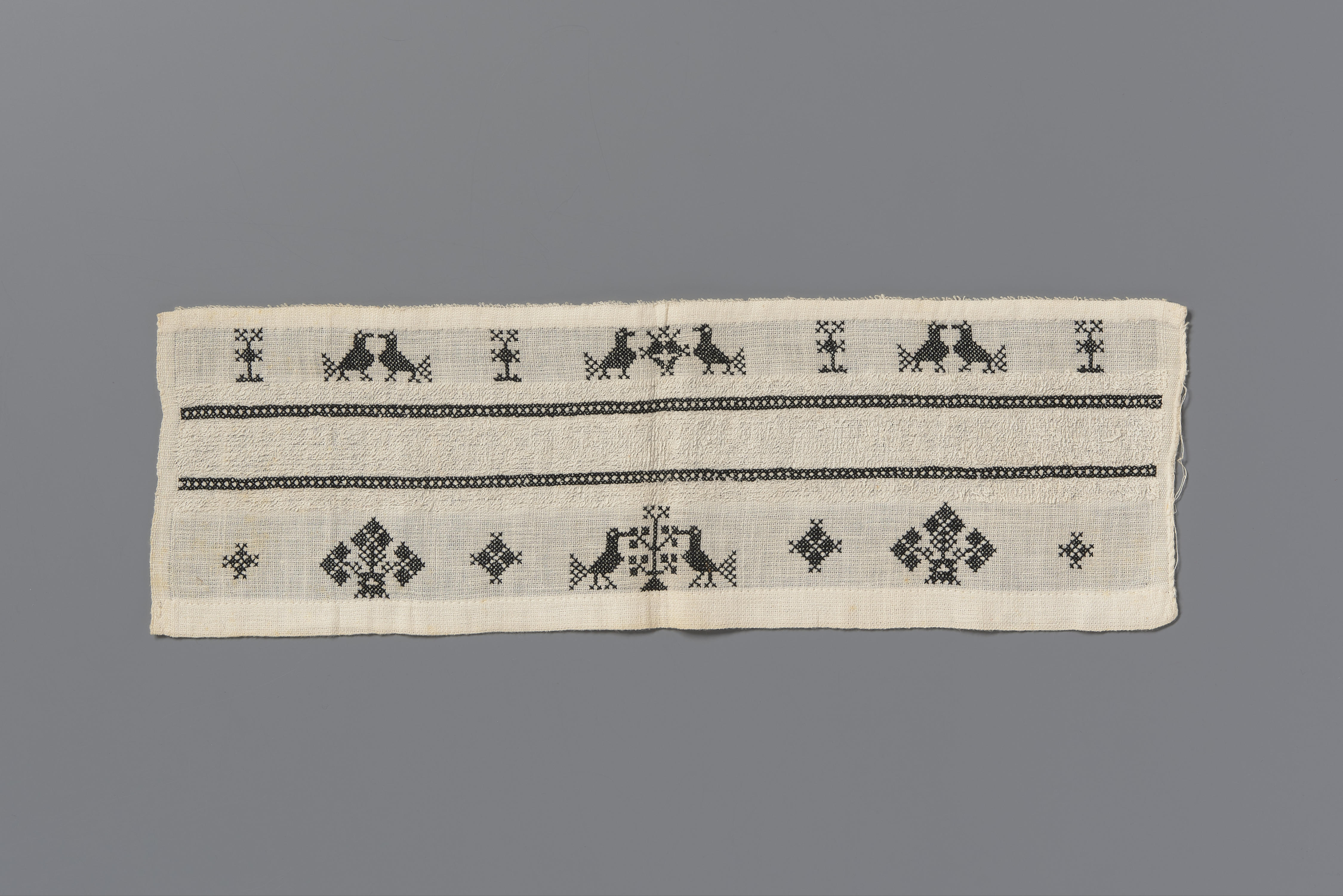 Proeflapje van witte katoenen badstof met kruissteekmotieven van vogels, levensbomen en rozetten in zwarte splijtzijde.