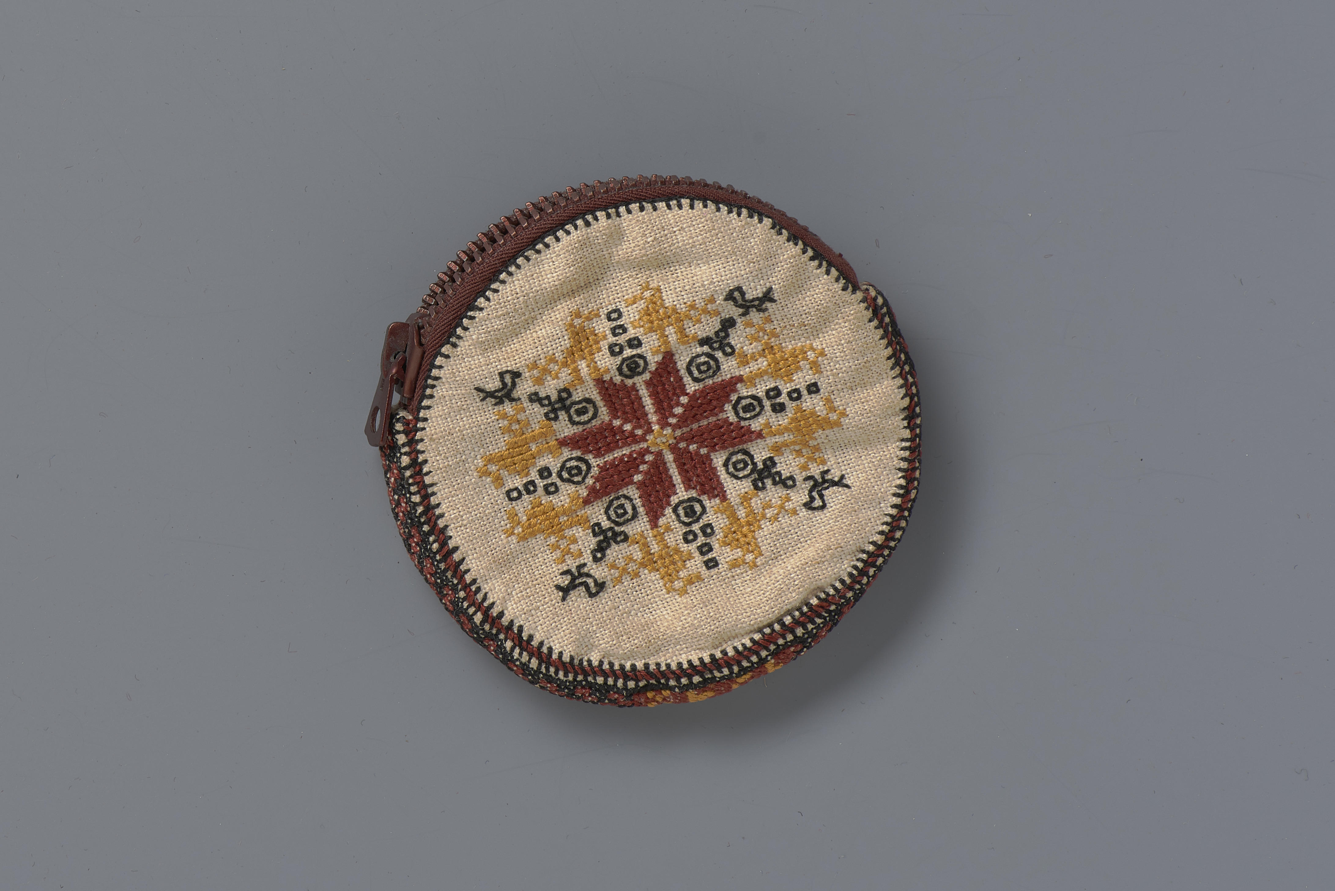 Beurs van wit linnen met kruissteekpatronen. Aan de ene kant is een stermotief met vogeltjes te zien; aan de andere kant is een levensboom afgebeeld. Het borduurwerk is in rood, geel en zwart katoenen garen aangebracht. De voering is crèmekleurig.