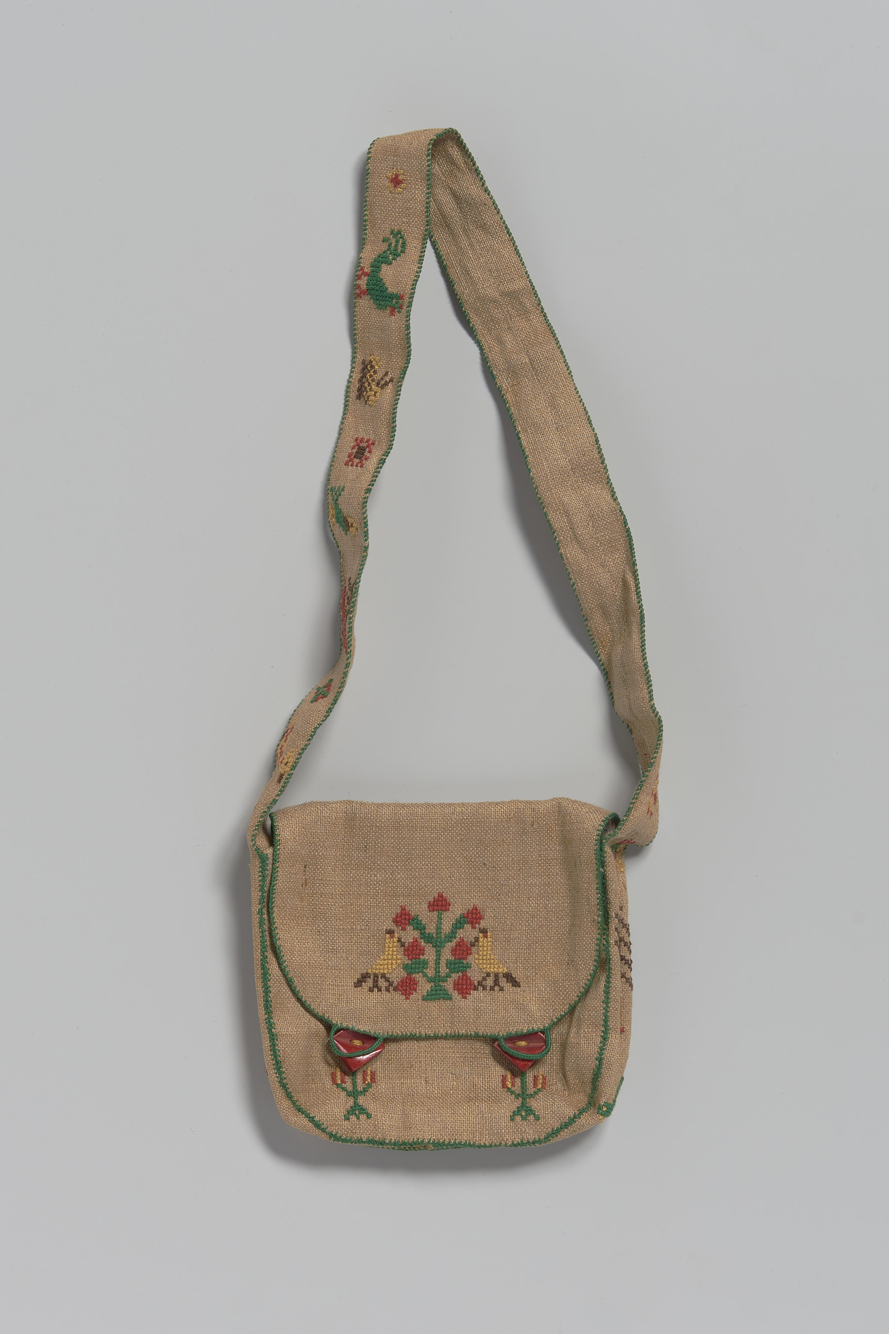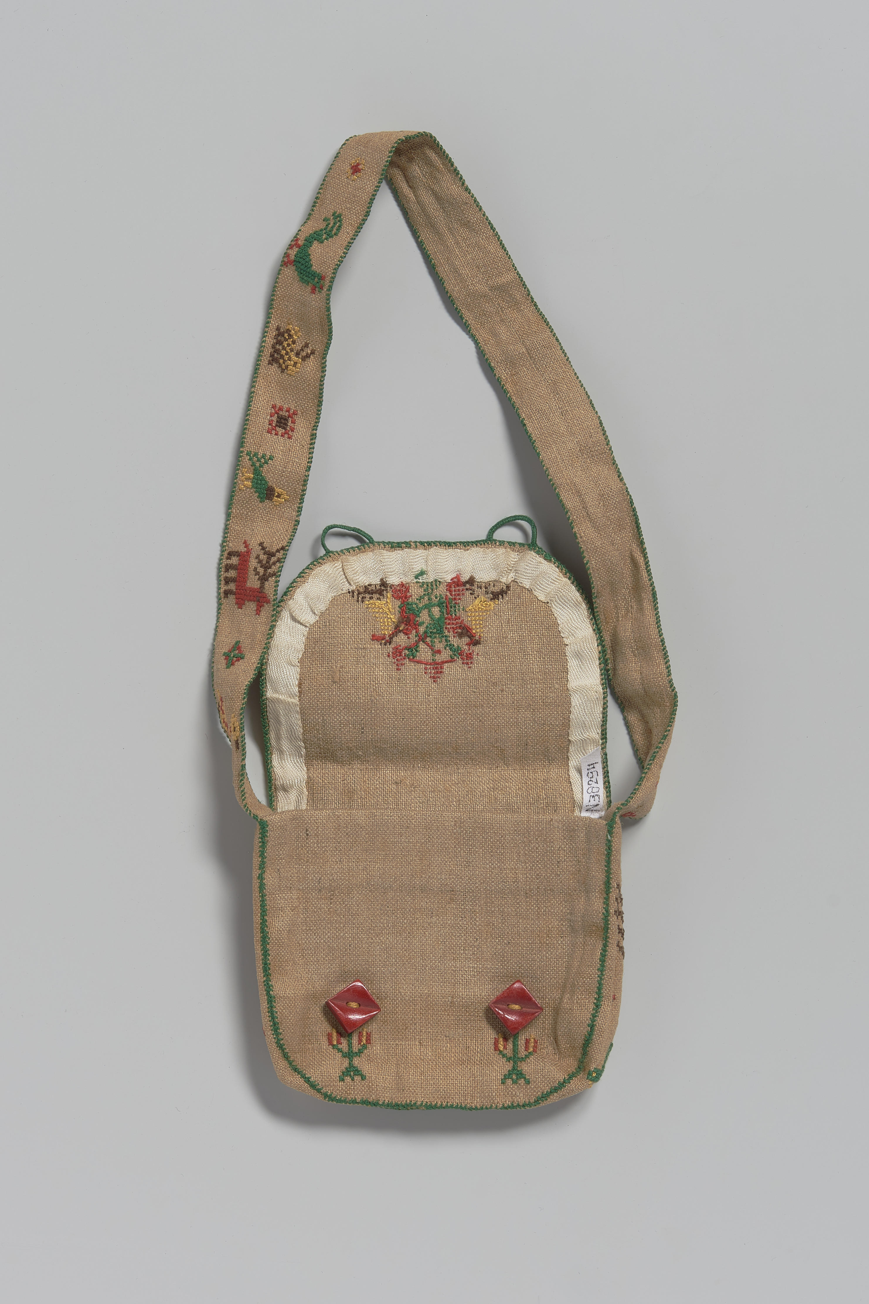 Tas van kleermakerslinnen met een sluiting van twee rode houten knopen. De voorzijde van het tasje en de riem zijn versierd met dier- en bloemmotieven in kruissteek en uitgevoerd in rood, geel, bruin en groen garen. De randen zijn afgewerkt met groene festonsteek en overhandse steek.