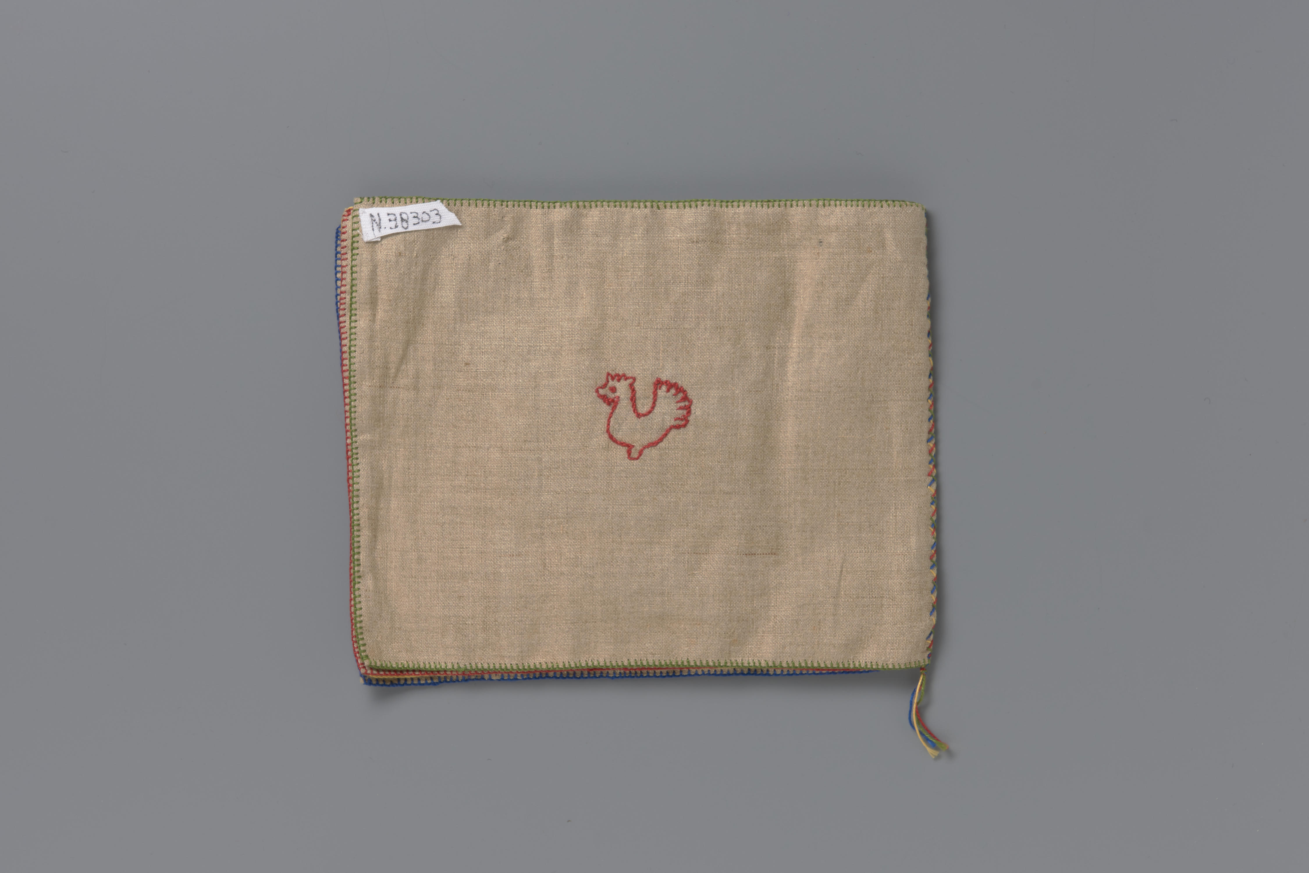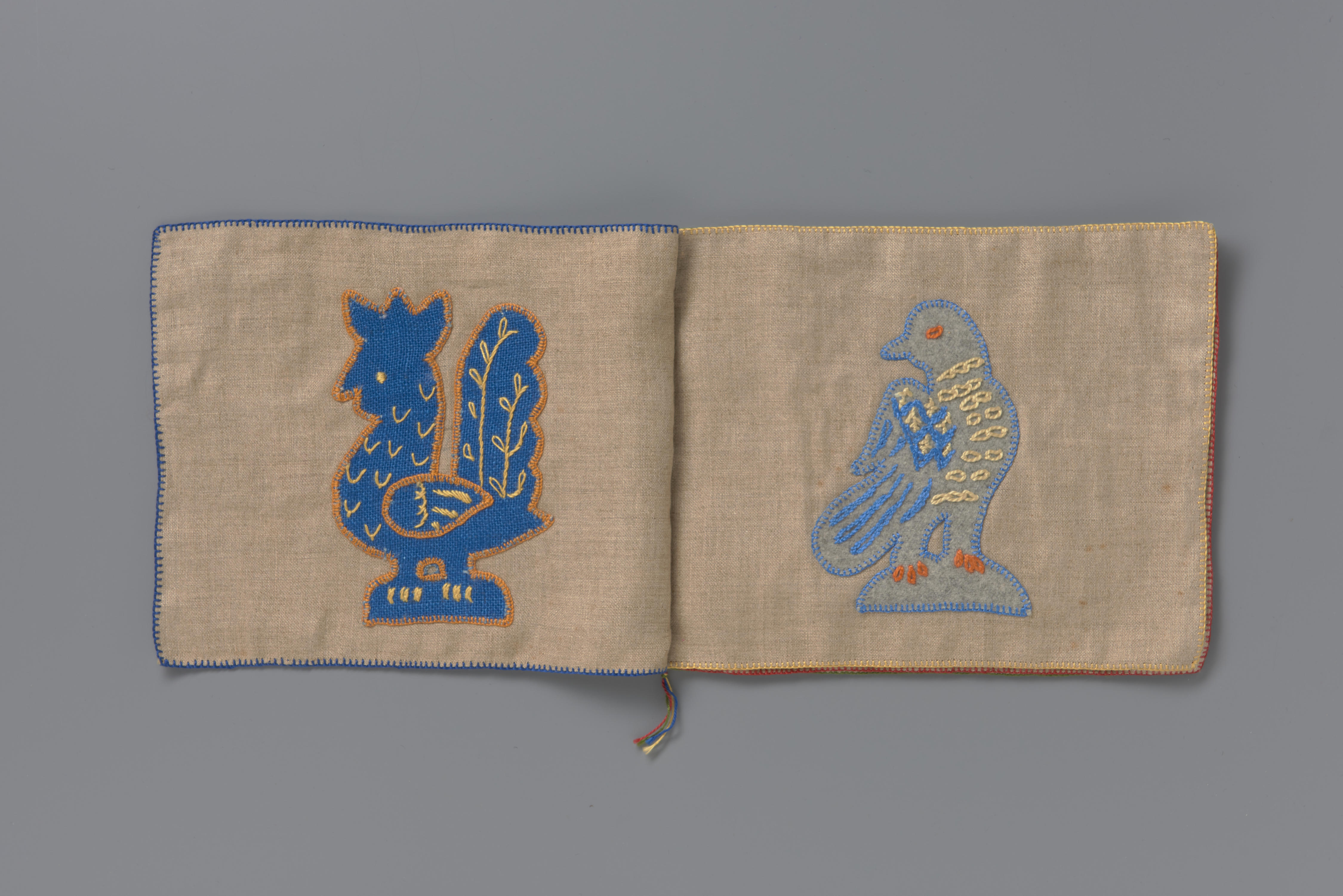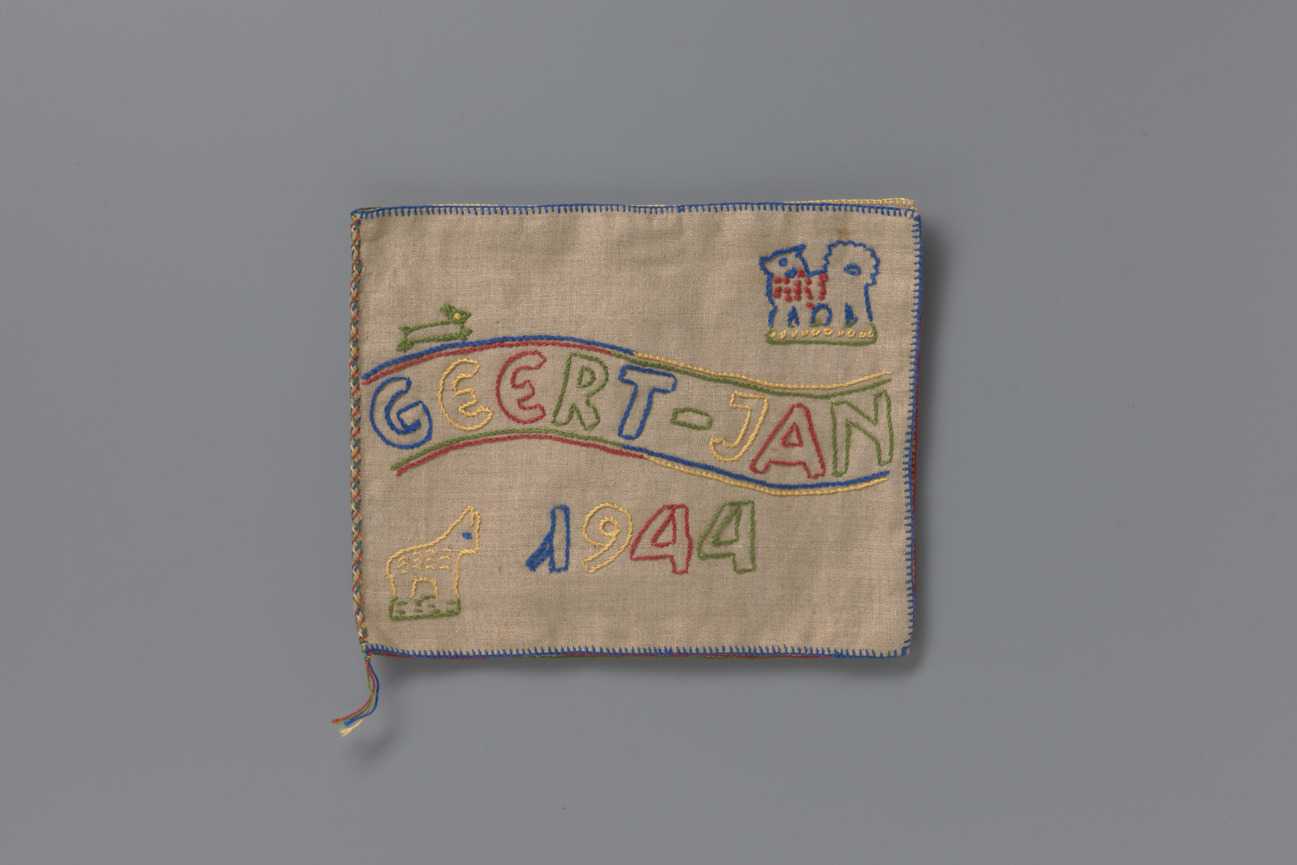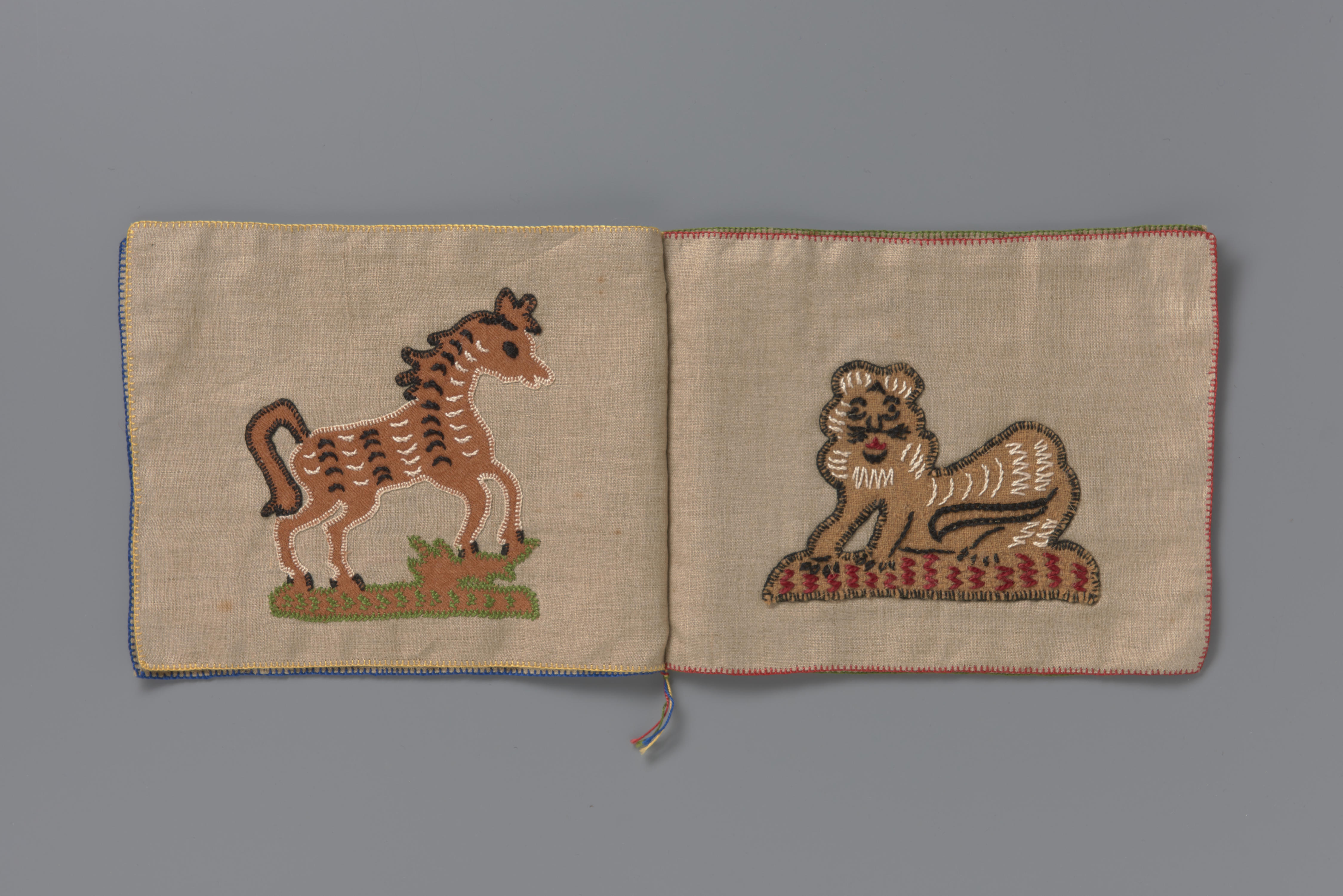 Prentenboek van ongebleekt fijn linnen met zes bladzijden met geappliqueerde koekplankfiguren. Voorop in vrij borduurwerk staan de naam Geert-Jan, het jaartal 1944 en geborduurde beestjes.