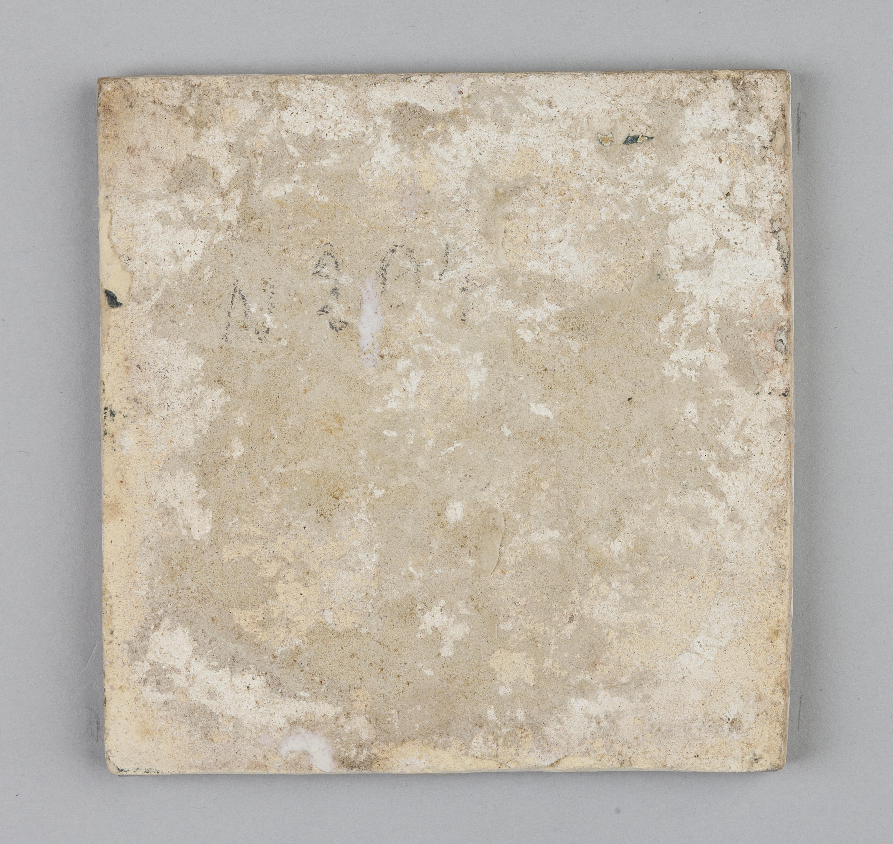 Historie in cirkel (Een engel deelt de vrouwen mee dat Jezus is opgestaan, Mat. 28:5, 6); mangaanpaars; hoekmotief: ossenkop. De twee vrouwen staan rechts op de tegel afgebeeld. Links zit de engel bij het graf.