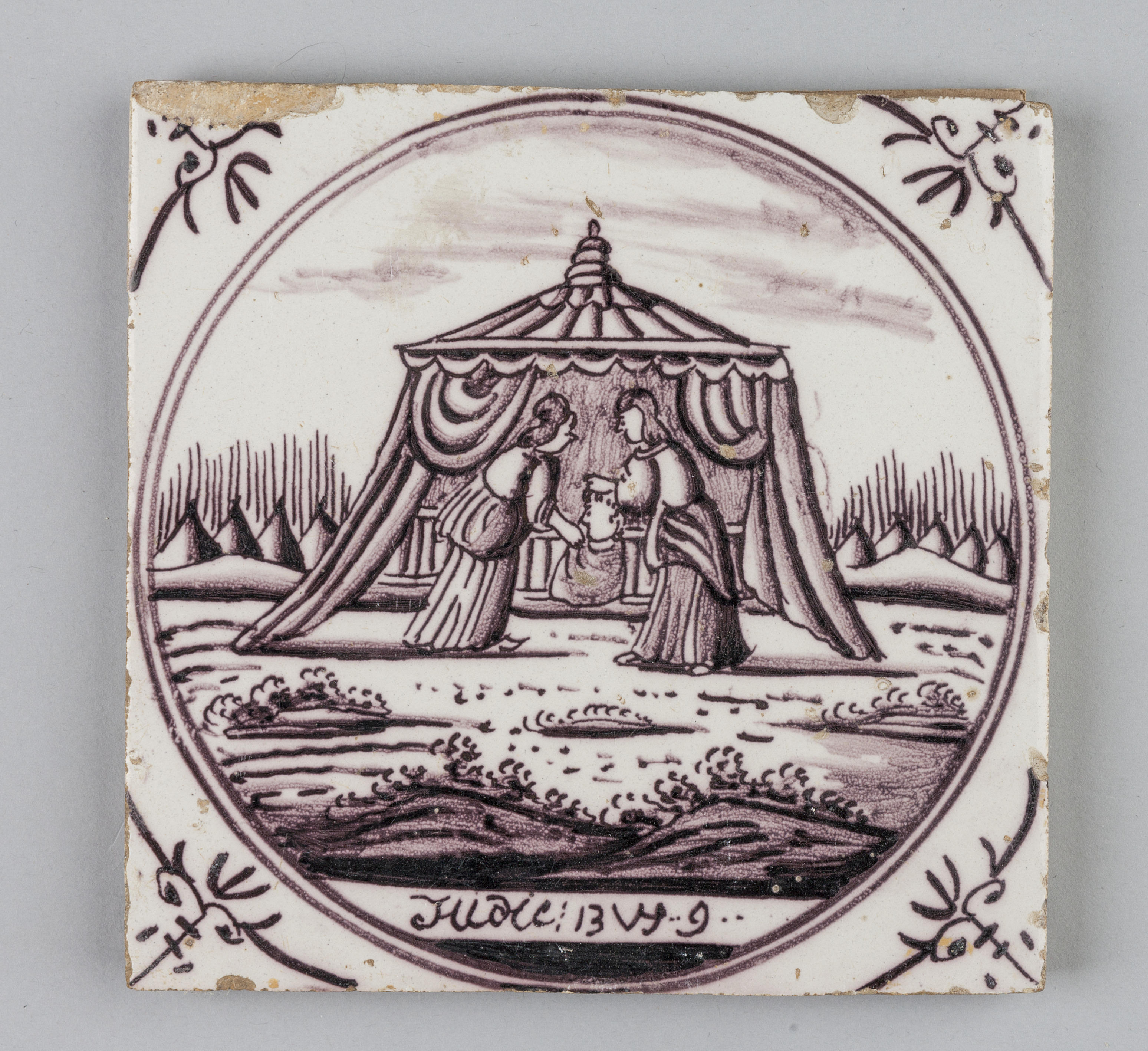 Historie in cirkel (Judith stopt het hoofd van Holofernes in een zak, Judit 13:9, 10a); mangaanpaars; hoekmotief: ossenkop. Op de afbeelding is te zien dat Judith en het dienstmeisje het hoofd in een zak stoppen. Achter hen staat een tent. Het onderschrift luidt: ‘Judit : 13 V 7 – 9’.