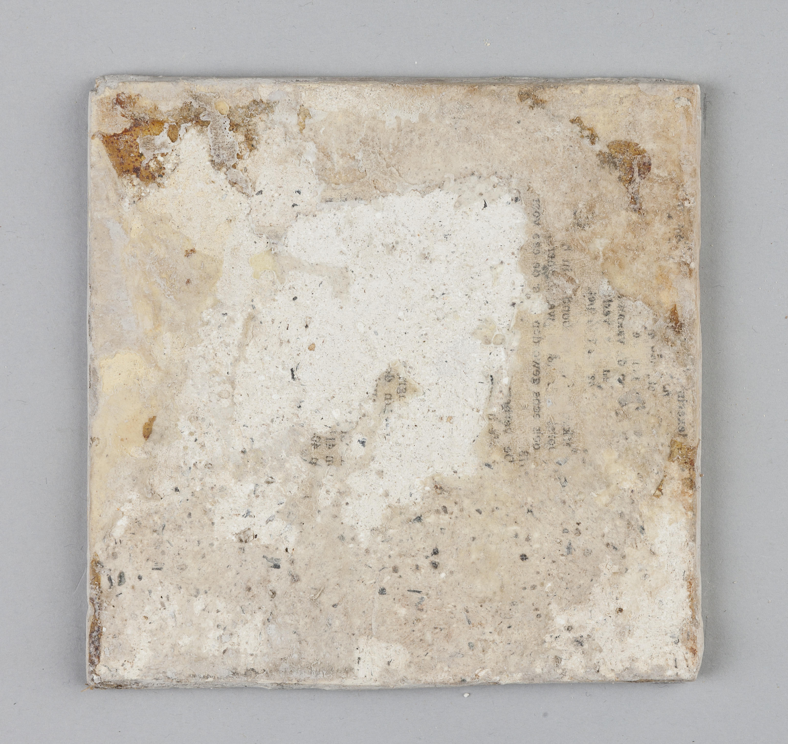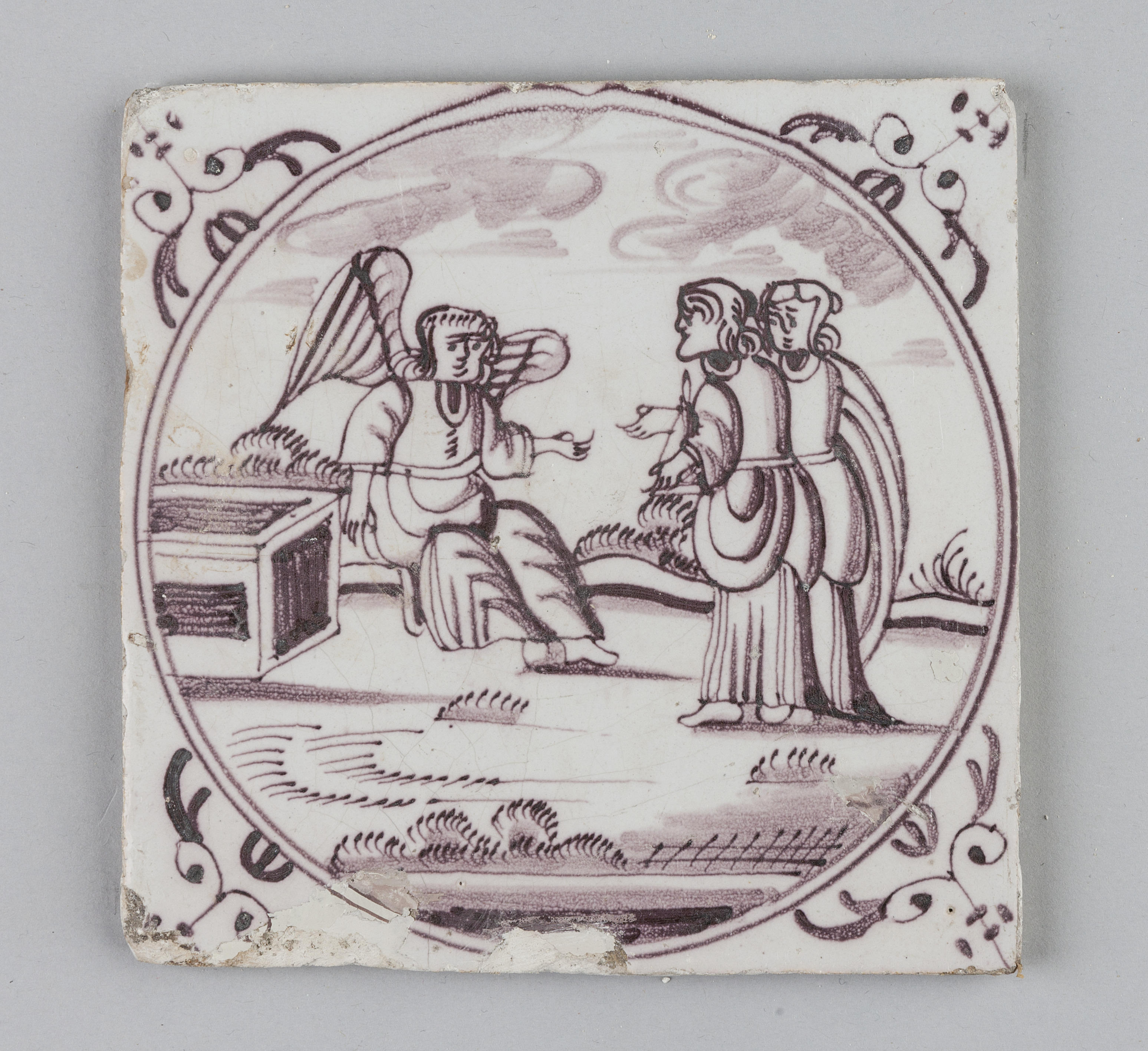 Historie in cirkel (Een engel deelt de vrouwen mee dat Jezus is opgestaan, Mat. 28:5, 6); mangaanpaars; hoekmotief: ossenkop. De twee vrouwen staan rechts op de tegel afgebeeld. Links zit de engel bij het graf.