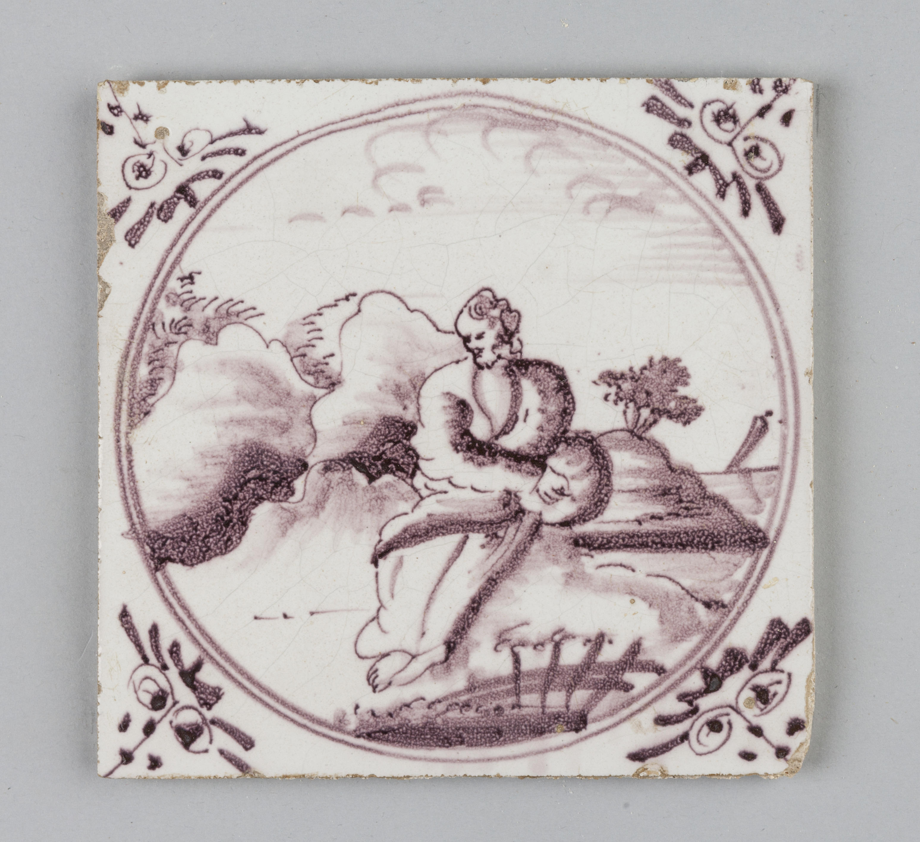Historie in cirkel met een afbeelding van een zittende man; mangaanpaars; hoekmotief: ossenkop.