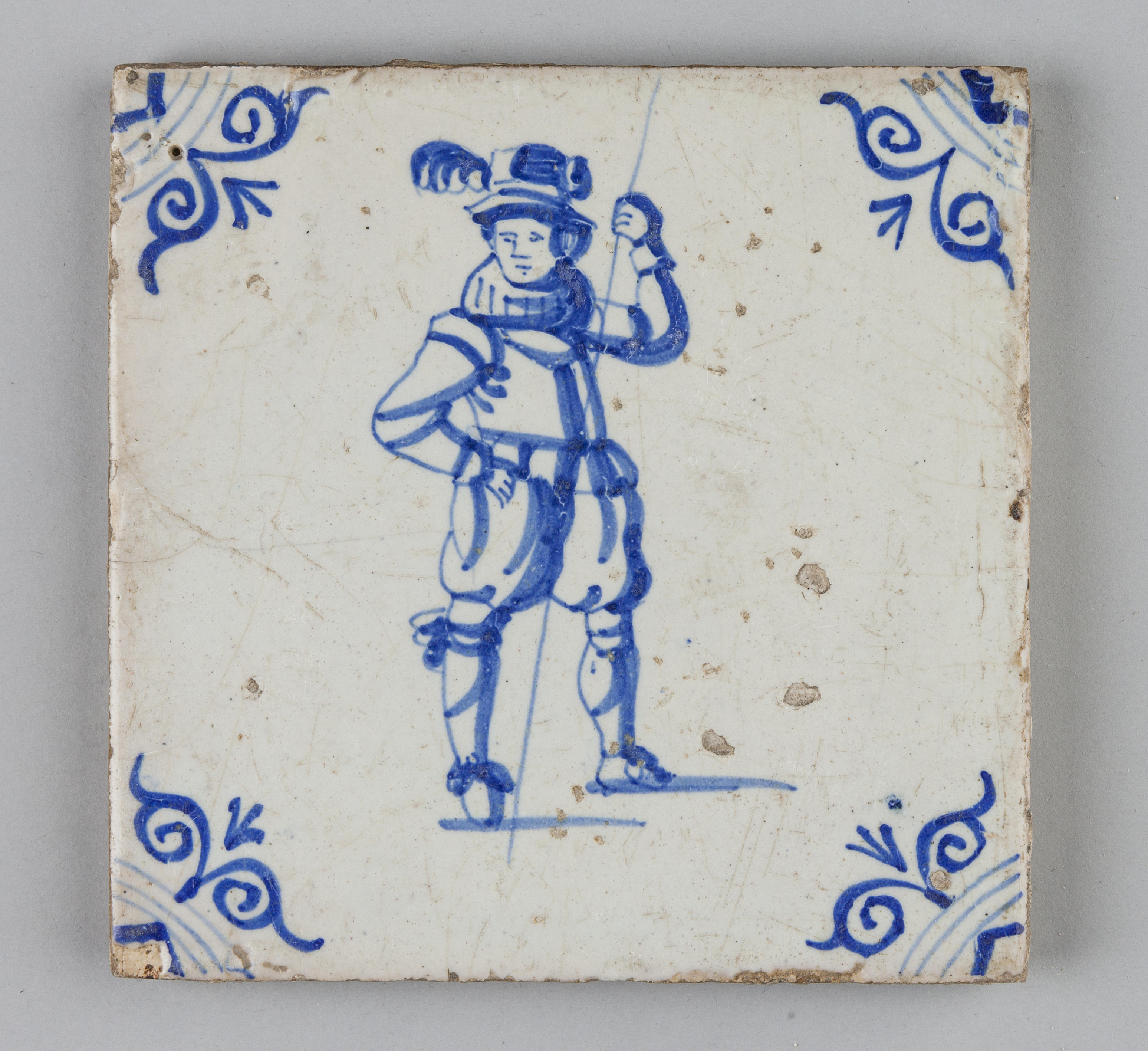 Wandtegel met een afbeelding van een man met een stok(?) in zijn hand, 1625–1700
