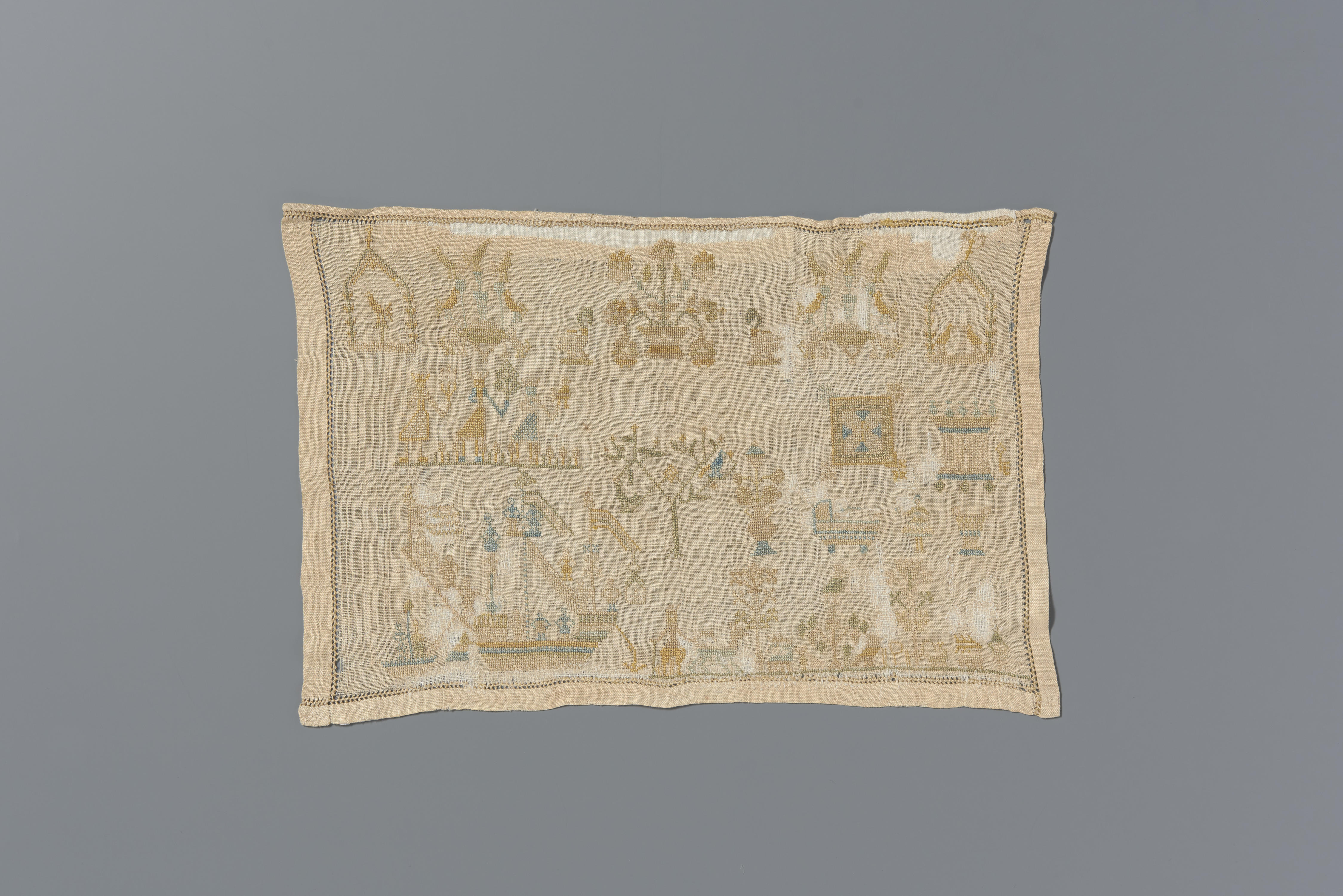 Merklap van crèmekleurig linnen met verschillende kruisstekenmotieven, zoals een pot met bloemen, vogels, een boom, een bloemenvaas, een wieg en een schip.