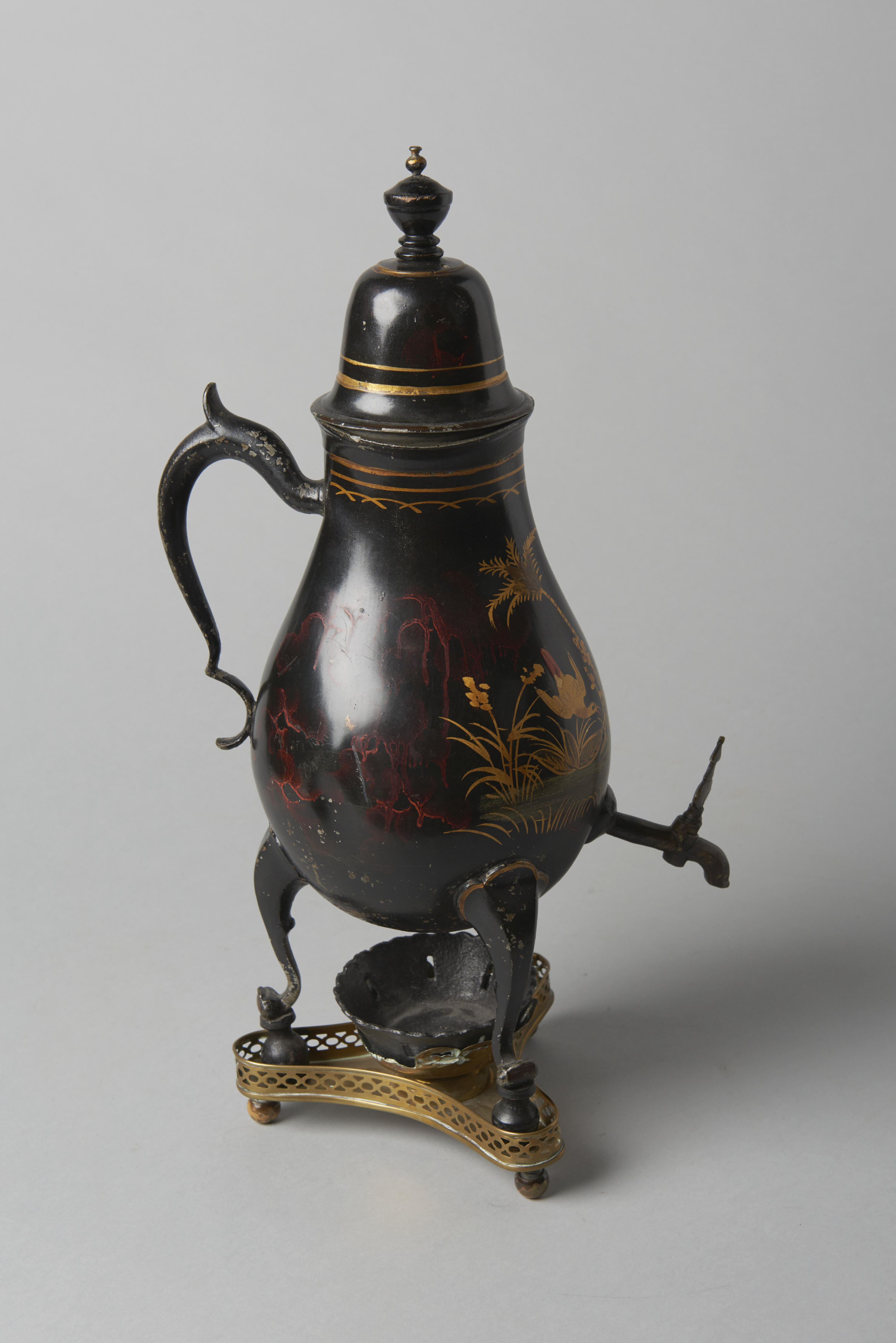 Tinnen kraantjeskan op een driepotige onderzet. Aan de binnenkant van de kan zijn namen gekrast, maar deze zijn onleesbaar. Op de voorzijde is een voorstelling van twee vogels in het riet te zien.