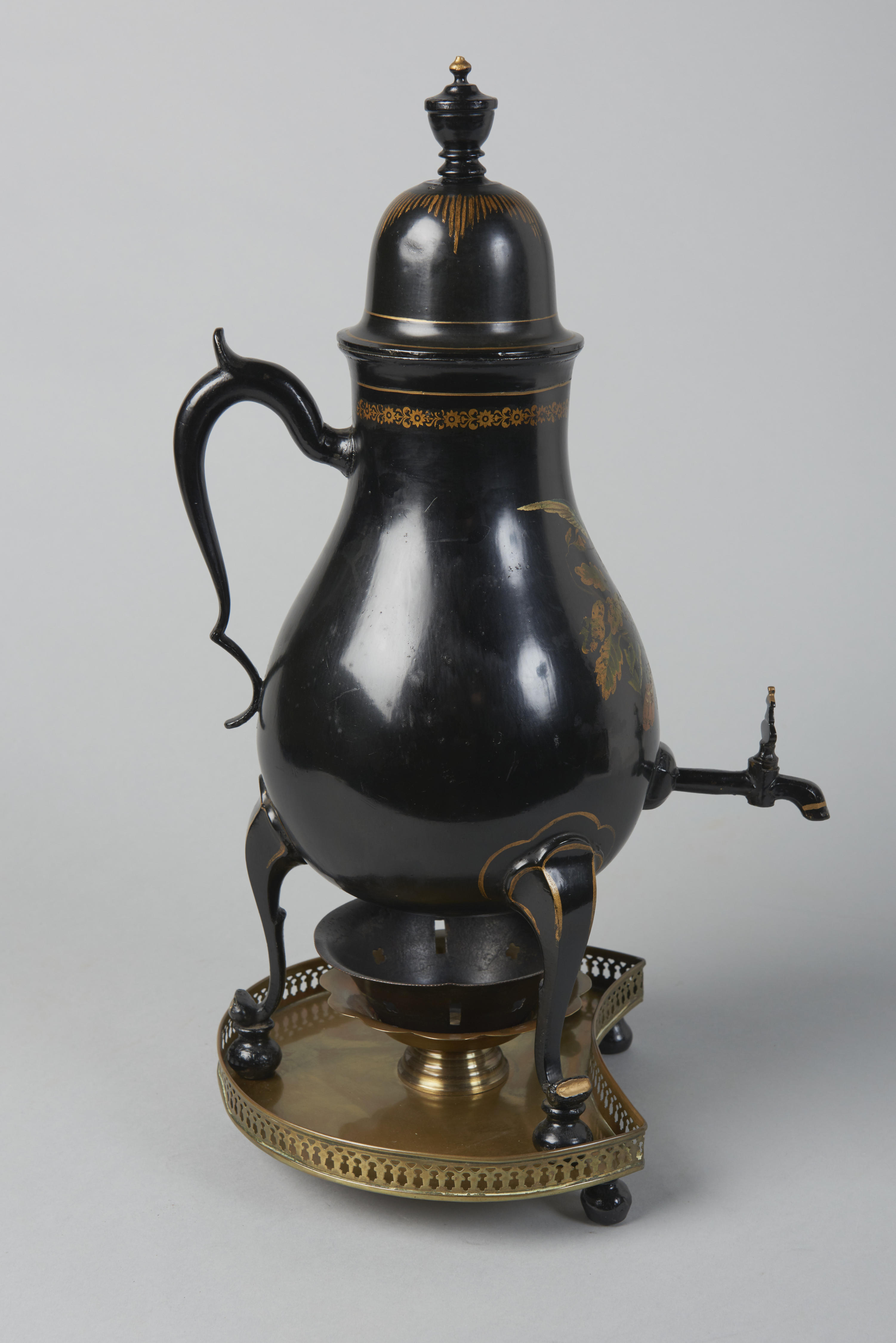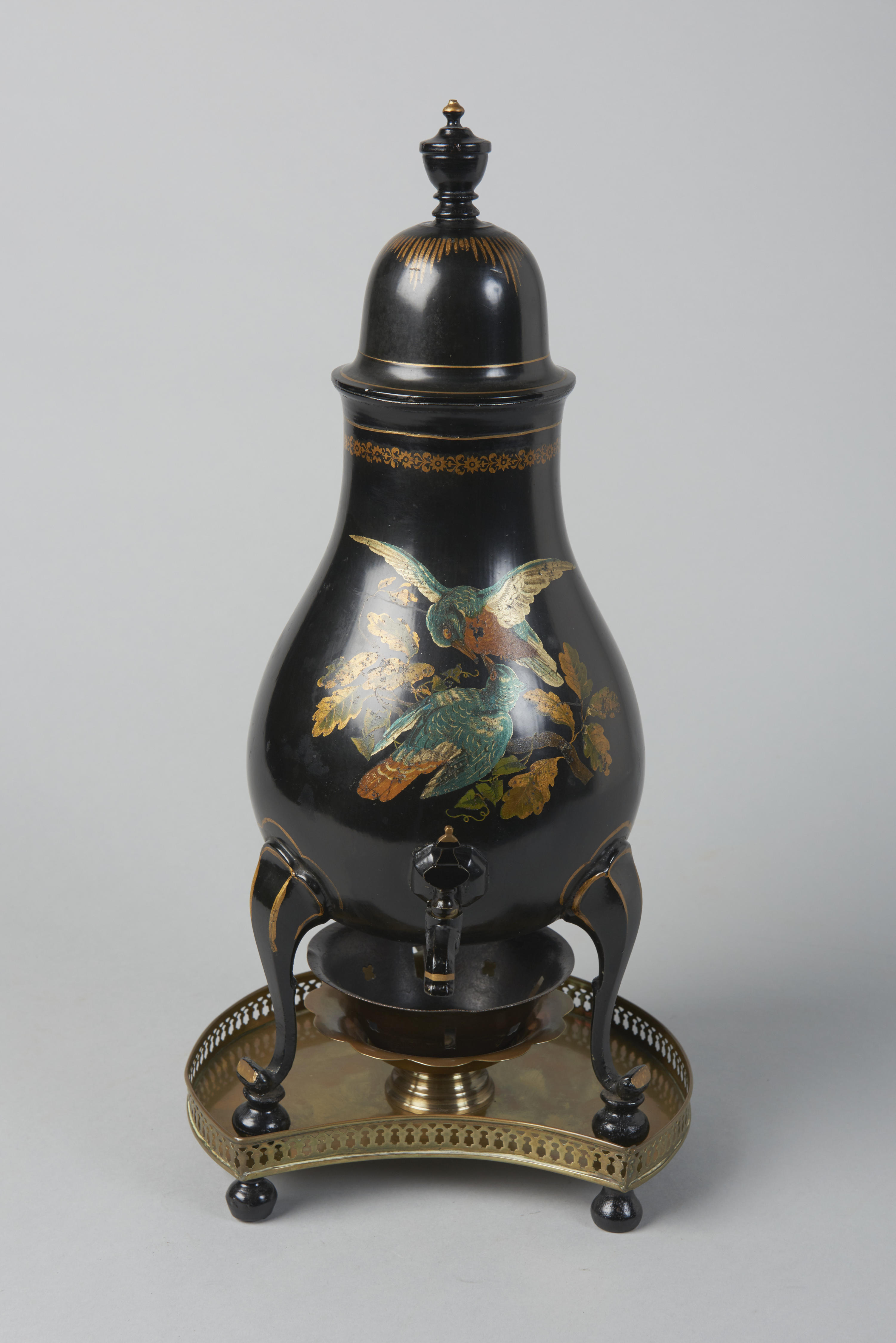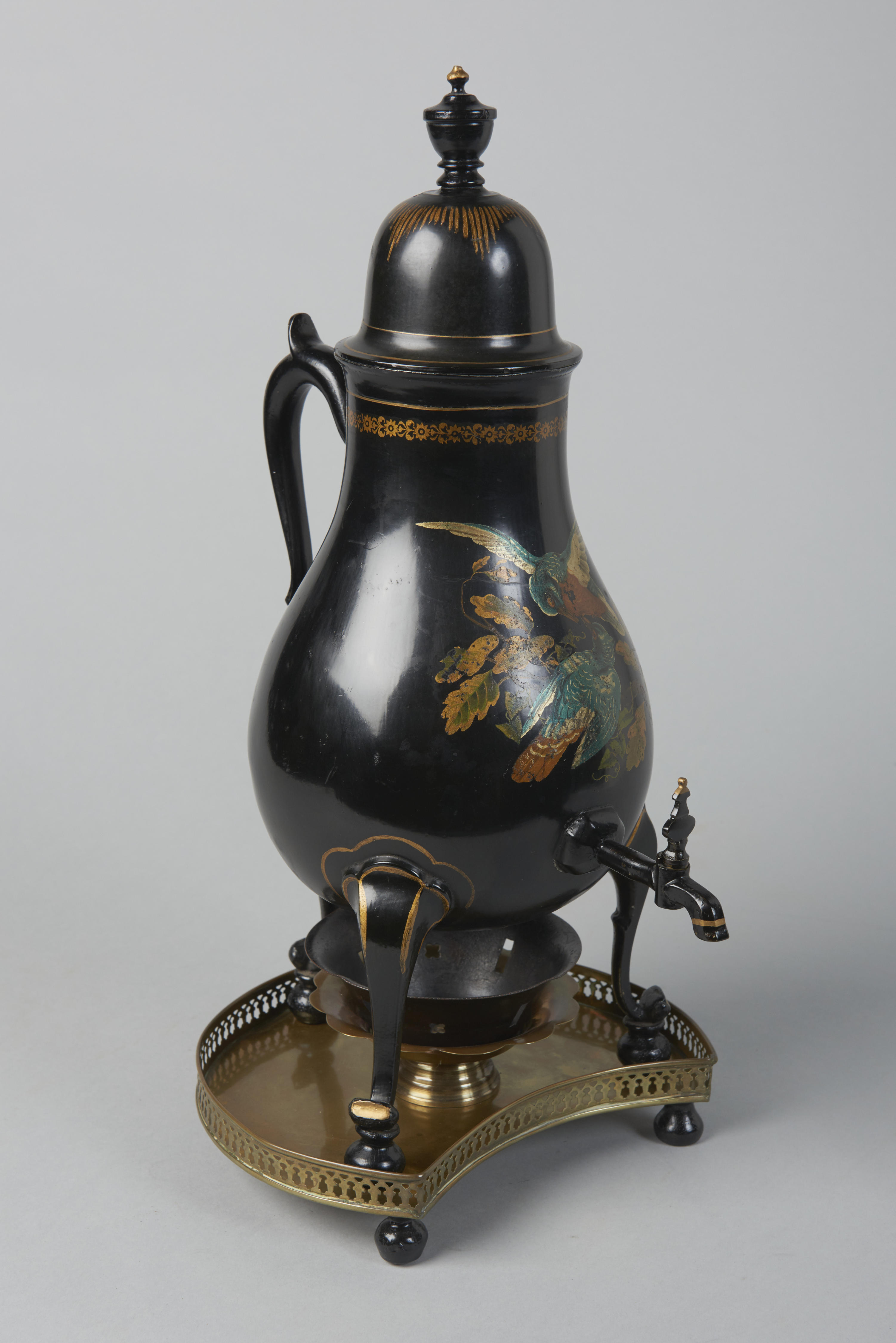 Tinnen kraantjeskan met driepotige onderzet. Aan de onderkant van de kan is met stift geschreven: 'H. v. Vrey. Loenen a/d Vecht'. De bodem is vervangen, waardoor merken ontbreken. Op de voorzijde van de kan is een negentiende-eeuwse voorstelling van twee vogels op een tak te zien.