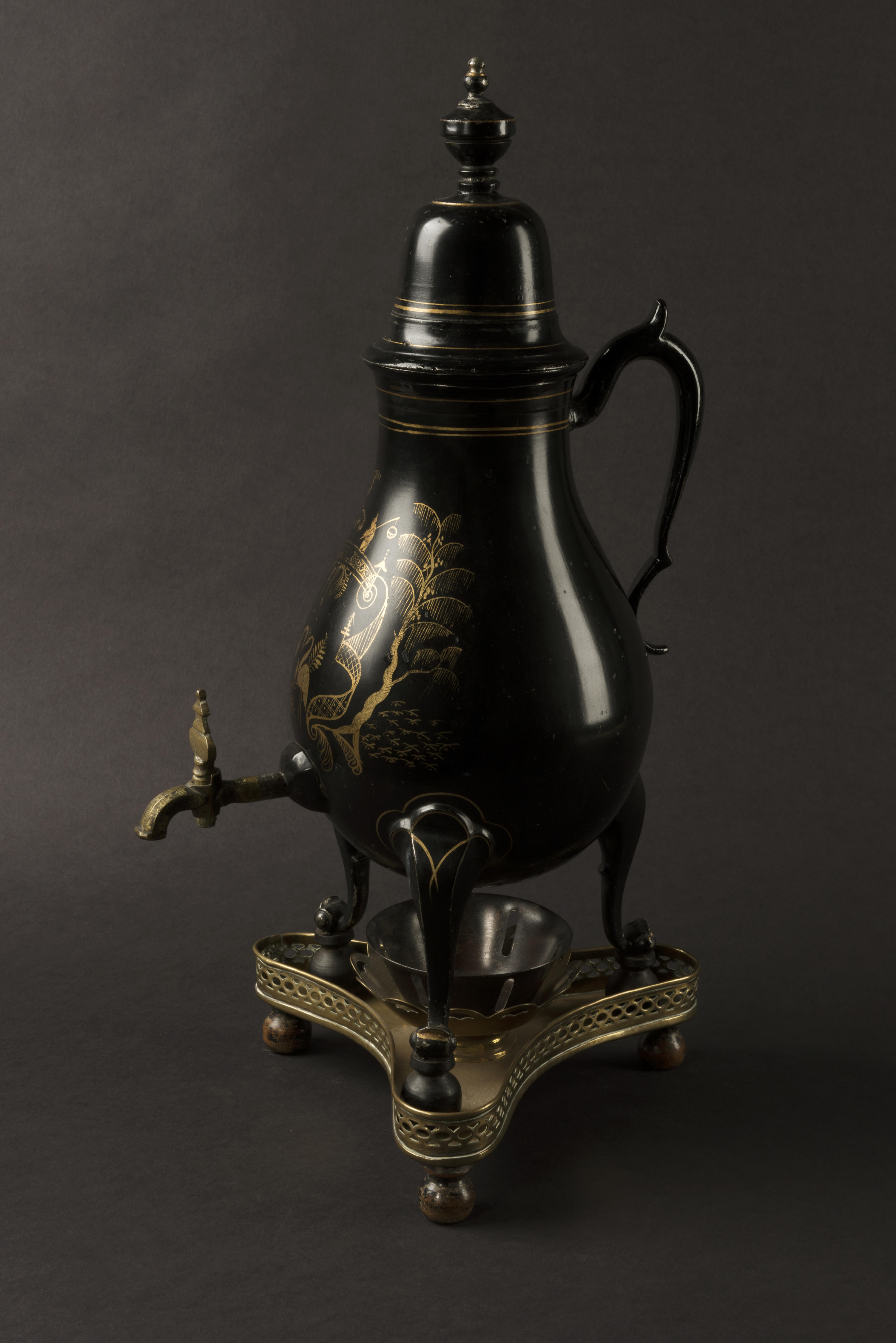 Tinnen kraantjeskan met driepotige onderzet. In het deksel is het woord ‘Chinees’ en de letter ‘C’ gegraveerd. In de bodem prijkt het stempel: ‘A. Huising – Groningen’. De waarschijnlijk originele zwarte lak is gedecoreerd met chinoiserieën.