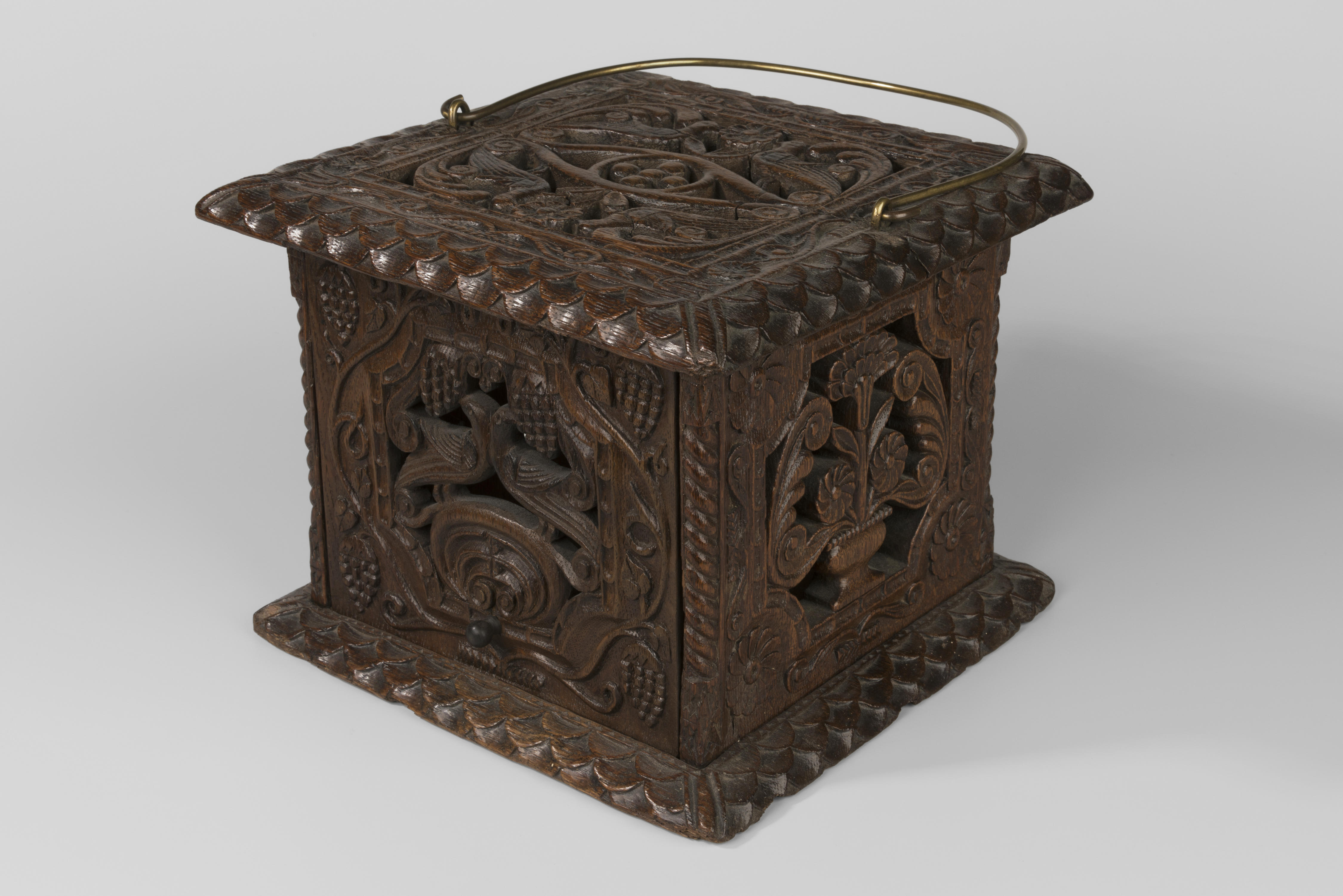 Eikenhouten stoof aan een messing beugel, rondom gedecoreerd met snijwerk. Het snijwerk bestaat op de voor- en achterzijde uit twee naar elkaar gekeerde vogels die aan druiventrossen pikken. Op beide zijkanten staat een vaas met bloemen. De randen zijn voorzien van een visschubmotief.