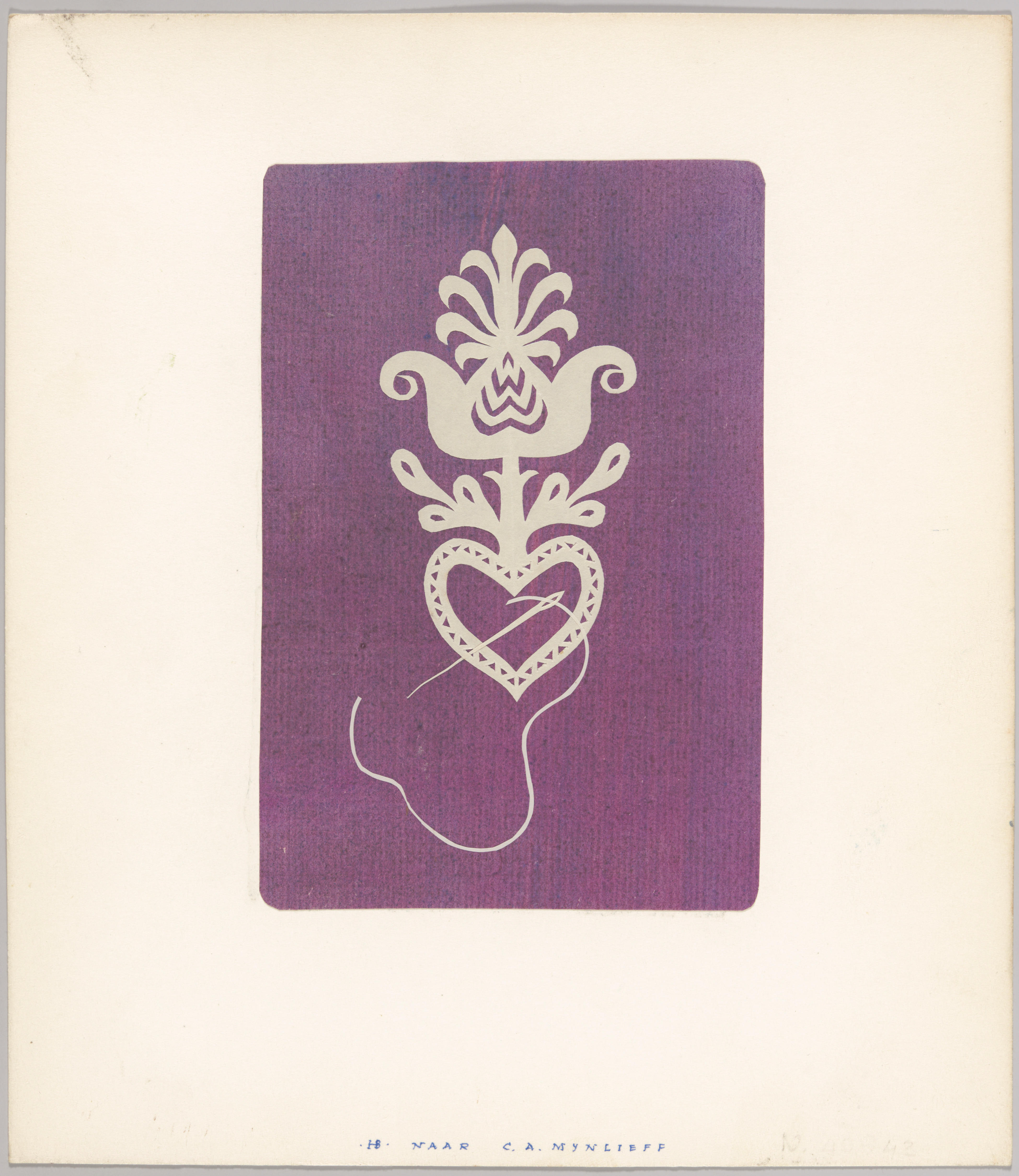 Knipwerk van Hil Bottema, naar de knipstijl van To Mijnlieff. Het knipsel verbeeldt een tulp op een hart. Door het hart zit een naald met draad.