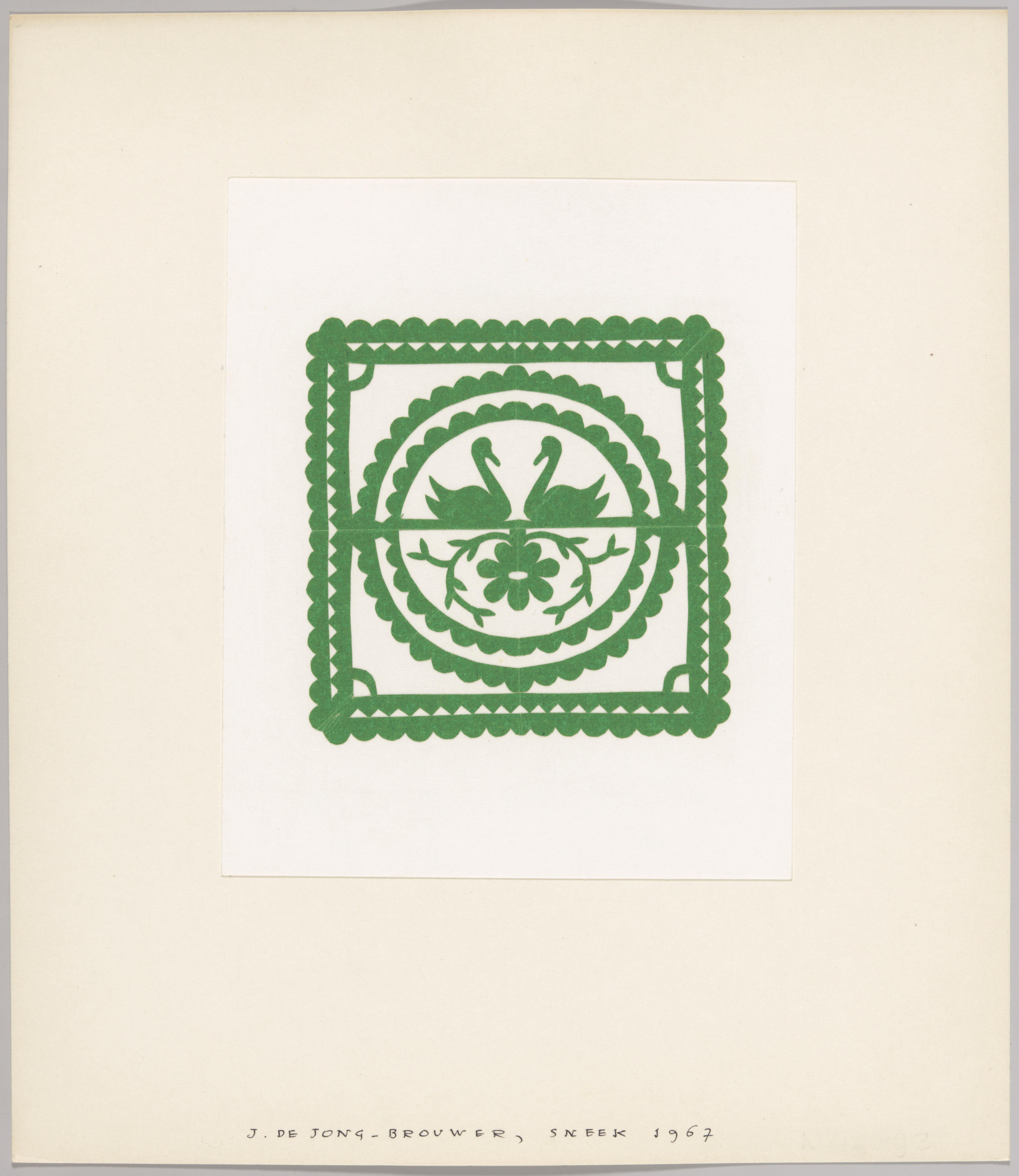Knipwerk uit groen papier van twee zwanen en een bloem in een kader met kartelranden.