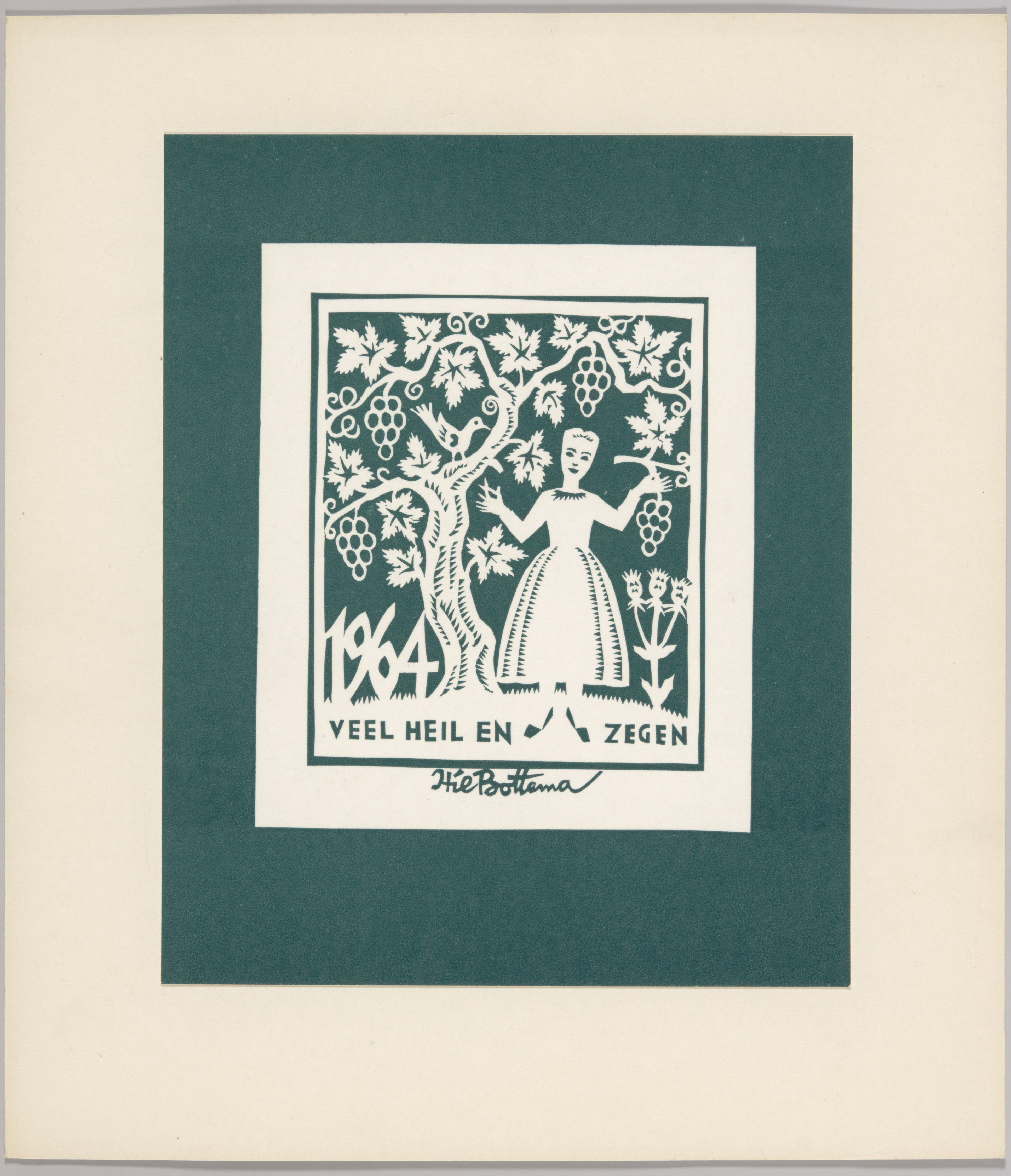 Gedrukte kaart van een knipwerk met een vrouw die met haar schaar een tros druiven van een boom afknipt. De tekst luidt: '1964 Veel Heil en Zegen'.