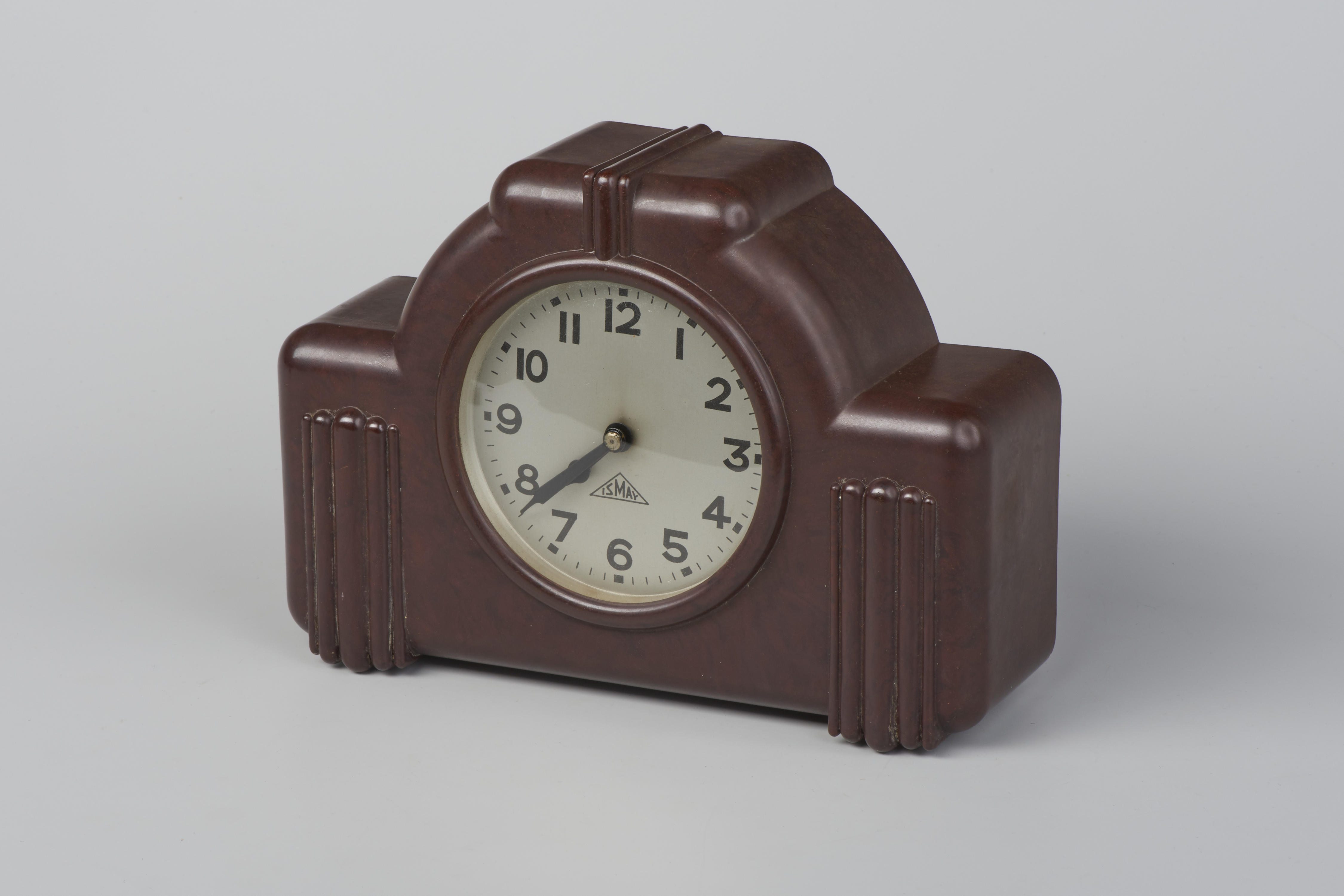 Bakelieten klok van het merk Ismay, gemaakt in Engeland.