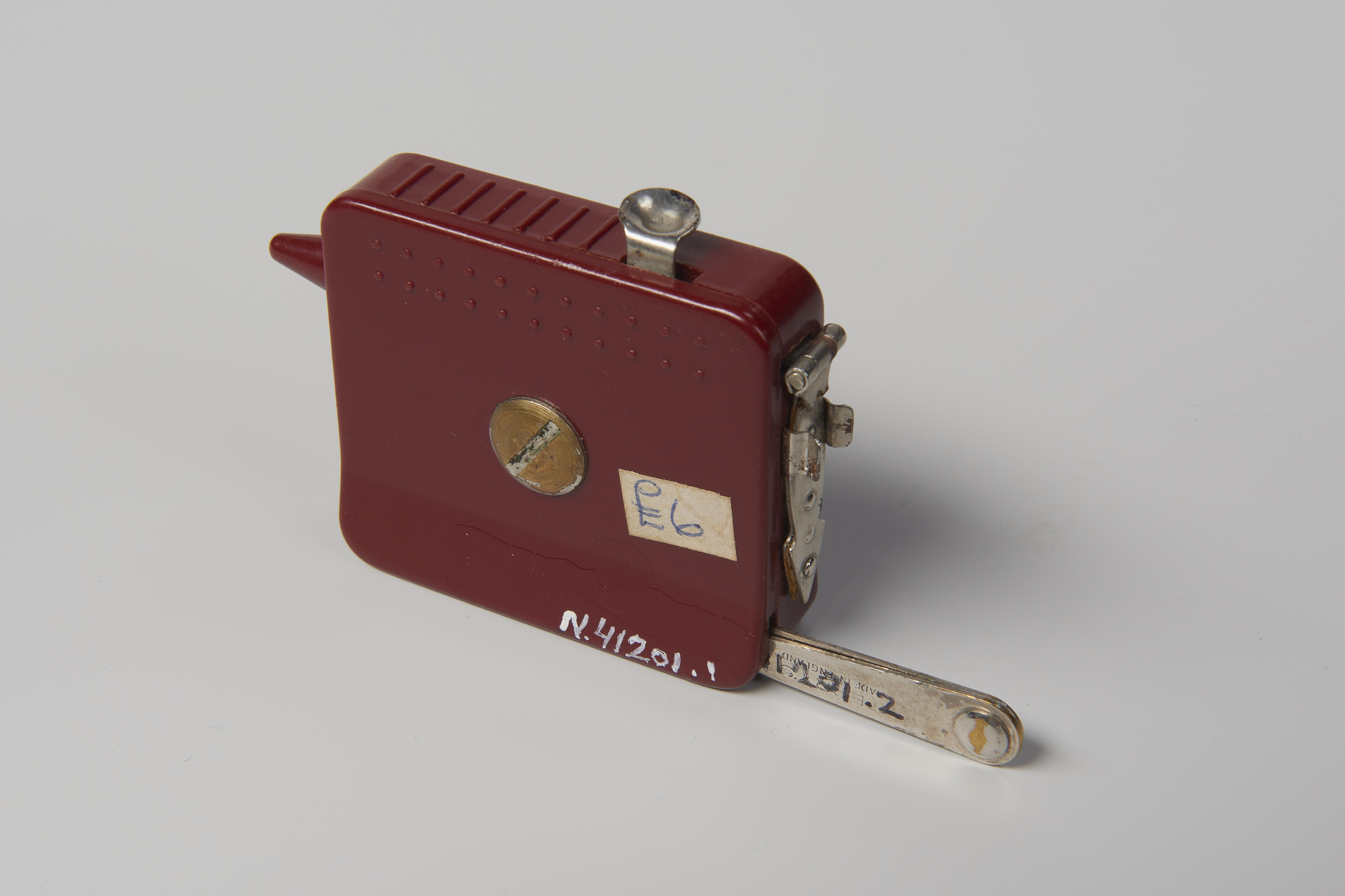 Rood bakelieten meetlint, gemaakt door Herbert Terry & Sons in Engeland. Dit meetlint heeft geen schaalverdeling en is bedoeld om tijdens het spel bowls de afstand te meten van een bowl tot het kleine balletje (jack). Het voorwerp heeft een krompasser voor het meten van de afstand tussen twee heel dicht bij elkaar liggende ballen.