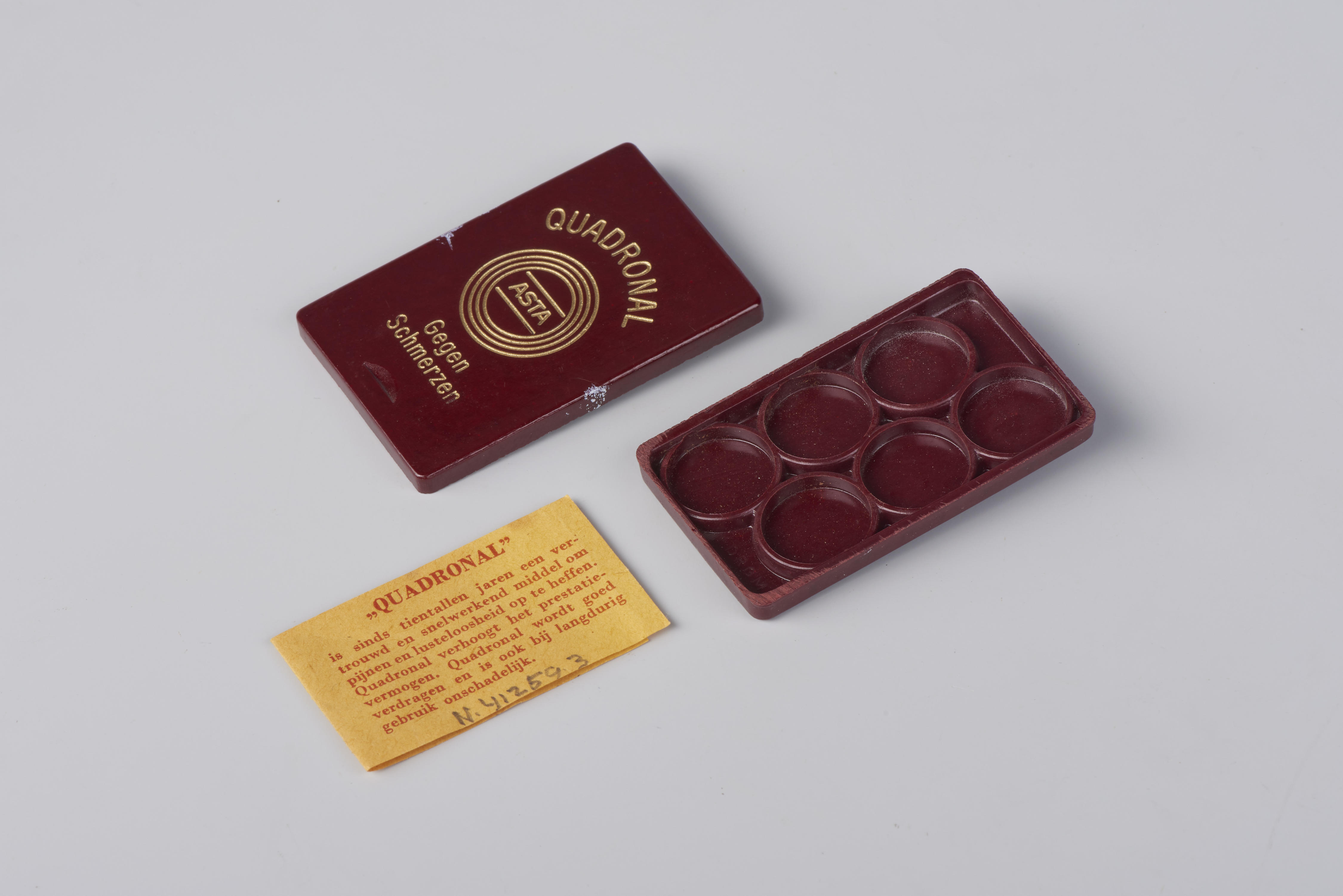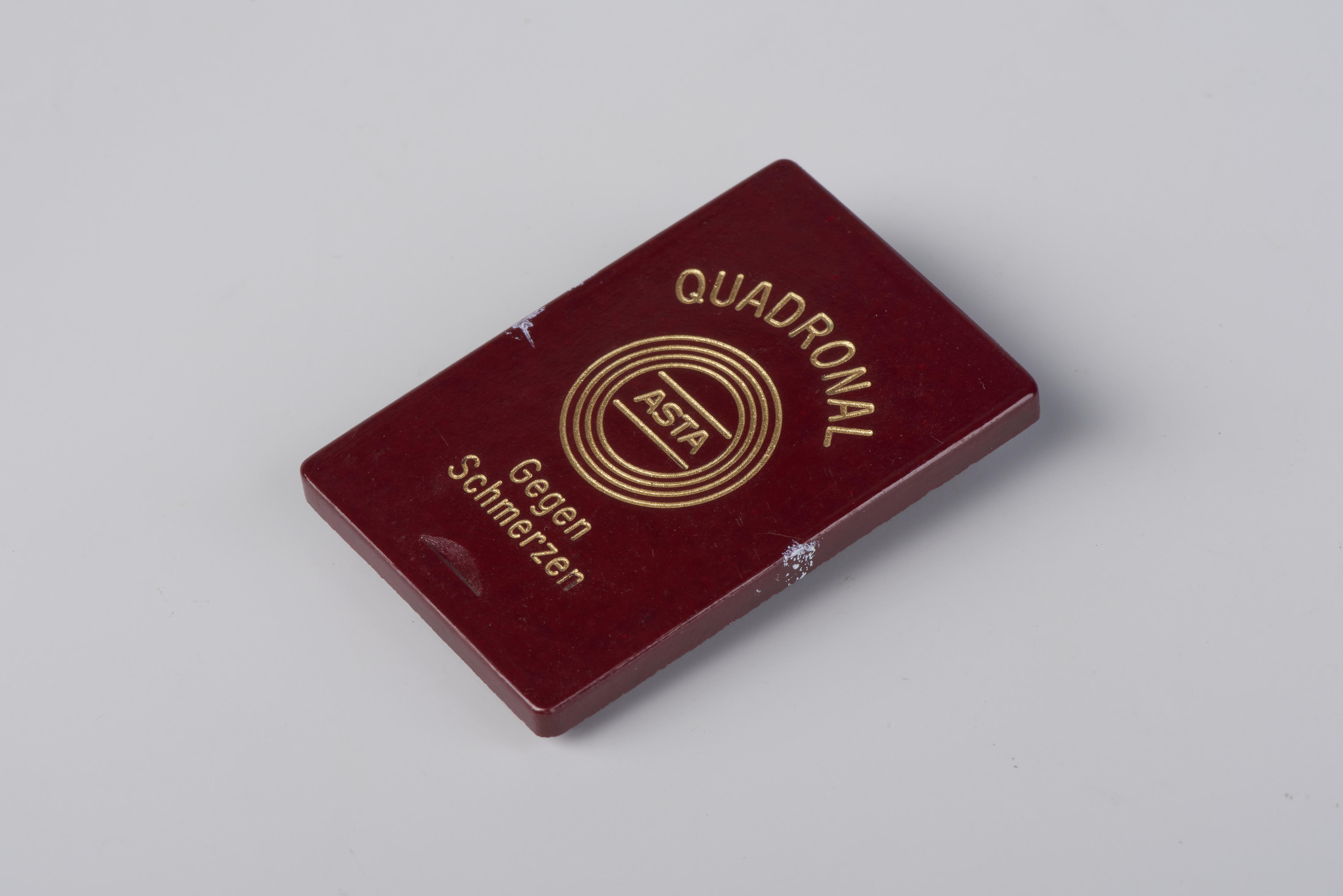 Bakelieten pillendoosje voor 'Quadronal', gemaakt in Duitsland. Bij het doosje zit een bijsluiter in het Nederlands.