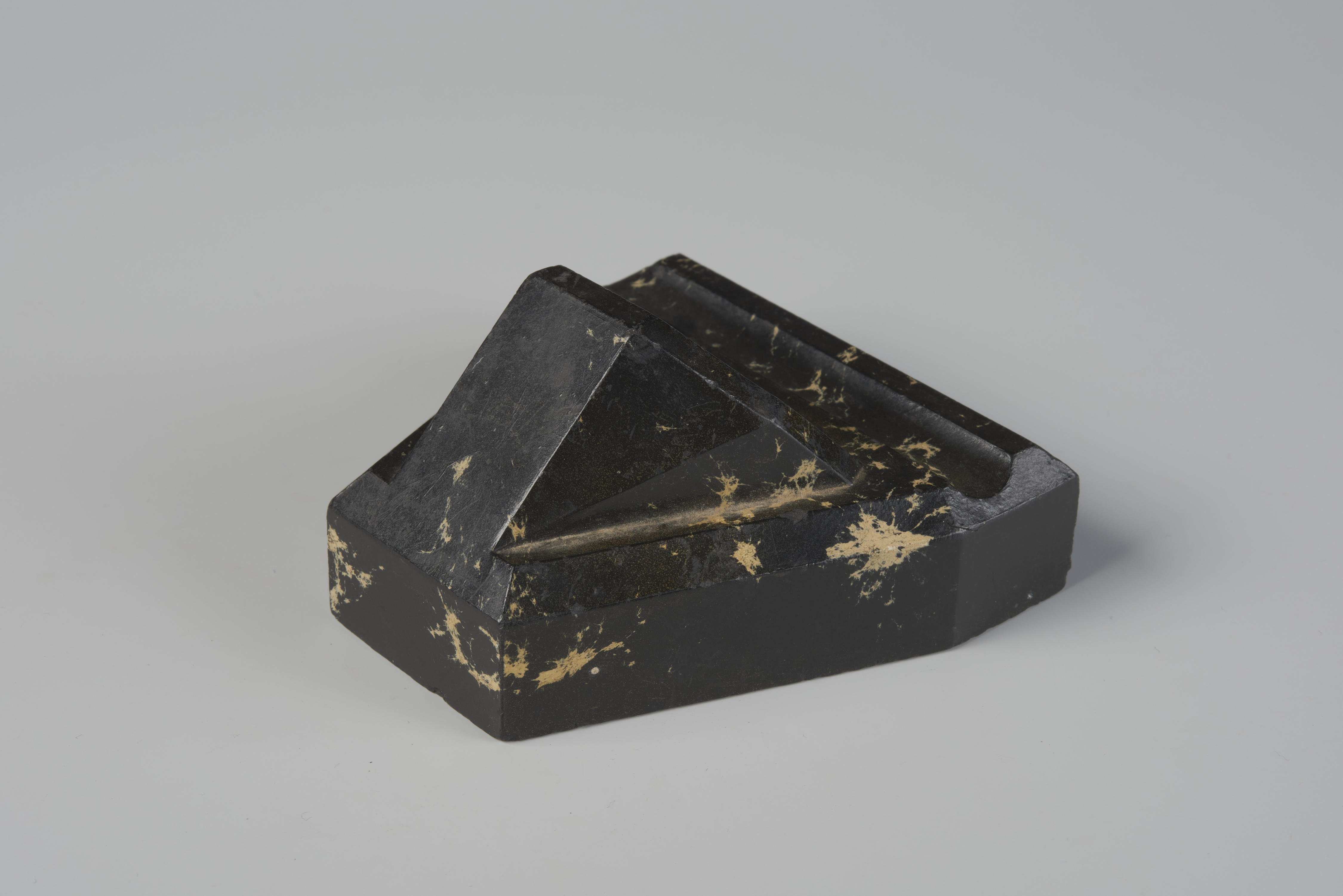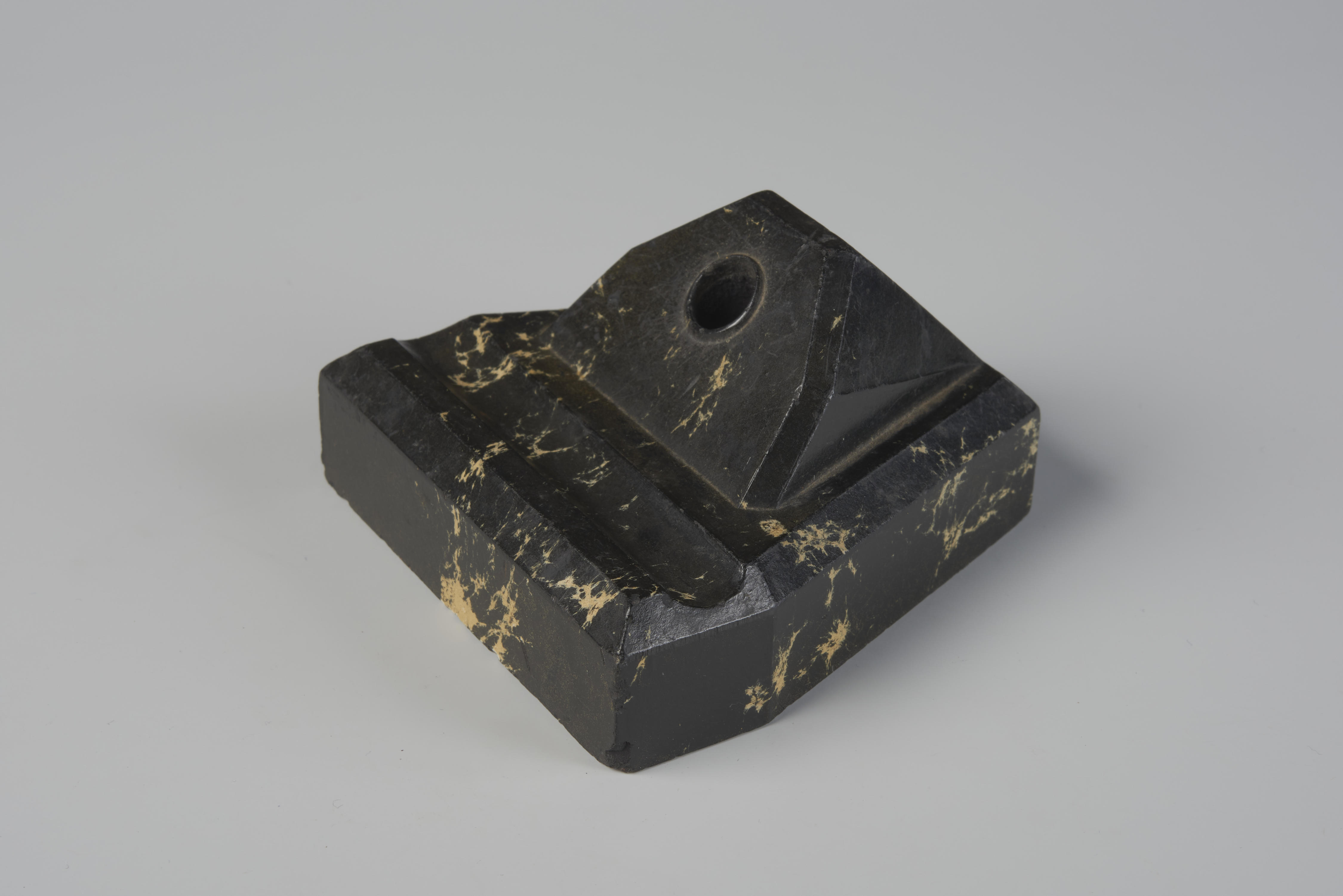 Bakelieten pennenhouder. Op de onderzijde staat het opschrift: 'Stylo-Bloc "Gold Starry"'. Deze pennenhouder is een voorbeeld van bakeliet waarbij natuursteen werd geïmiteerd. Dit werd gedaan door in de matrijs witte kunststof te stoppen en daarna bakeliet toe te voegen.