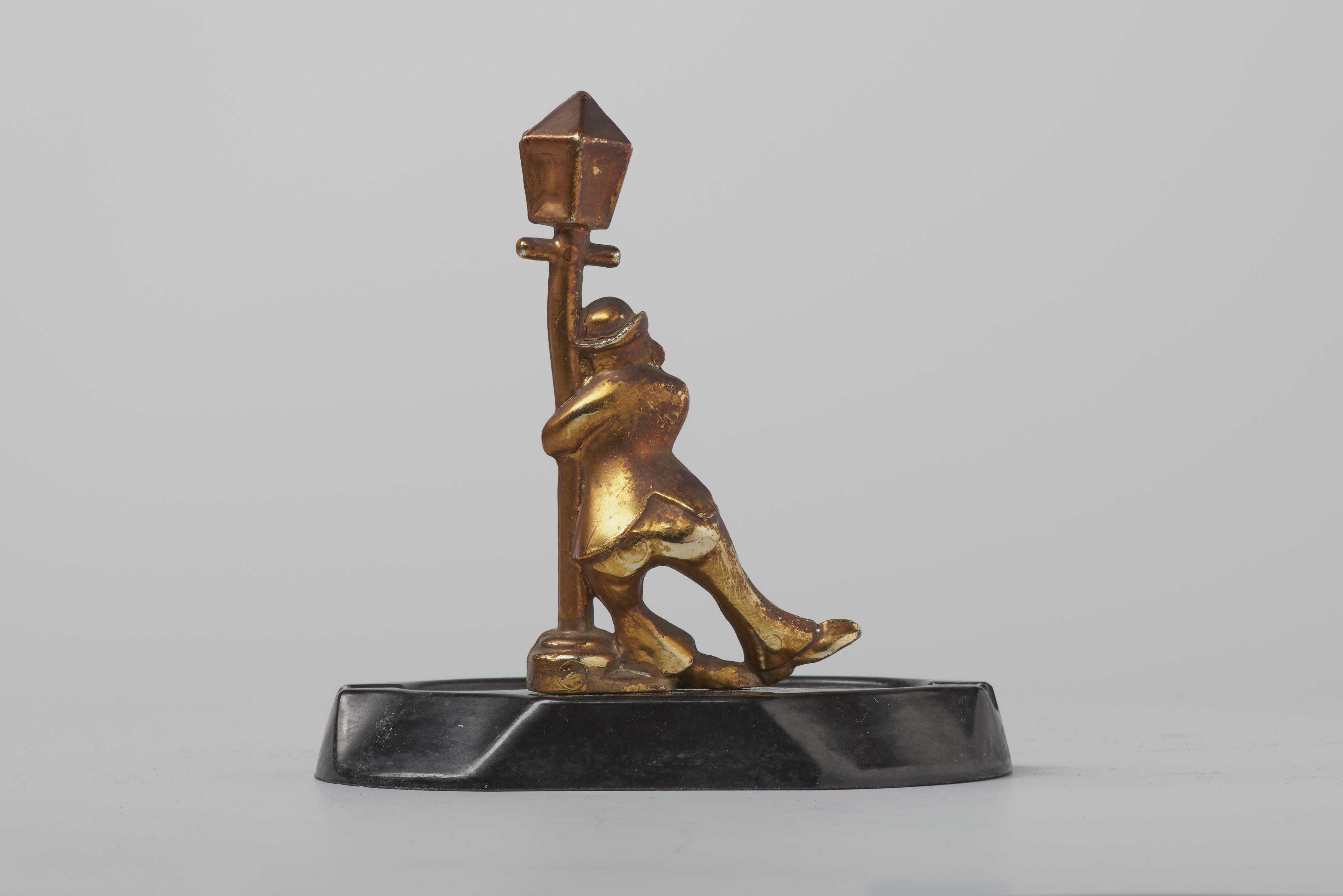 Bakelieten asbak met metalen figuur in de vorm van een man die tegen een lantaarnpaal leunt. Op de asbak staat de tekst: 'Oh, What a Beautiful Evenin'!!'. De asbak is gemaakt door Selcol in Engeland.
