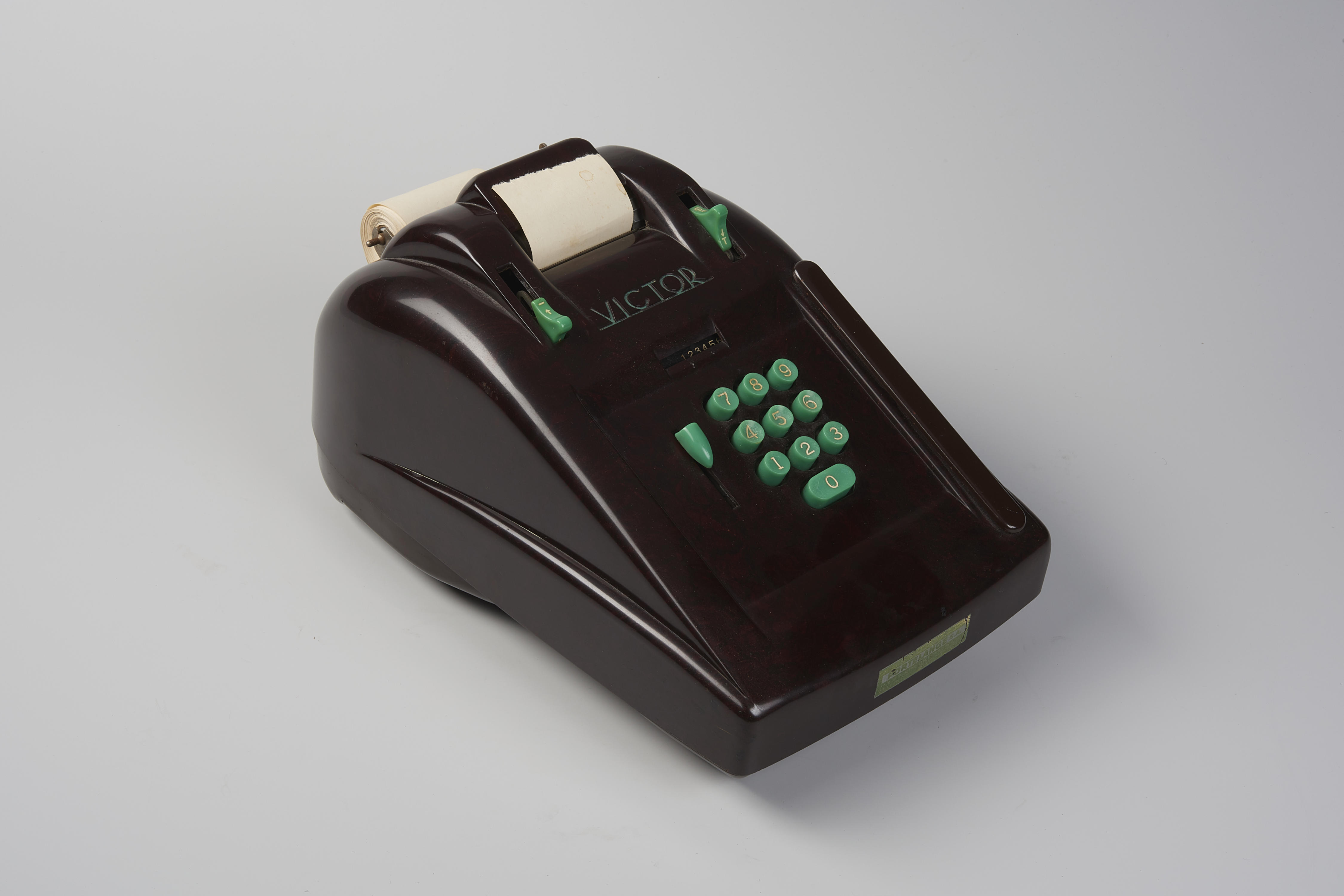 Elektrische bakelieten rekenmachine die kan optellen en aftrekken, gemaakt door Victor Adding Machine in Chicago, Verenigde Staten.