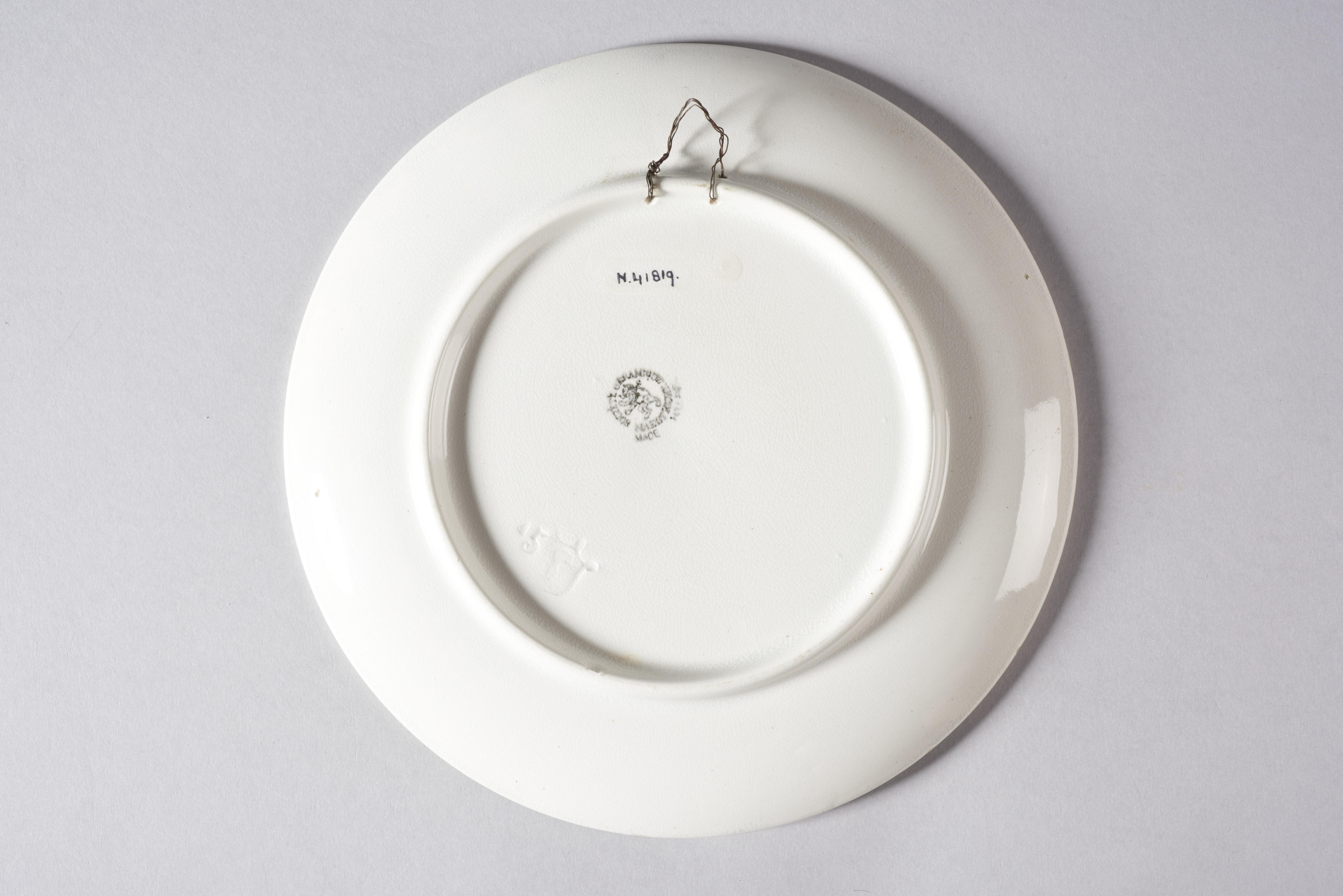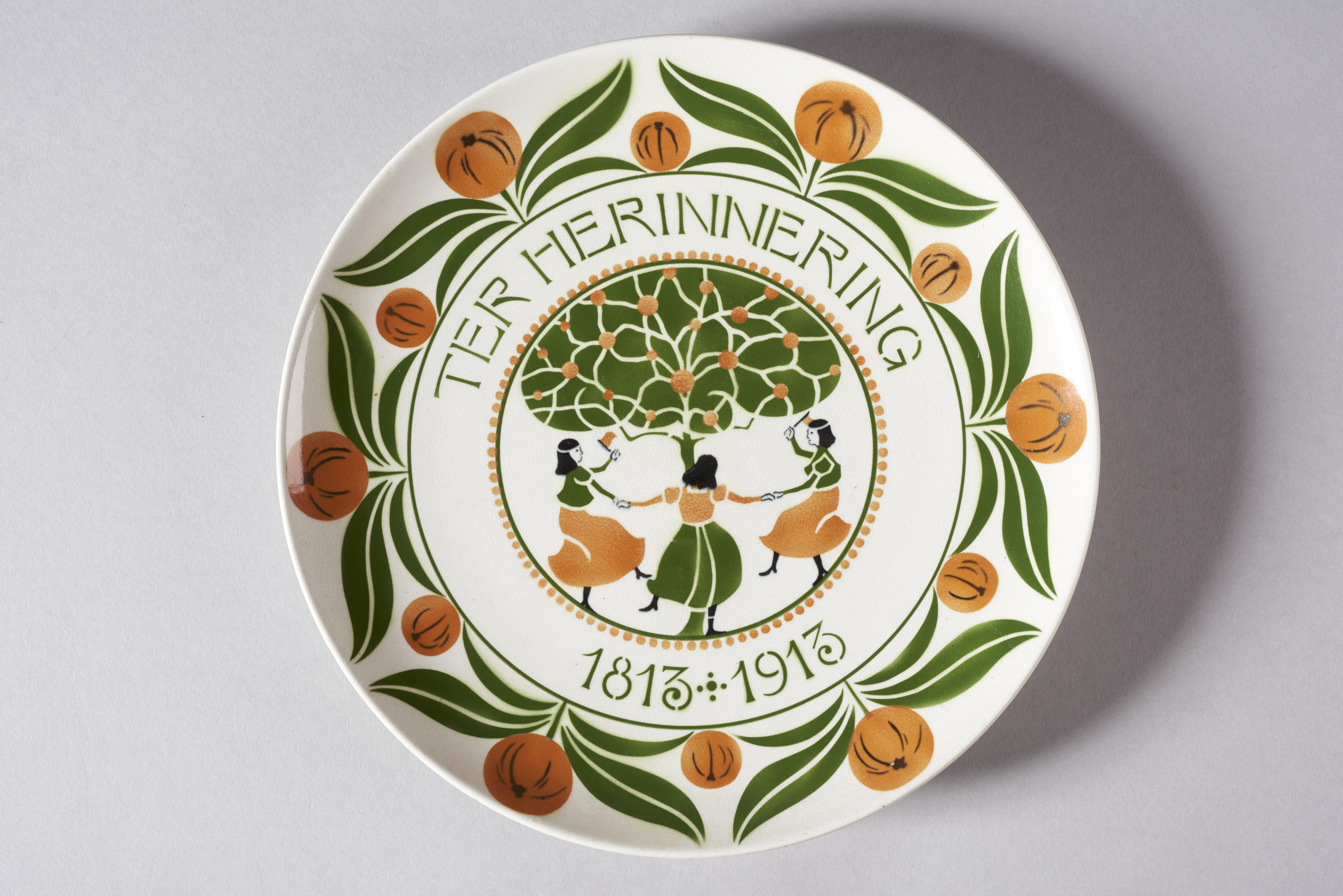 Crèmekleurig bord met een randversiering van oranjeappeltjes met bladmotief. In het midden dansen drie vrouwen om de oranjeboom. Rondom het midden staat de tekst: ‘TER HERINNERING 1813-1913’.