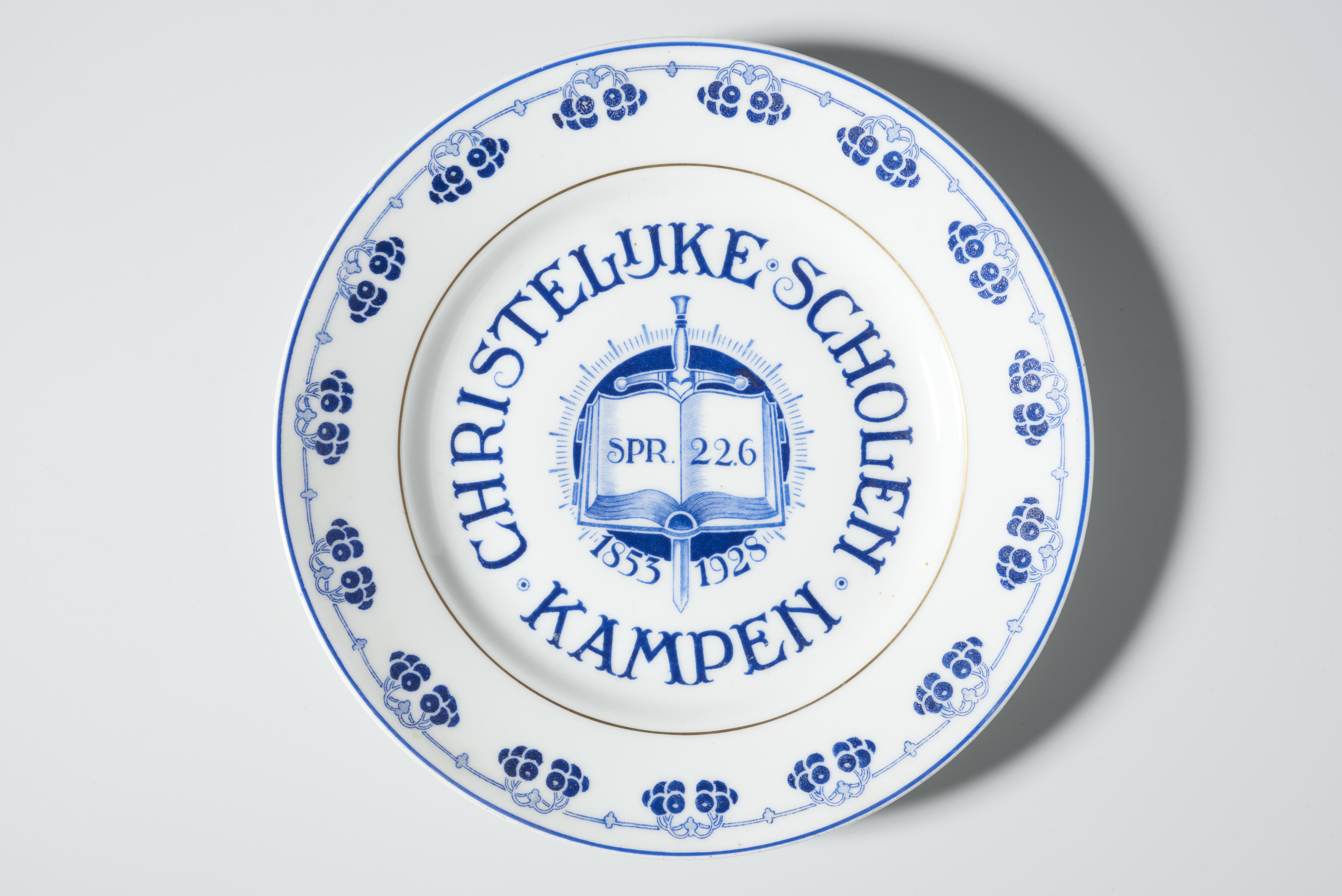 Blauw beschilderd gedenkbord ter gelegenheid van een 75-jarig jubileum. In het midden van het bord staat een afbeelding van een opengeslagen bijbel op een zwaard met daarin over de twee bladzijden de tekst ‘SPR. 22.6’. Onder de bijbel staan de jaartallen ‘1853’ en ‘1928’. Rondom de afbeelding luidt het opschrift: ‘CHRISTELIJKE SCHOLEN KAMPEN’.